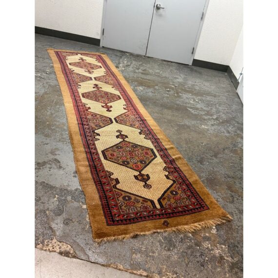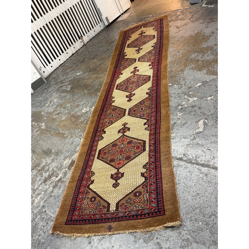 Design Plus Gallery presents a 3ft 3in 13ft 9in Serab Runner Carpet. This rug is from a corner of the NW Persian Heriz triangle, this town and surrounding villages specializing in wool foundation, robustly woven runner with important camel tan to brown tones. It is presented with multiple cartouche field with medallions; geometric drawing. The is from the Early 20th century and has maintained its vibrant colors and construction for over a hundred years with many more decades in it. Is in good condition.