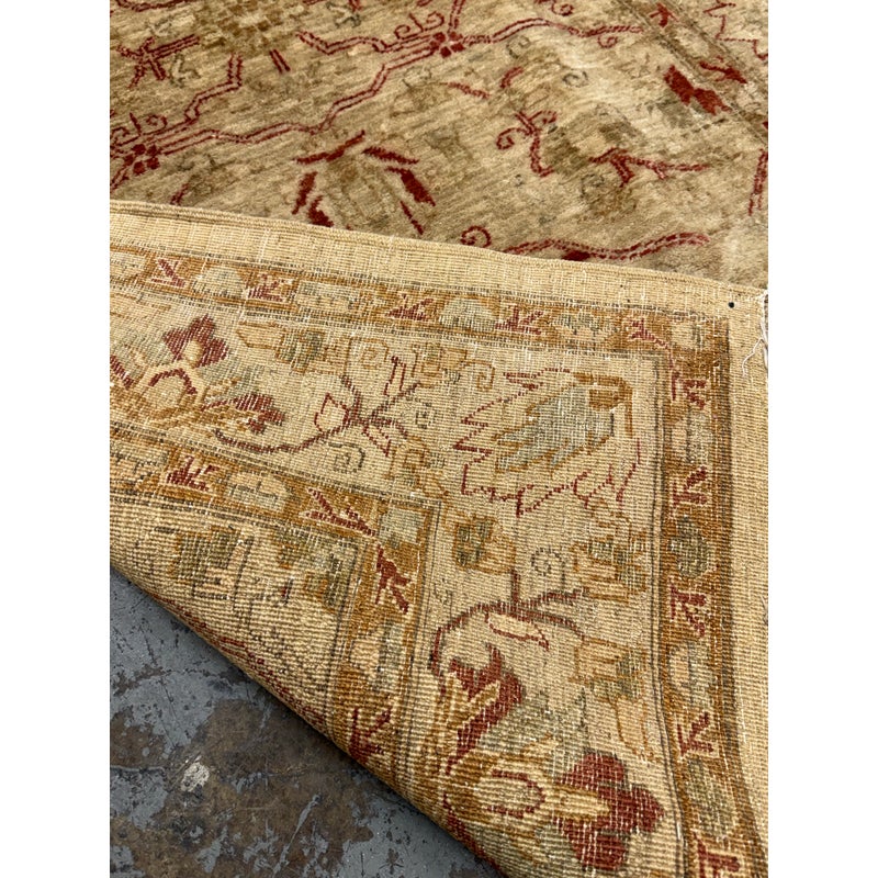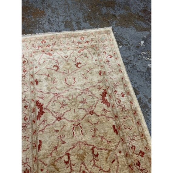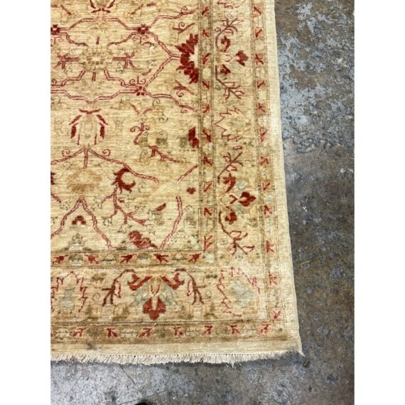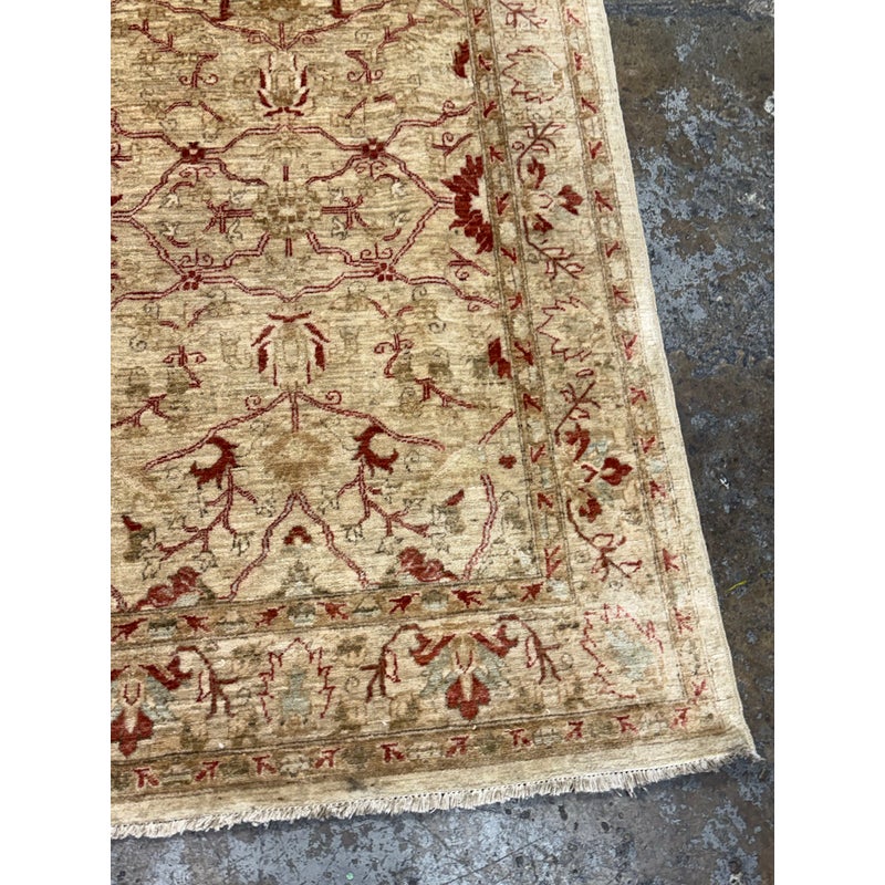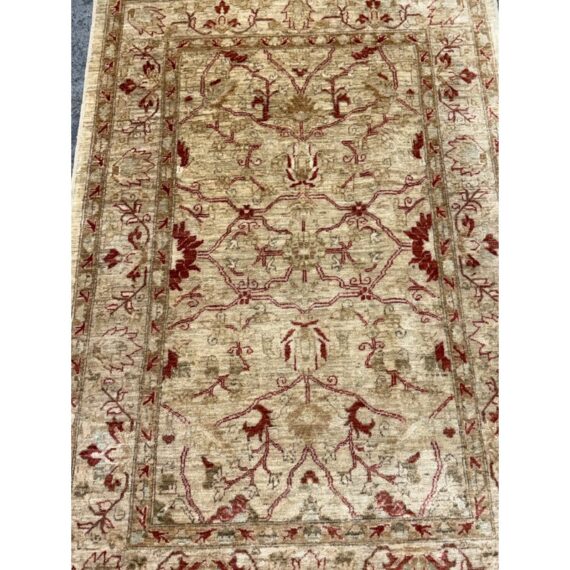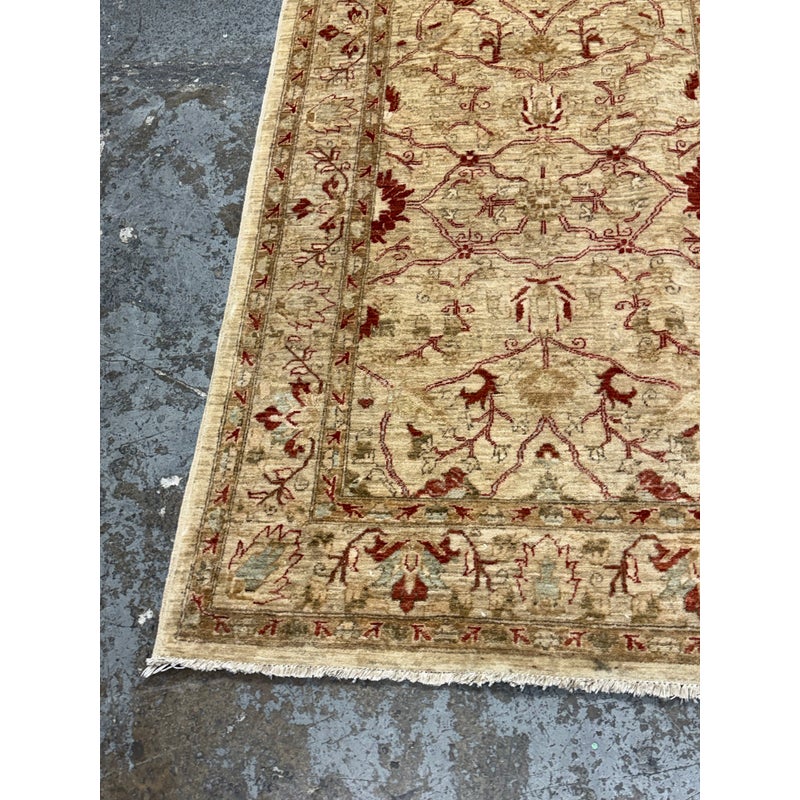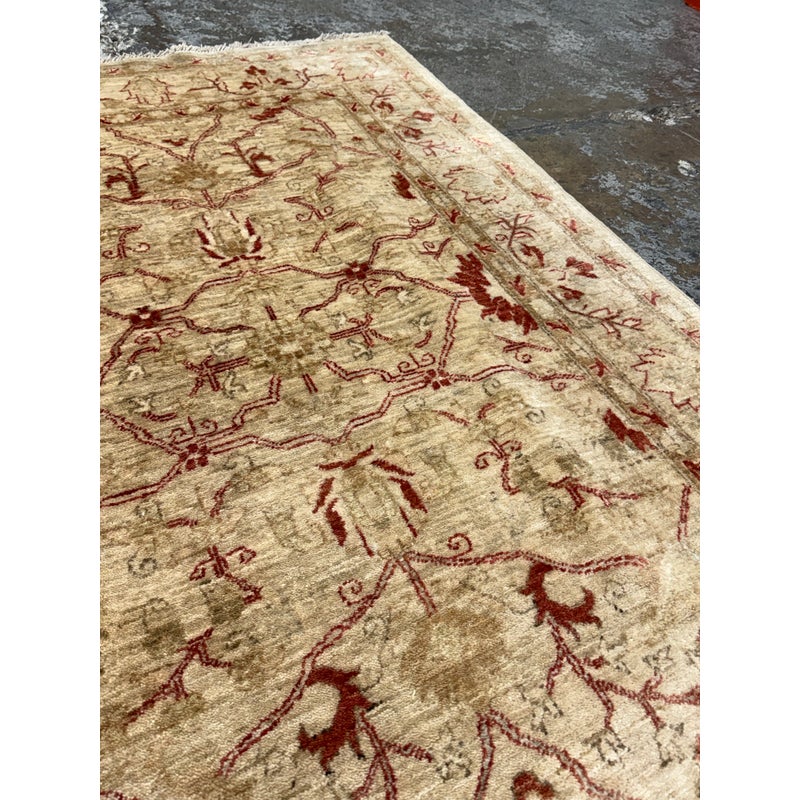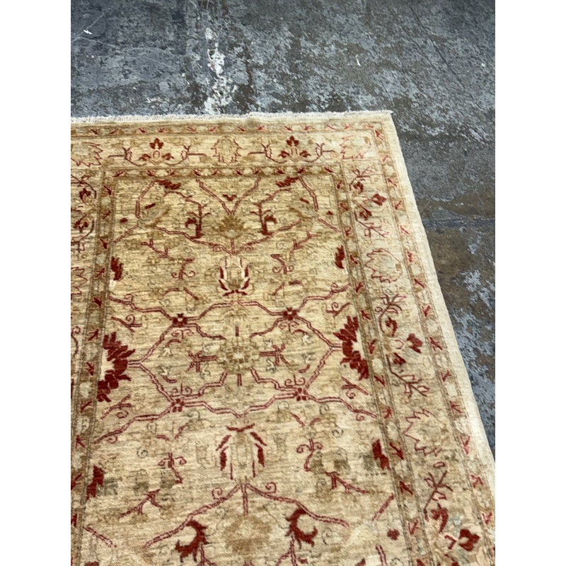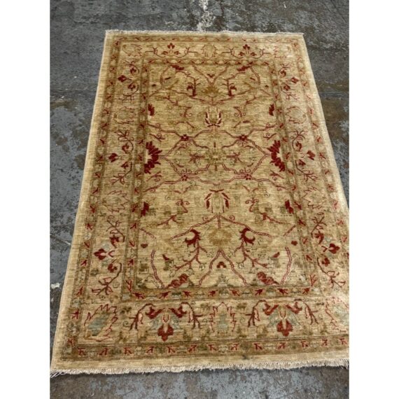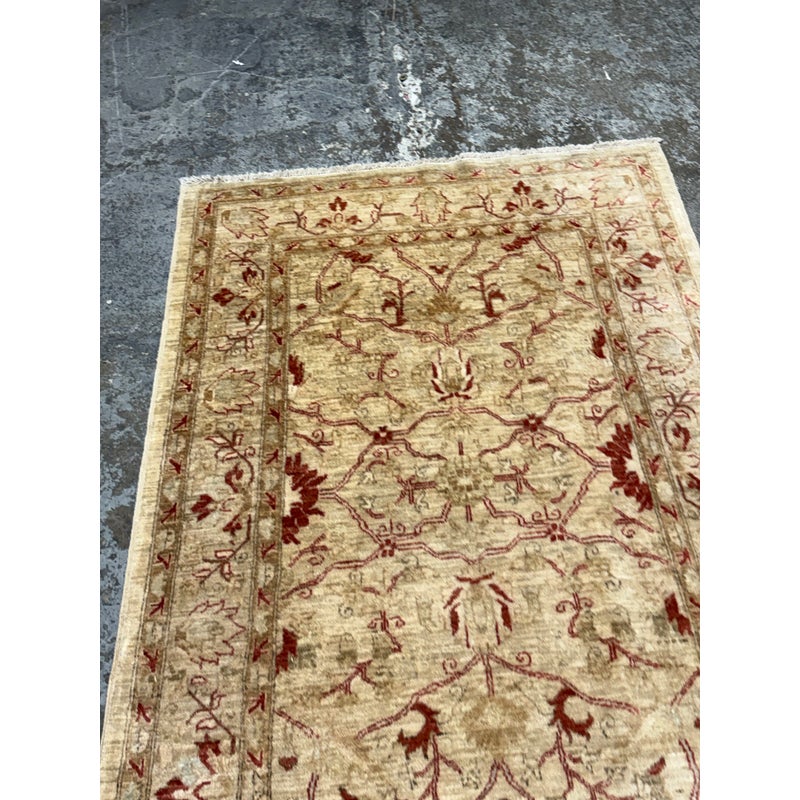 Design Plus Gallery presents a 3ft 9in x 5ft 9in Afghan Style Chobi Area Rug. Chobi rugs are among the most desired and most popular rugs in North America. This rug is bordered with traditional style accented with dark red and olive tones with a golden tan background. It has been hand woven with time honored techniques from skilled people. It is in good condition for its usage.