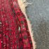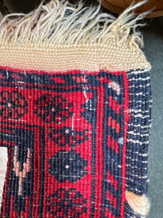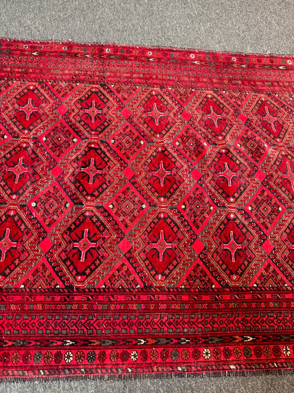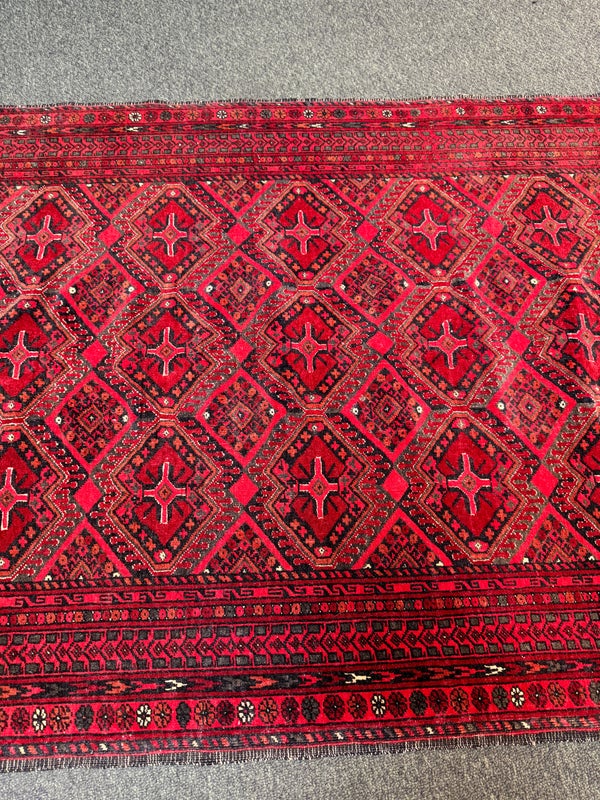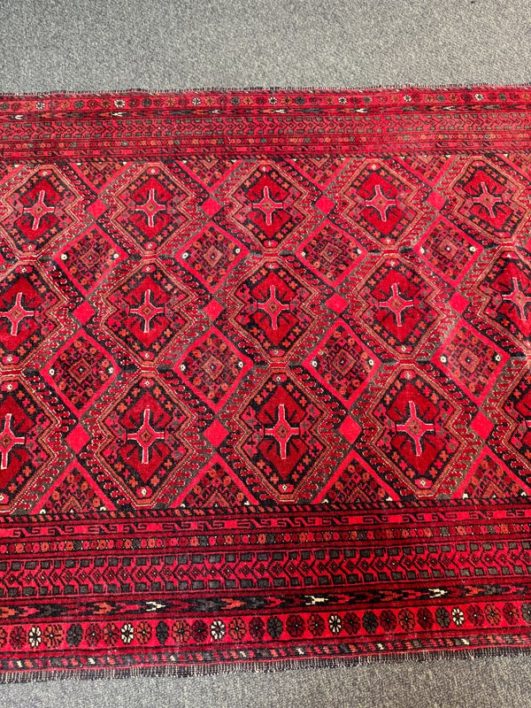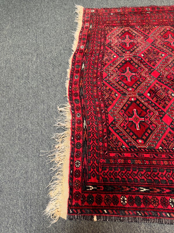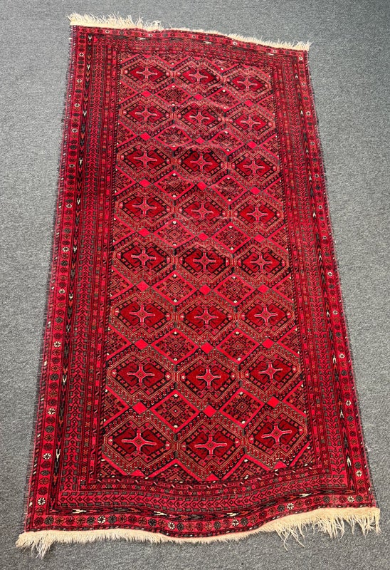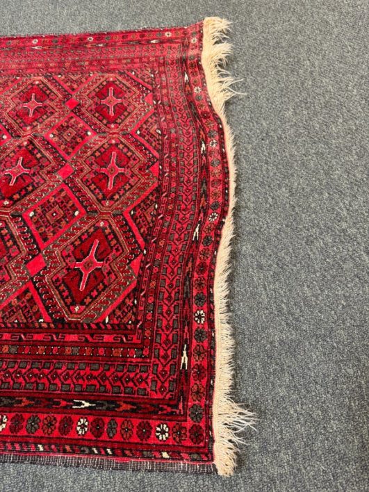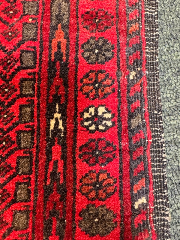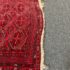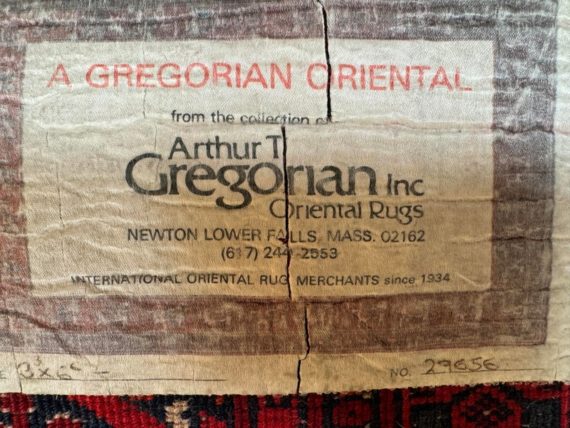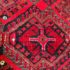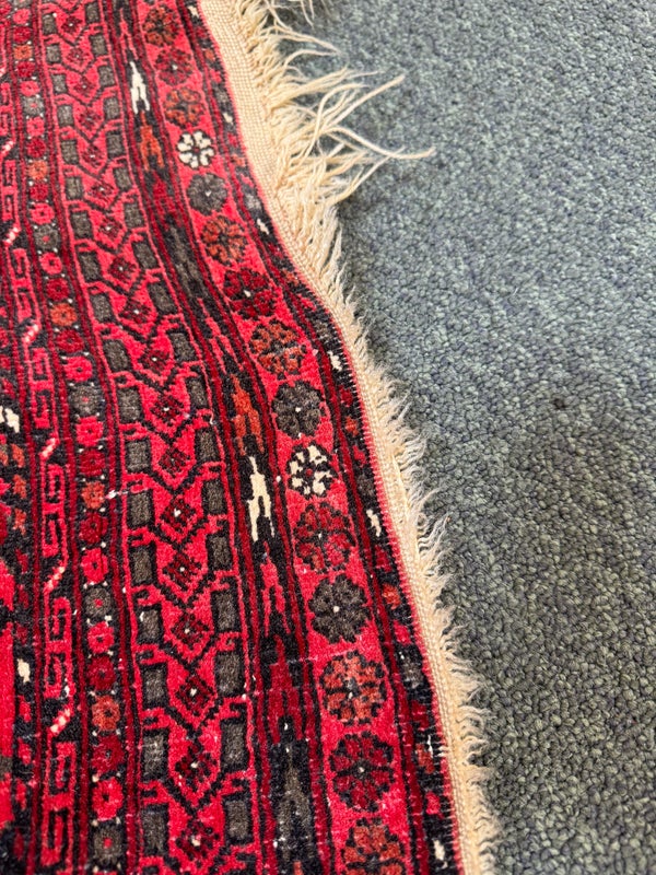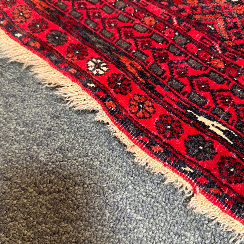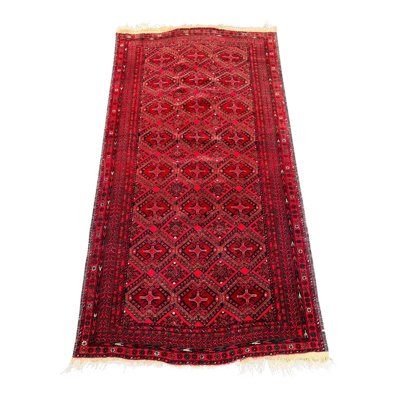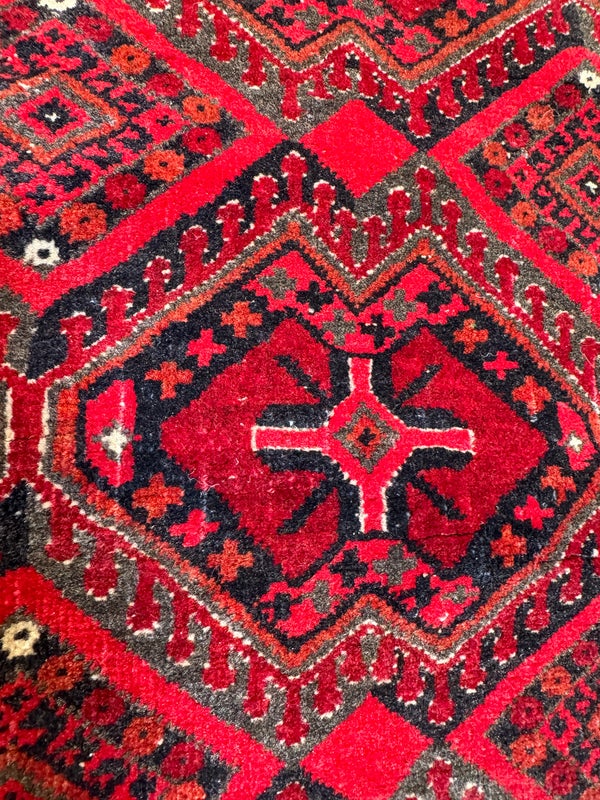 Design Plus Gallery presents a Vintage Shriven Persian Area Rug. Beautiful rich shades of red, black and white are handknotted into traditional tribal patterns creating a welcoming geometric floor covering. The all wool rug has short natural fringe. Visible surface wear; fringe needs repair; needs reblocking; condition is fair for age and use.