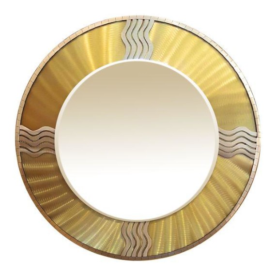 A round steel frame art deco beveled mirror from Design Plus Gallery. The two level steel frame is finished in a yellow/green with steel trim.