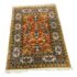 Design Plus Gallery presents a 4ft 1in × 5ft 10in Genuine Agrippa Handwoven Area Rug. Handwoven with all pure wool pile and finished with fringe at each end. The rug displays a rust red field with detailed botanical and geometric motifs in navy, teal, olive, cream, and gold tones, framed by a multi-band border with repeating medallion forms. This is a discontinued model and is in good condition with visible distress and minimal wear from usage.