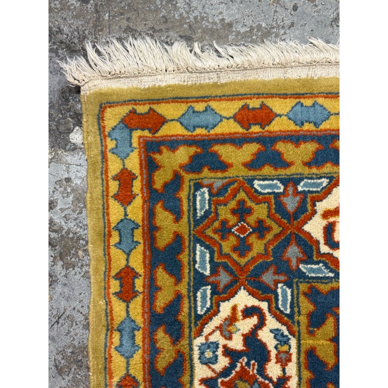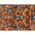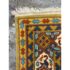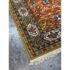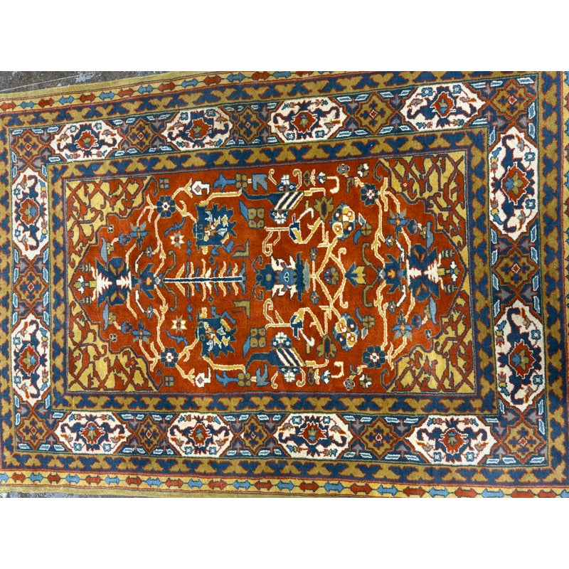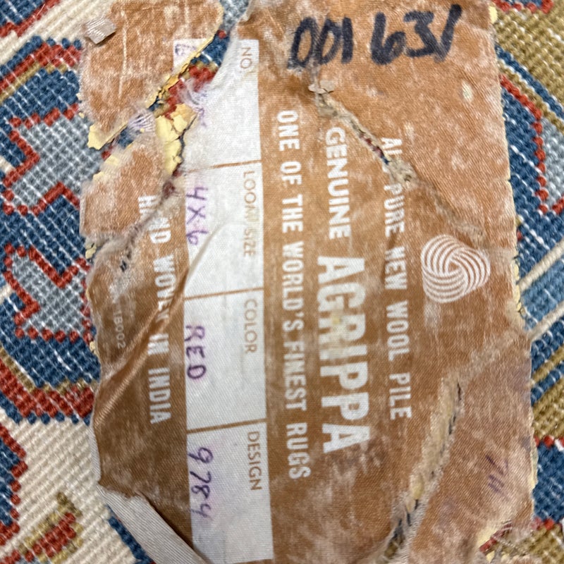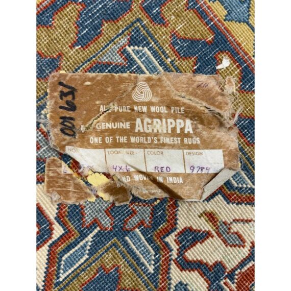 Design Plus Gallery presents a 4ft 1in × 5ft 10in Genuine Agrippa Handwoven Area Rug. Handwoven with all pure wool pile and finished with fringe at each end. The rug displays a rust red field with detailed botanical and geometric motifs in navy, teal, olive, cream, and gold tones, framed by a multi-band border with repeating medallion forms. This is a discontinued model and is in good condition with visible distress and minimal wear from usage.