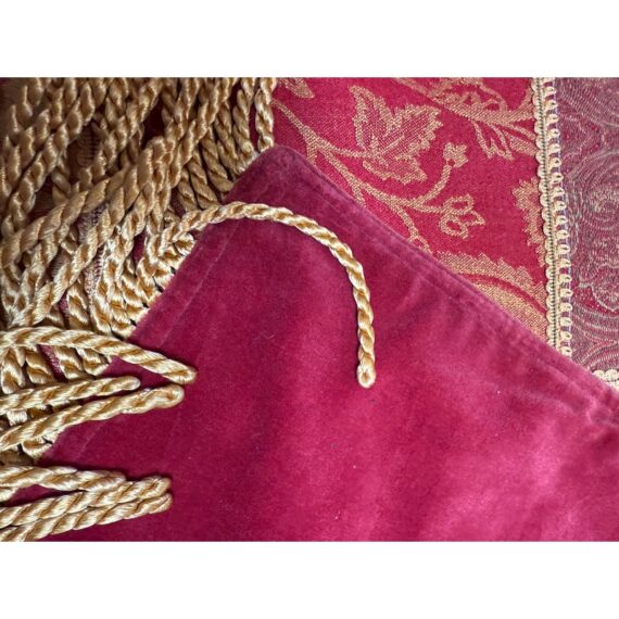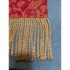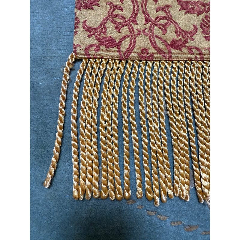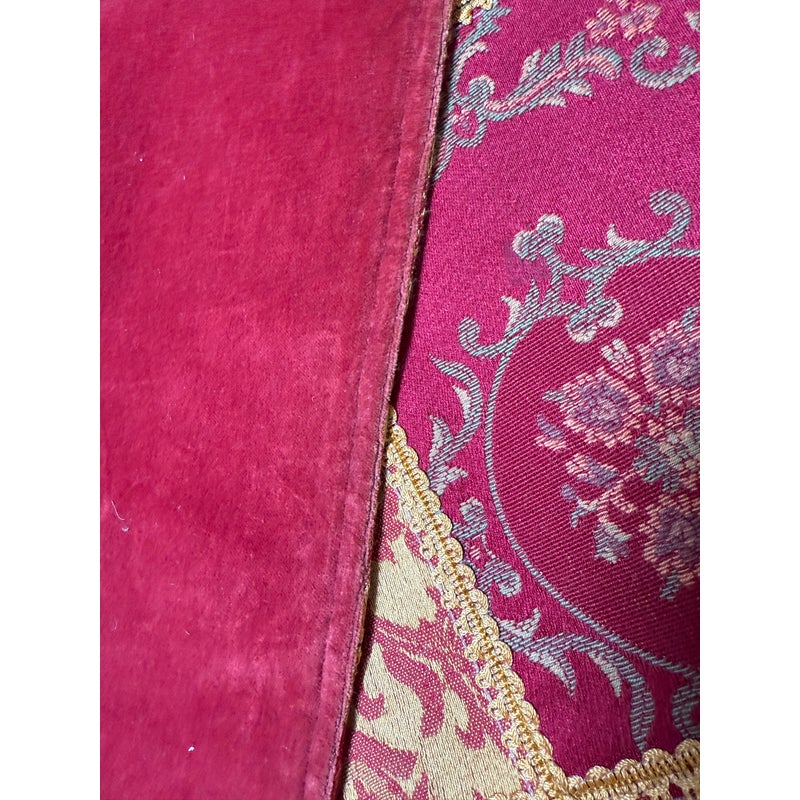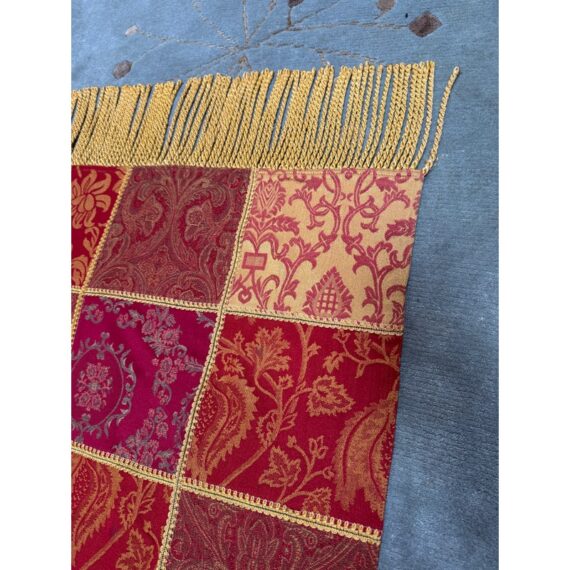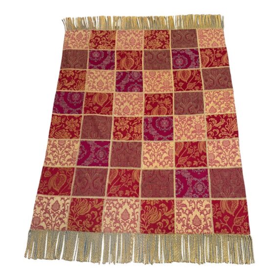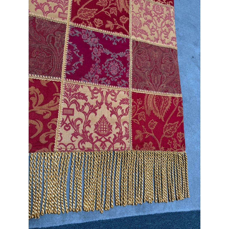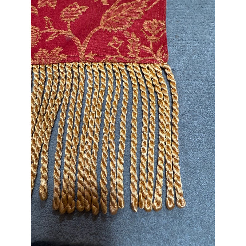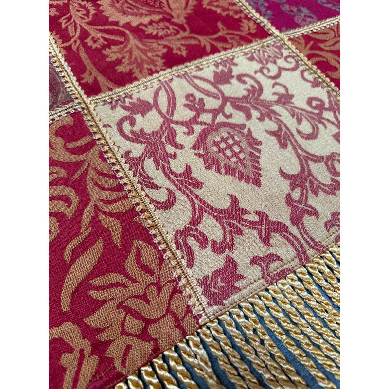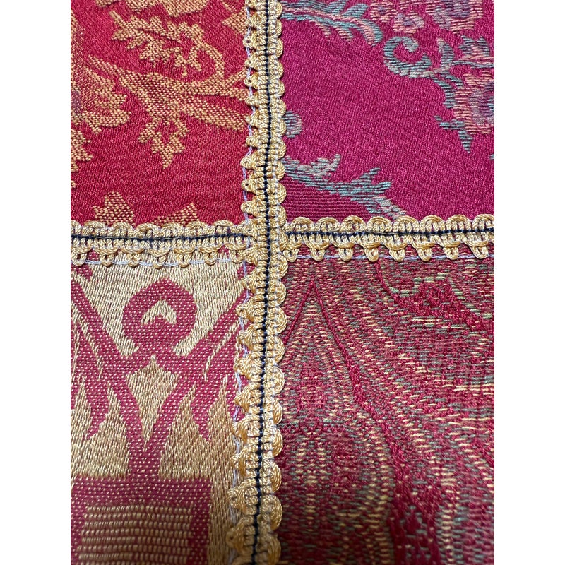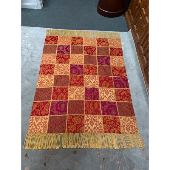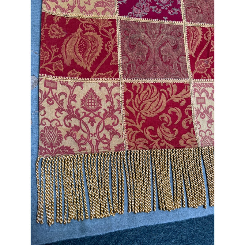 Design Plus Gallery presents a 4ft x 6ft Red + Gold Silk Jacquard Throw. An impressive tapestry of tiles with alternating patterns of thread work. The tones of their red/gold colors will forever stay appealing, interesting, and inspiring. The quilt like squares all have a gold ribbon trim at every intersection that is also found with the gold bullion fringed tassels at each end. One side has the patterns and the opposite has a luxurious solid silk velvet in complimentary red. Light wear; condition is good.