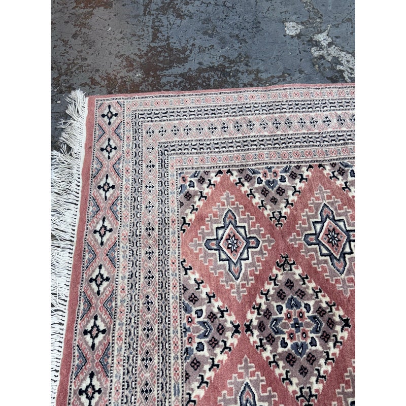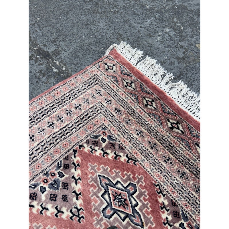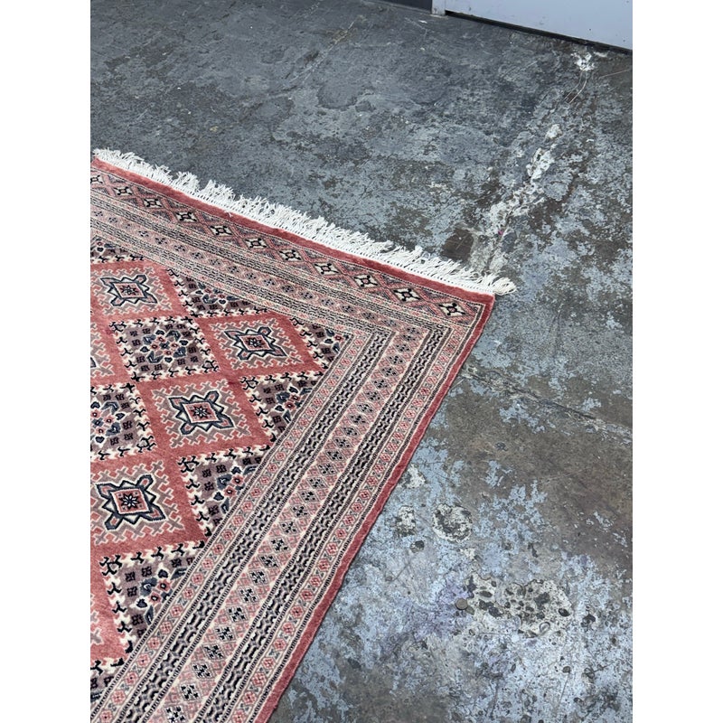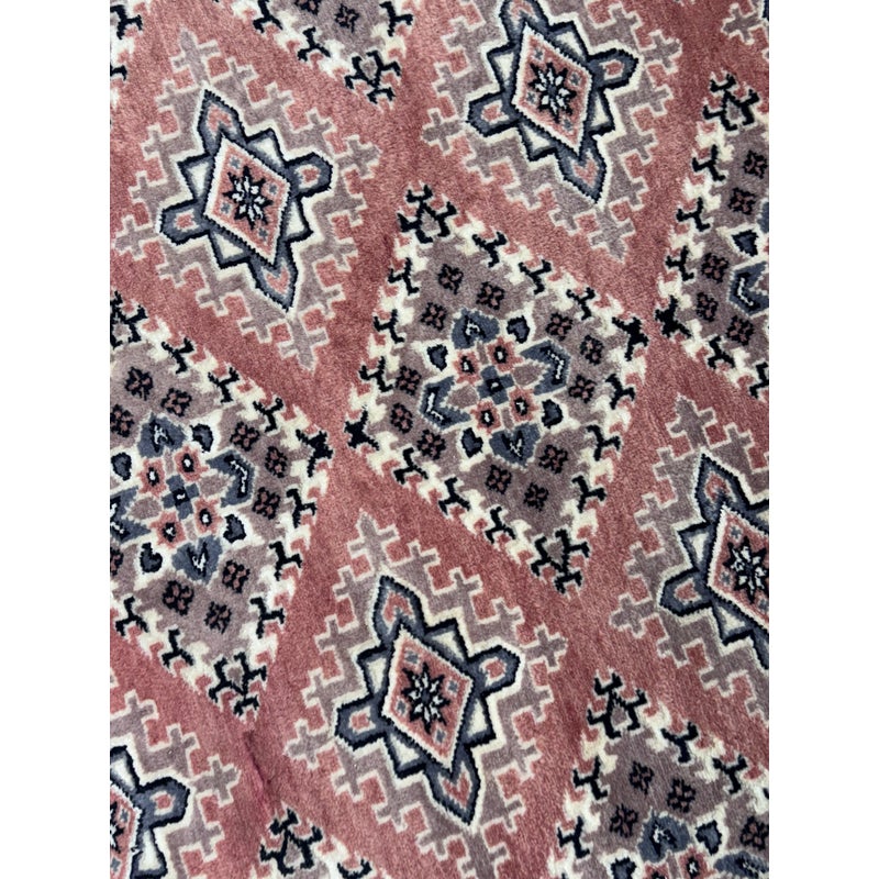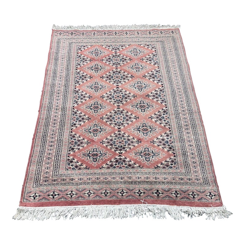 Design Plus Gallery presents a 4ft 2in x 6ft 3in Bokhara Area Rug. Bokhara rugs are renowned for their intricate, hand-knotted quality and traditional geometric designs. This hand made rug has a rose pink tone that is prevalent all over with diamonds + medallions in the middle with colors of taupe blue and black. There are multiple layers to create its border. The design of this hand knotted rug is so pleasing and will be a great addition to your living space. Visible wear is present but overall it is in good condition for its usage. Made in Pakistan.