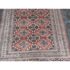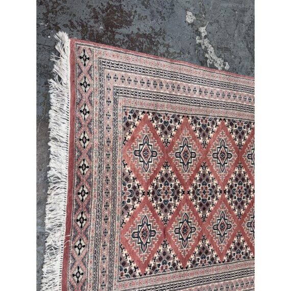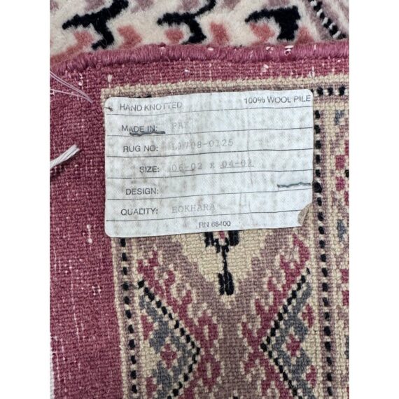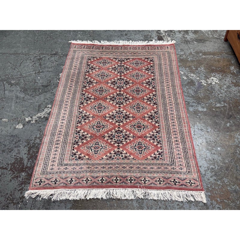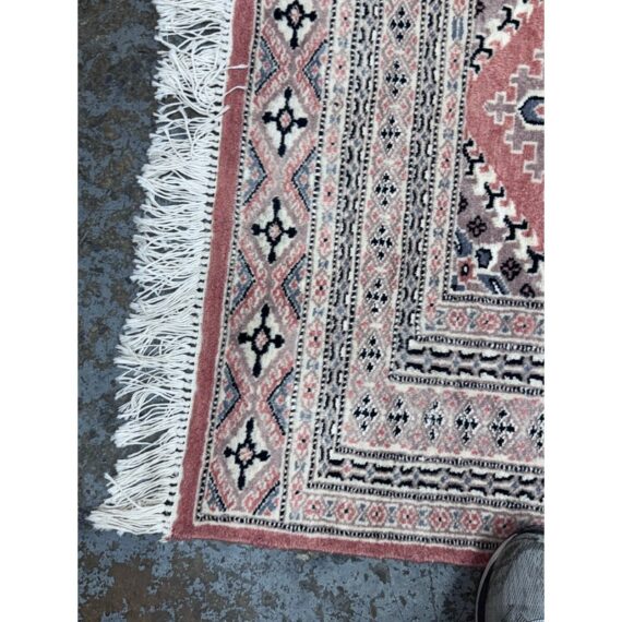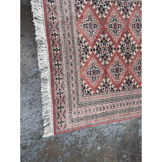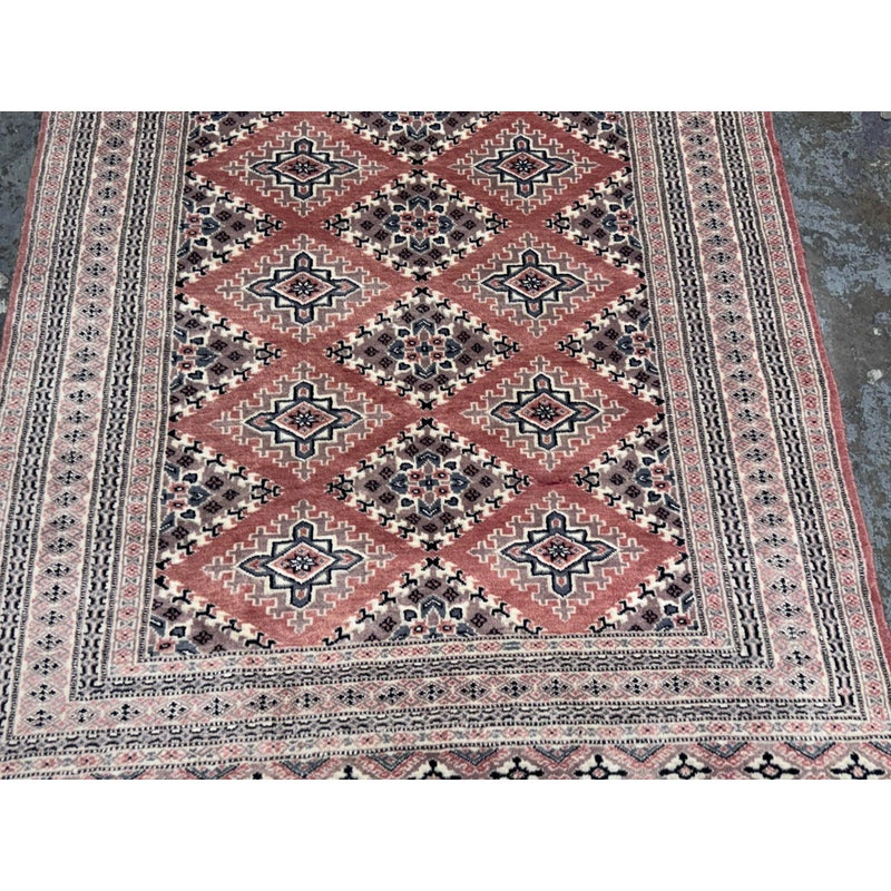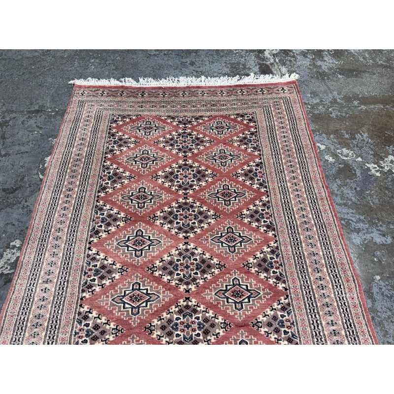 Design Plus Gallery presents a 4ft 2in x 6ft 3in Bokhara Area Rug. Bokhara rugs are renowned for their intricate, hand-knotted quality and traditional geometric designs. This hand made rug has a rose pink tone that is prevalent all over with diamonds + medallions in the middle with colors of taupe blue and black. There are multiple layers to create its border. The design of this hand knotted rug is so pleasing and will be a great addition to your living space. Visible wear is present but overall it is in good condition for its usage. Made in Pakistan.