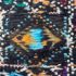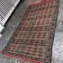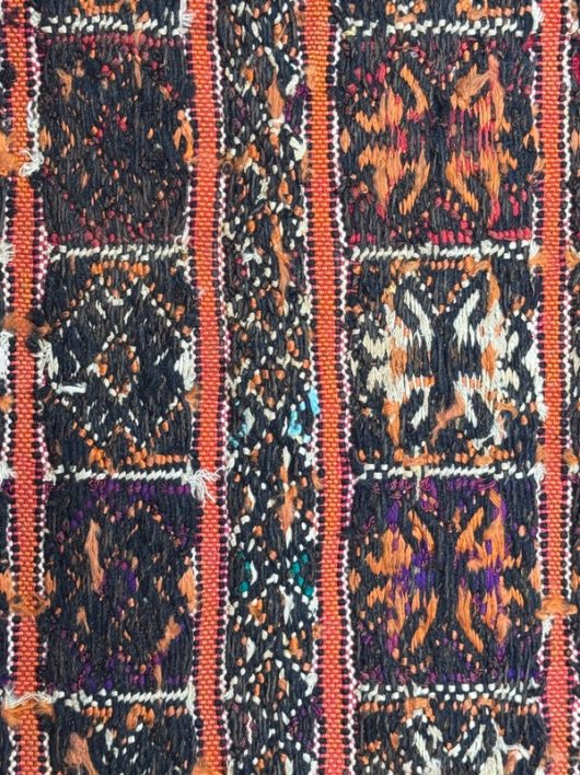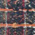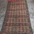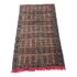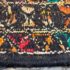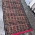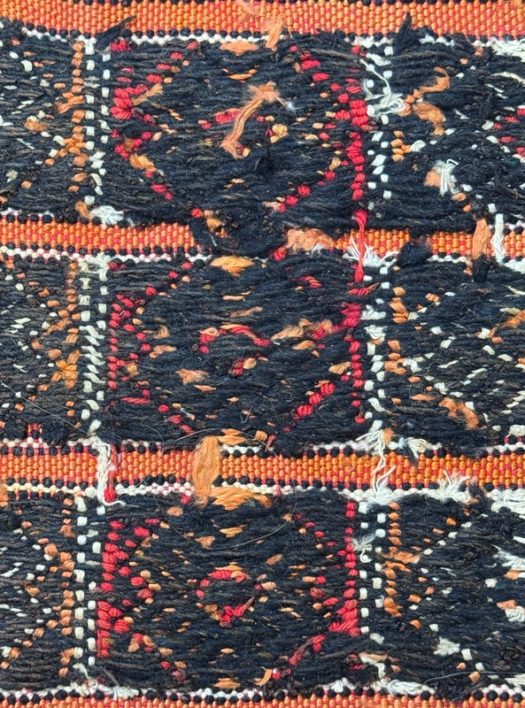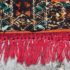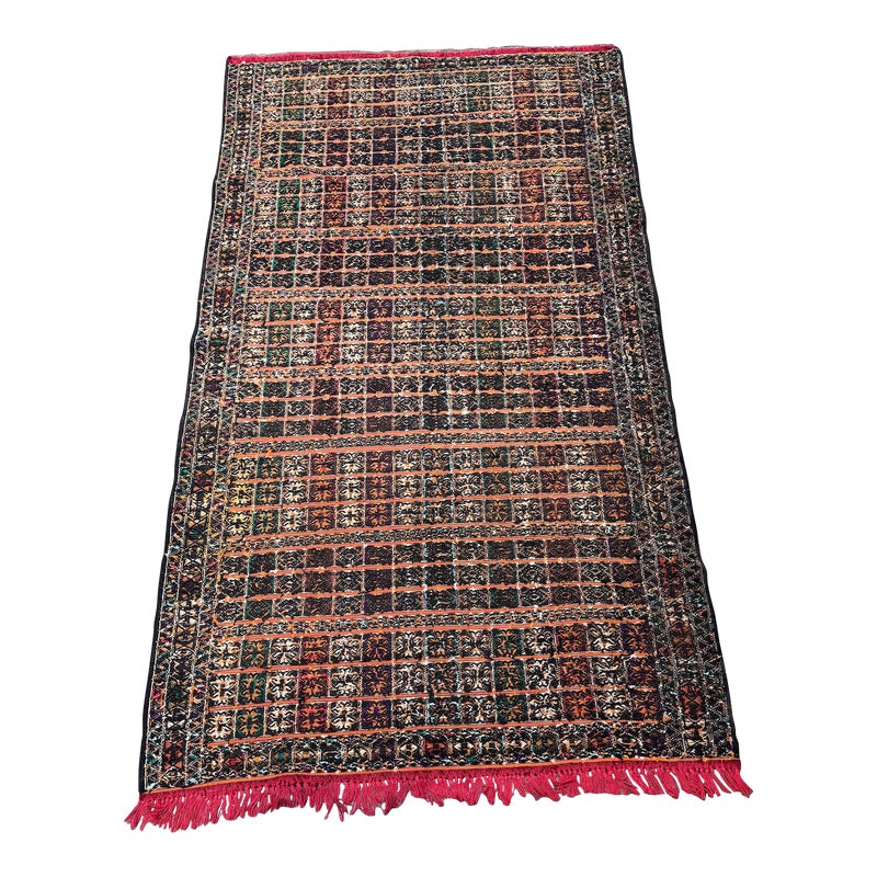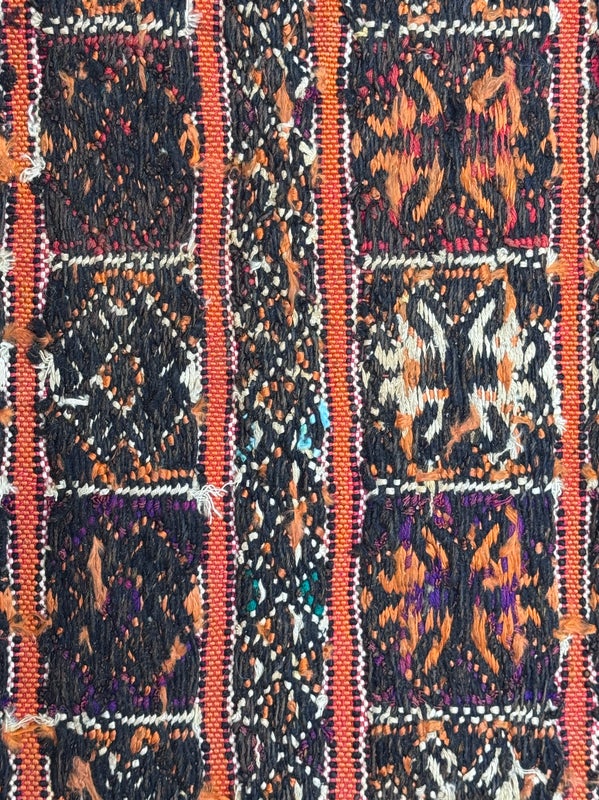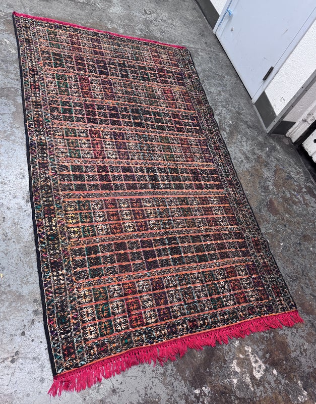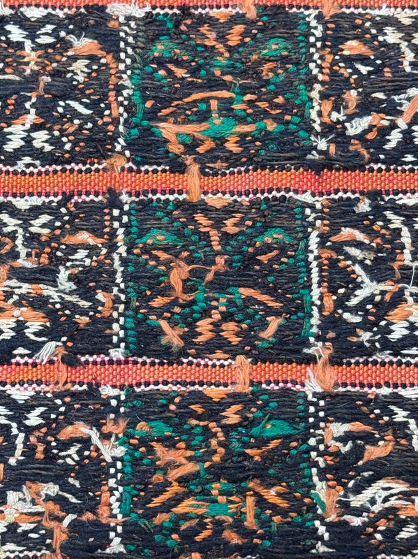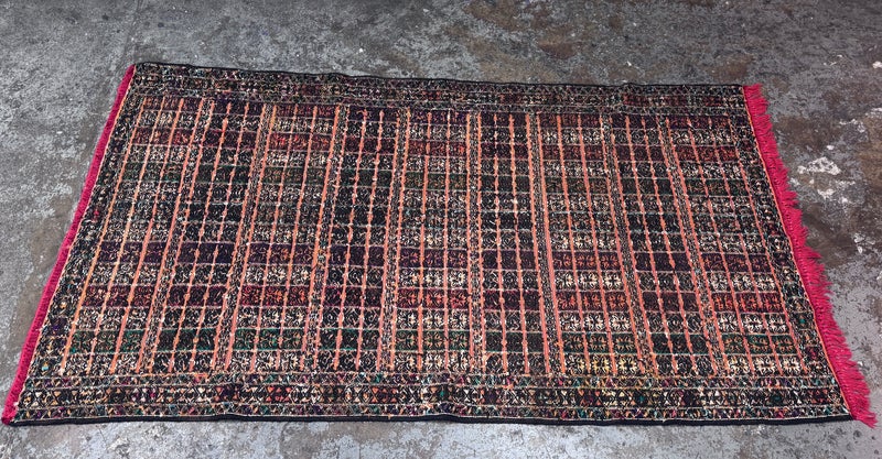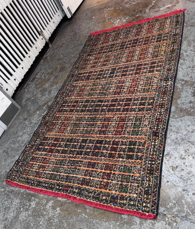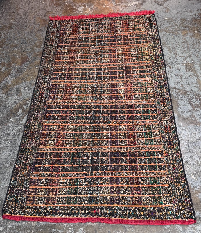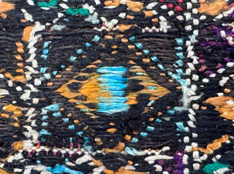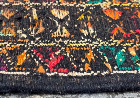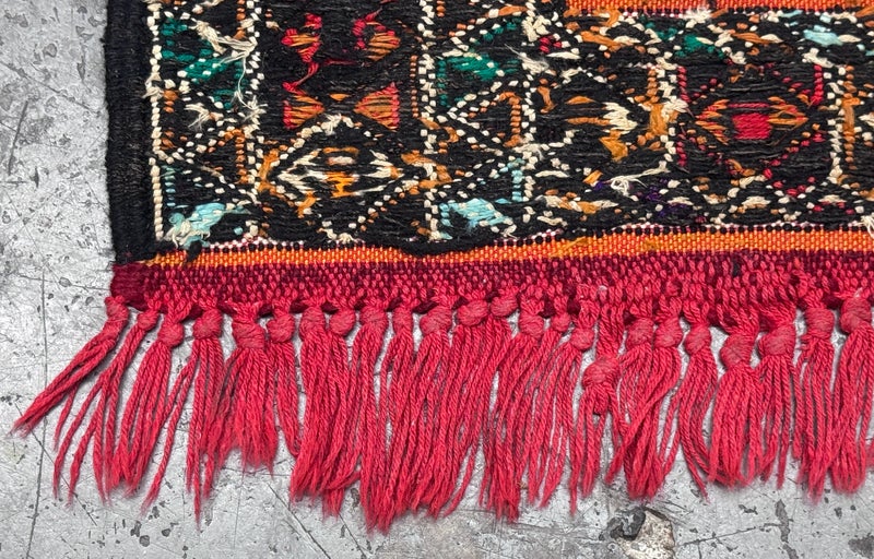 Design Plus Gallery presents a 4ft 3in x 7ft 8in Turkish Flatweave Area Rug. The rug is hand weave with red fringe and a black background. Numerous colors run through the black, with orange, turquoise, green and purple standing out in the pattern work. Is in good condition with minimal signs of wear from age + use. One side of the fringe was cut.