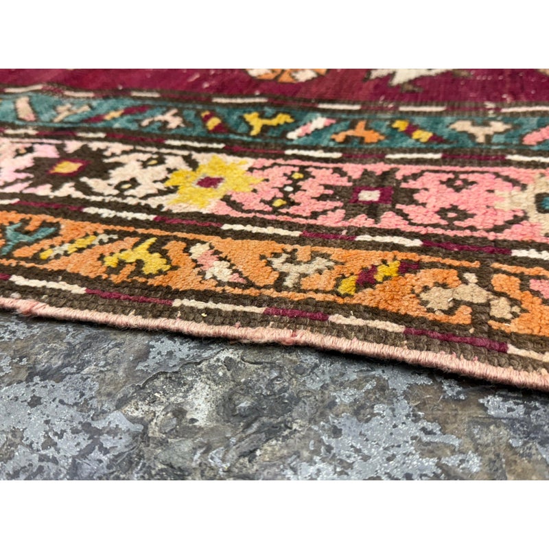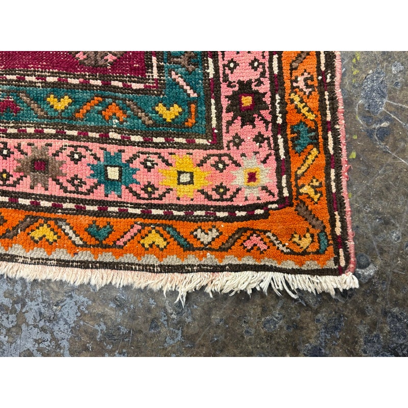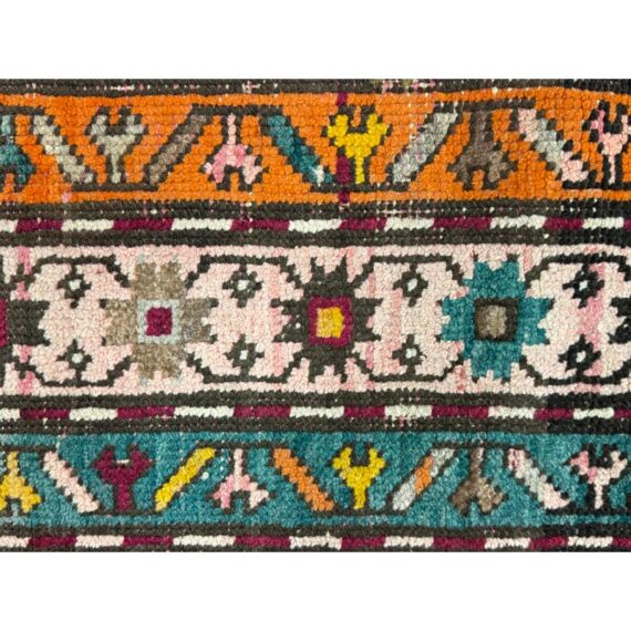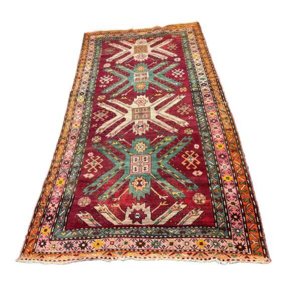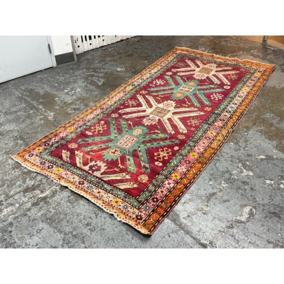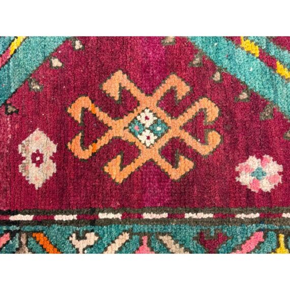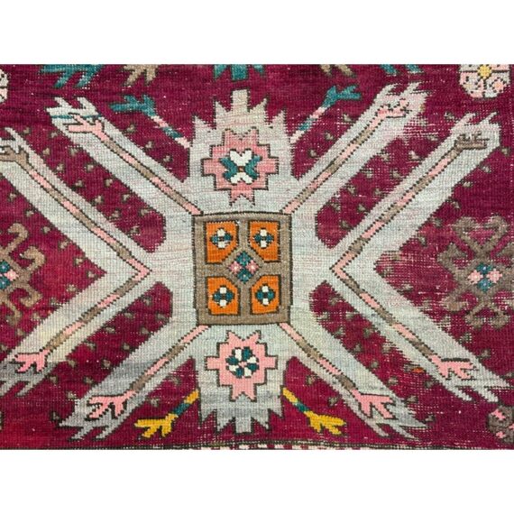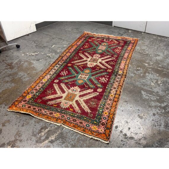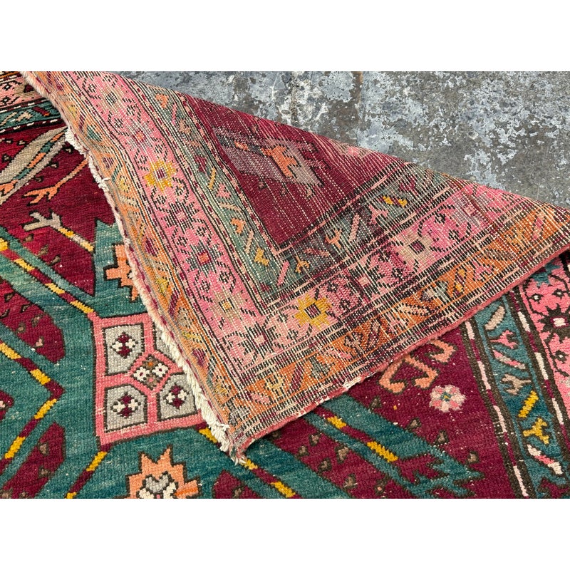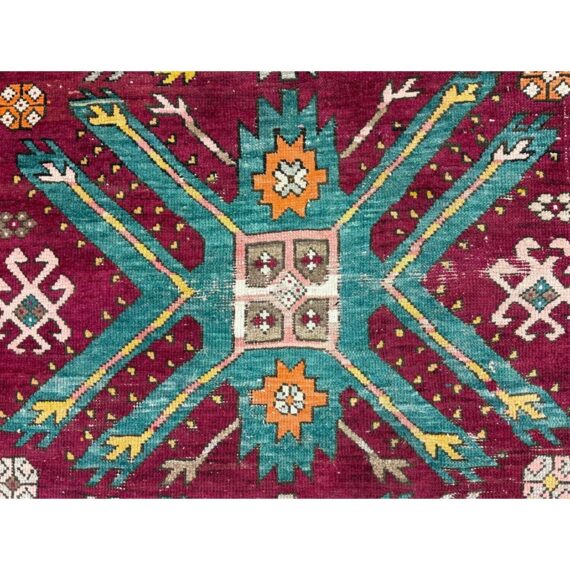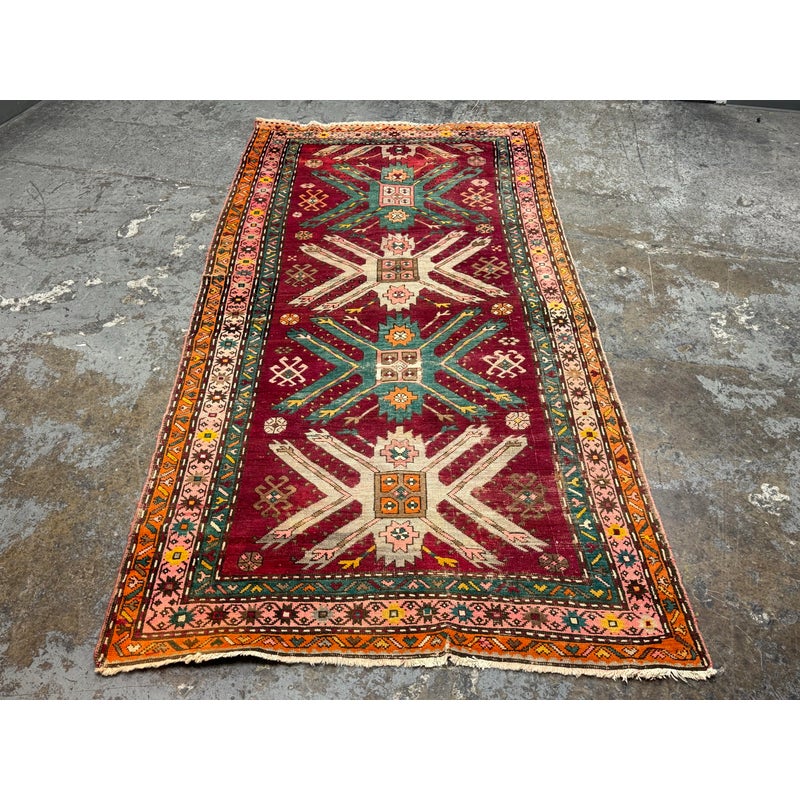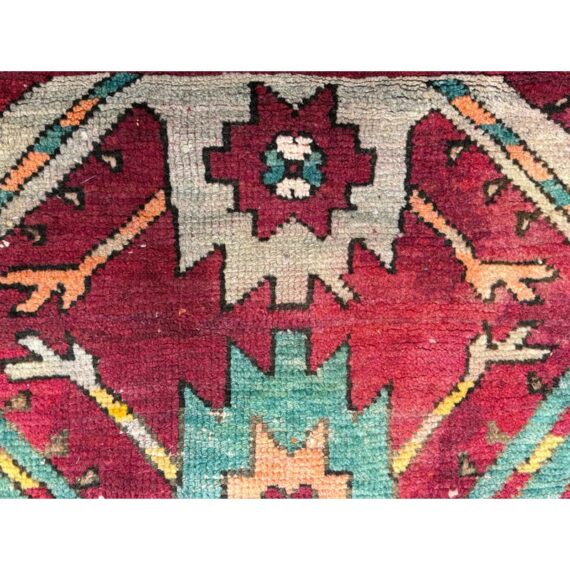 Design Plus Gallery presents the 4ft 8in x 10ft Anatolian Style Area Rug. The hand knotted rug has vibrant colors with geometrical pattern work. The most dominate color is a red-coral with X shapes in the center in turquoise + off white. Varying colors in the multiple border with emblems placed all around for a thoughtful design that is forever striking. The vintage rug is in good condition for its age with wear that could be mended with a good cleaning.