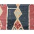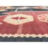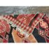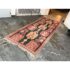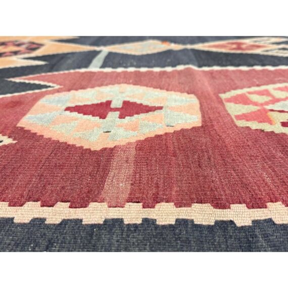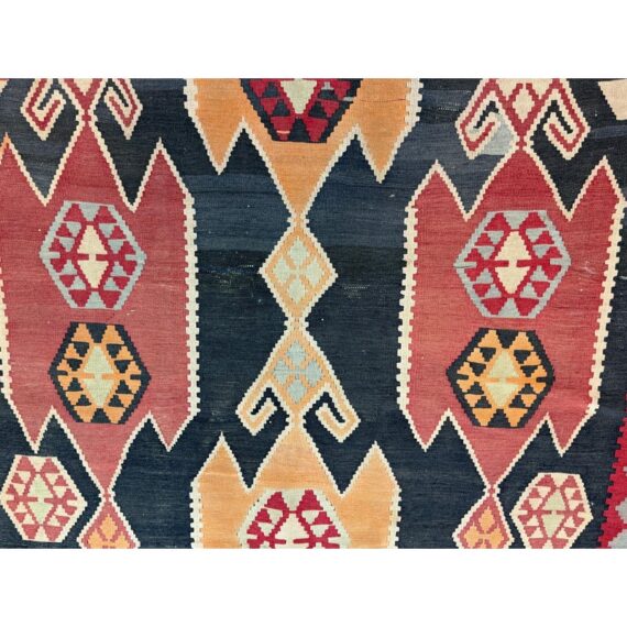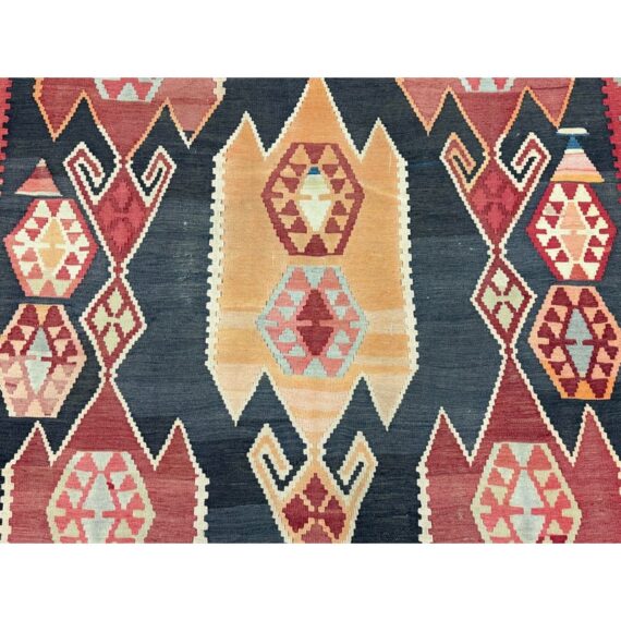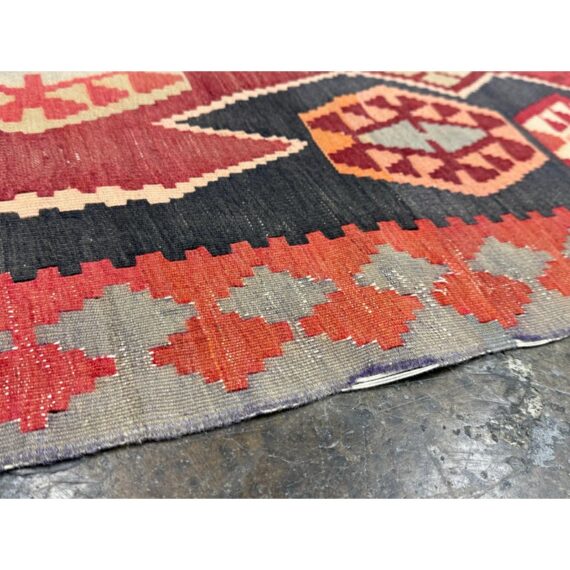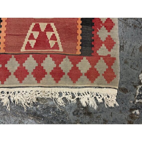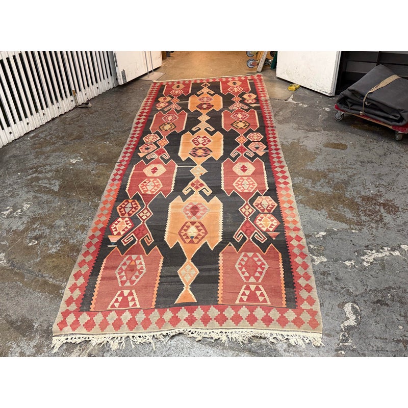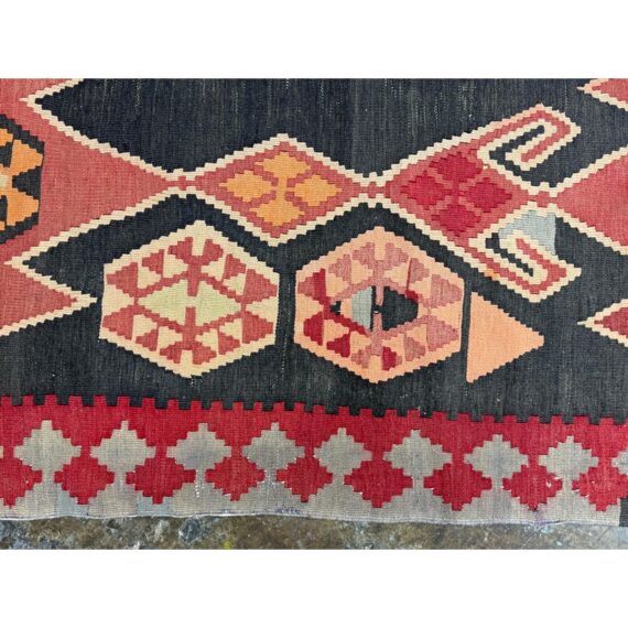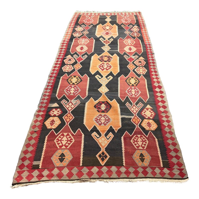 Design Plus Gallery presents a 4′8 Ft × 13′4 Ft Kilim area Rug from Simonian Rug Cleaners in San Francisco. The rug is of a tribal style with emblematic and repeating prints taking over its front/back sides. The flat weave rug has colors of rust red with orange + black to stand out when underfoot. The rug was hand woven and has delicate fringe at either end. It is in good condition for its usage with minimal visible wear.