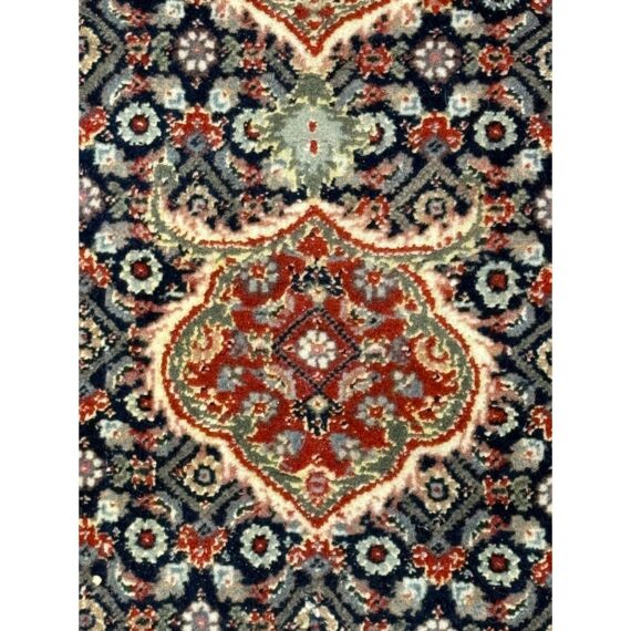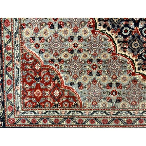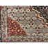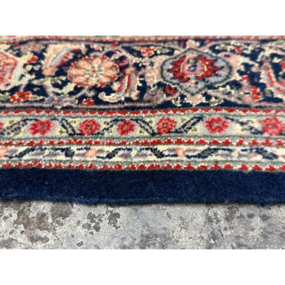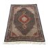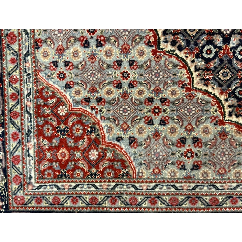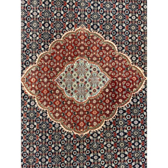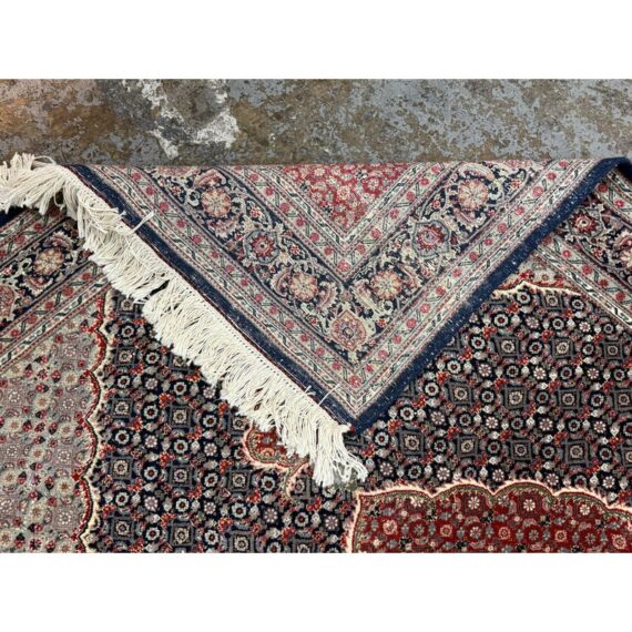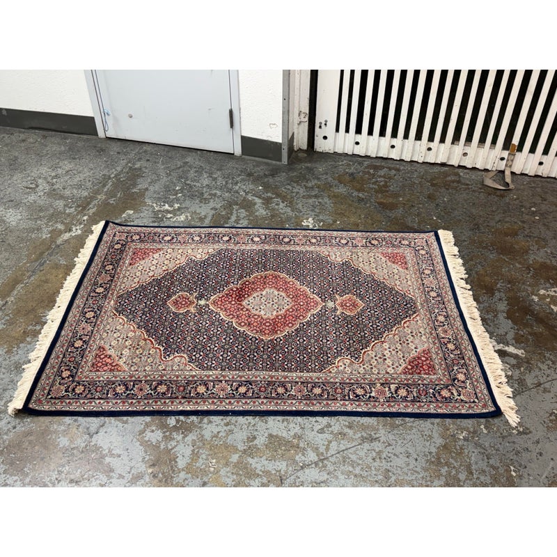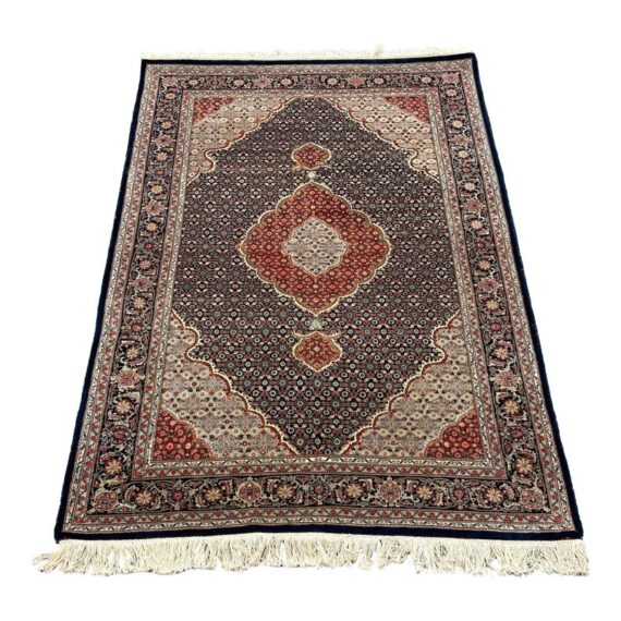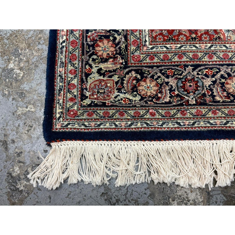 Design Plus Gallery presents a 4ft x 6ft Persian Area Rug of Wool & SIlk. The style of the rug goes towards Persian design with a lean toward Tabriz Mahi design. It has a delicate floral pattern surrounding the corners and borders with a central medallion. The rug is hand woven with long fringe at the base. The rug shows minimal signs of wear for its usage.