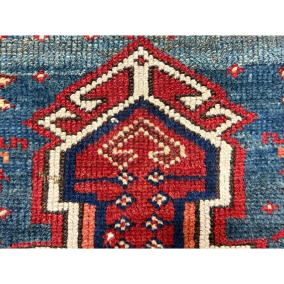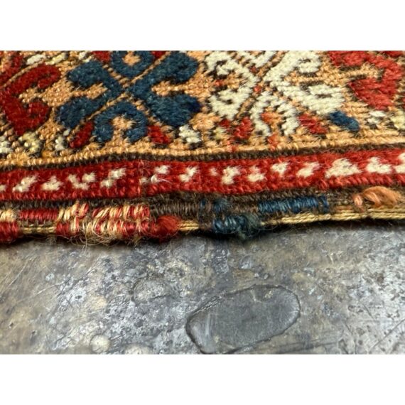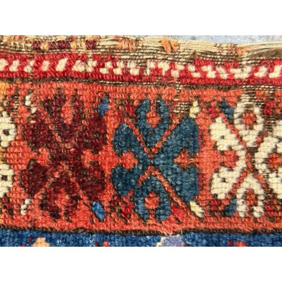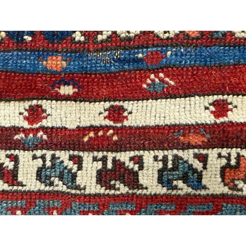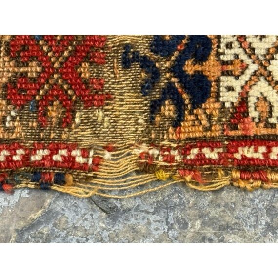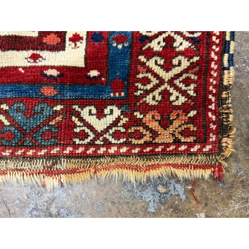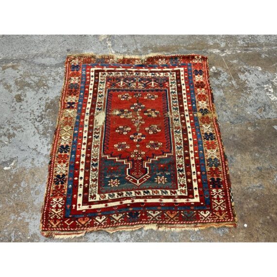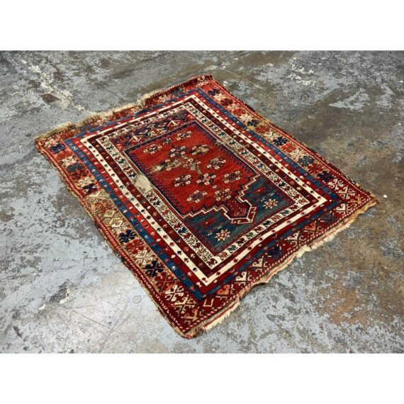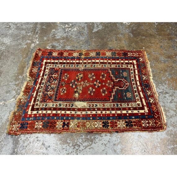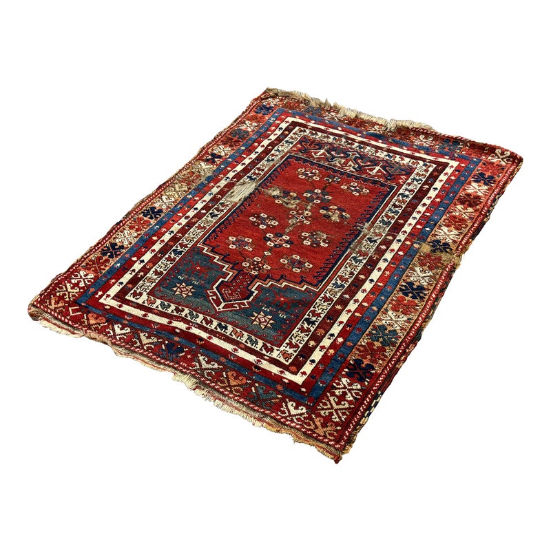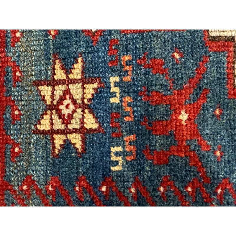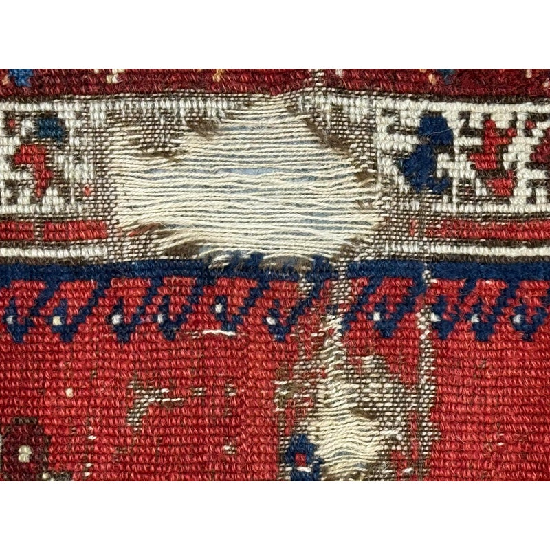 Design Plus Gallery presents a 4ft5in X 3ft5in Circa 1880 Turkish Bergama Area Rug. Bergama rugs are known for their bold geometric patterns and rich colors, often featuring a palette of brick red, dark blue, white, green, and yellow. This particular rug showcases a central red field with a geometric design, surrounded by multiple borders with varying patterns and colors, including blue, white, and red. The rug also features fringe on the ends. Bergama rugs are considered collectible and can add character and warmth to a space. This is an antique and have unraveled and shows of thread loss throughout the years. Visible and minimal wear from usage.