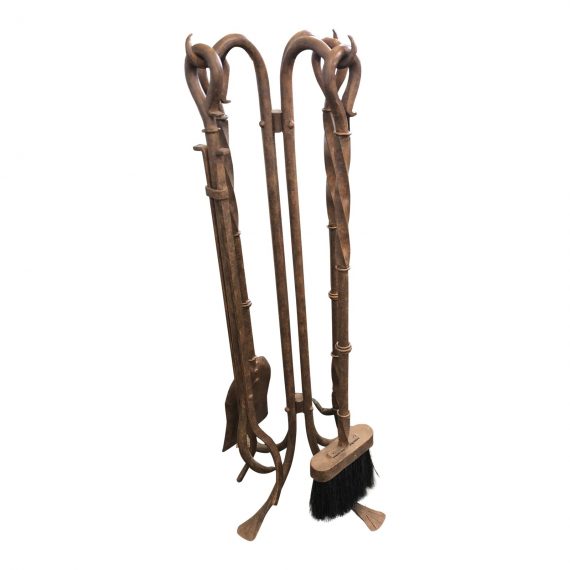 Design Plus Gallery presents a five piece wrought iron Fireplace Tool Set. This tool set will bring style and convenience to the forefront of your hearth area. The set consist a poker, brush, shovel, and log lifter all on a sturdy wrought iron stand. Natural patina with age.