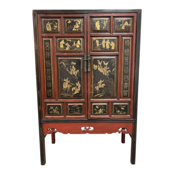 Design Plus Gallery presents an Early 20th Century Asian Armoire. Crafted from solid woods with hand painted details. Two swing open doors with metal hardware, reveals two pullout drawers and two fixed shelves. Hand painted details and natural distressing with age.