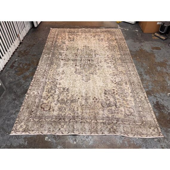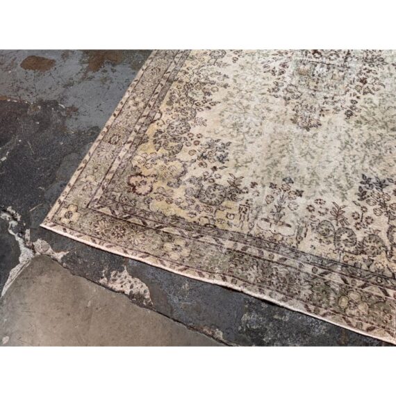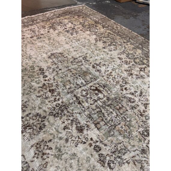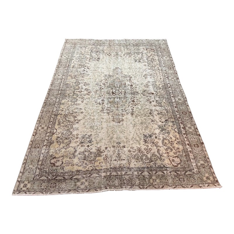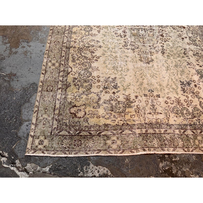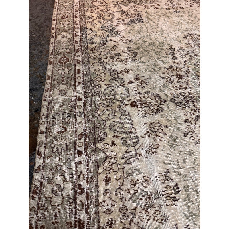 Design Plus Gallery presents a 5ft 12in x 9ft 4in Vintage Meinhard Area Rug. This floor covering showcases a softly aged pattern with a central medallion and detailed border, offering a layered, timeworn look that works seamlessly in both traditional and modern interiors. The palette blends cream, moss, and beige tones, creating depth and visual interest without overpowering a space. Subtle variations in color and pile reflect its vintage character and add authenticity throughout the surface. In good condition, visible and minimal wear from usage.
