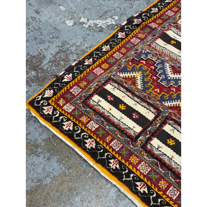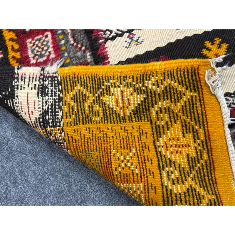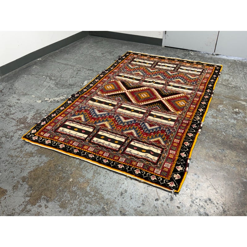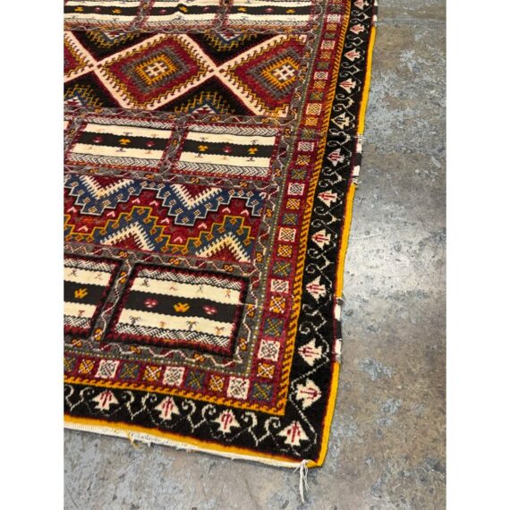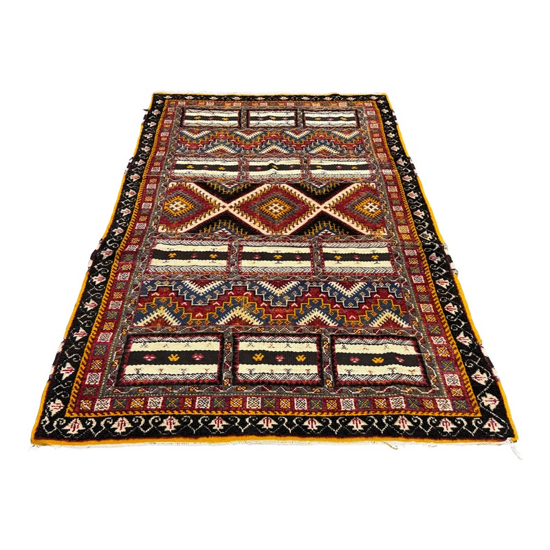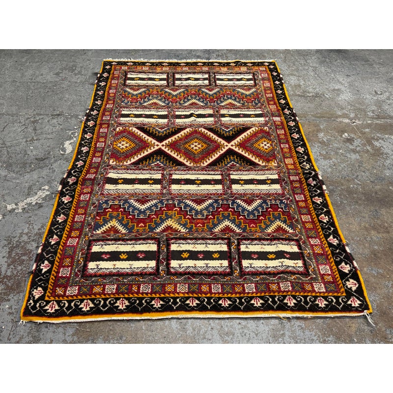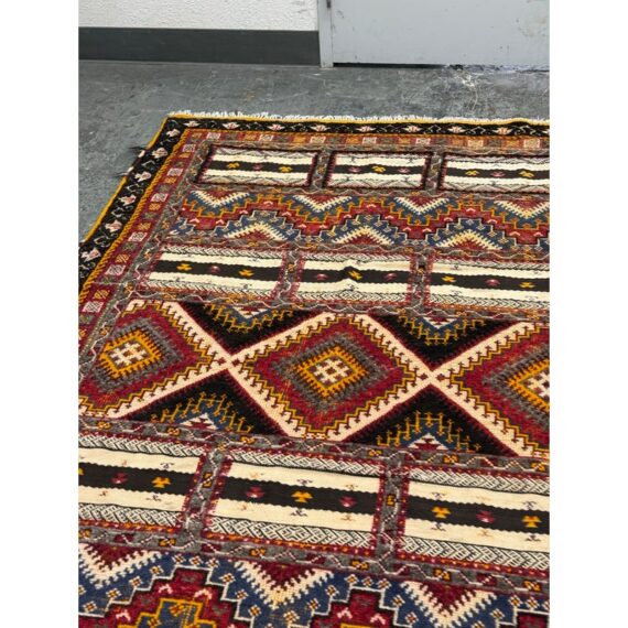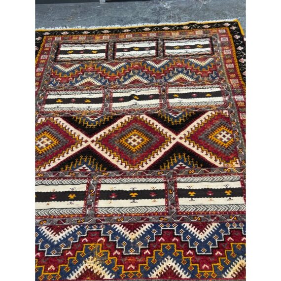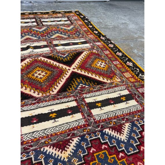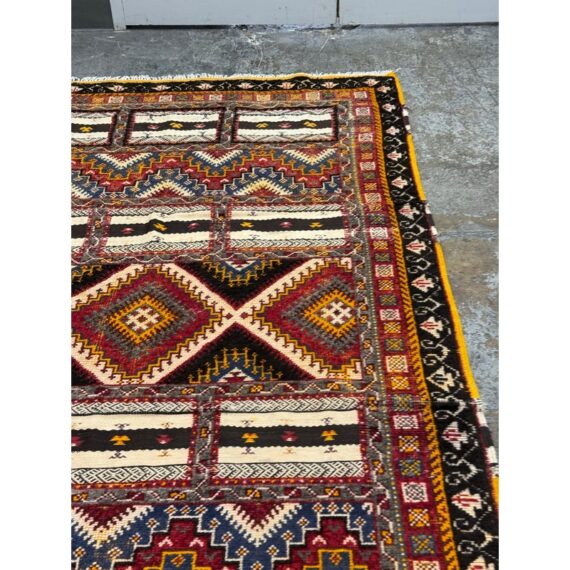 Design Plus Gallery presents a 5ft 5in x 9ft Superb Kilim from Taznakht located in the province of Ouarzazate, Morocco. The Kilim of Taznakht is more than just a carpet; it is a true work of art that embodies the soul and heritage of the Berber tribes. This Kilim rug was hand-woven by skilled craftsmen, perpetuating traditional craftsmanship passed down from generation to generation. It is distinguished by the use of three different weaving techniques, which gives it a unique texture and visual appearance. The geometric and symbolic motifs on this carpet are derived from the Berber tradition, a culture rich in history and symbolism. These motifs tell stories, often related to nature, tribal beliefs and everyday events. Each pattern has its own meaning, adding a cultural and spiritual dimension to your decoration. Thanks to the robustness of the materials and the expertise of the craftsmen, this carpet will withstand everyday wear while retaining its charm and allure. It is in good overall condition, visible and minimal wear.