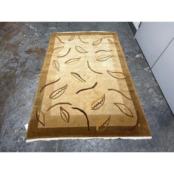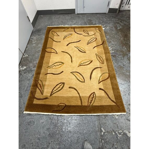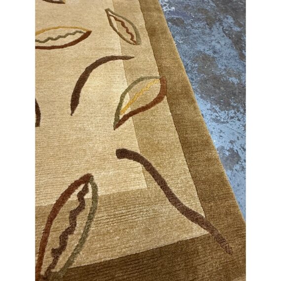 Design Plus Gallery presents a 5 Ft × 7 Ft 6 in Wool Are Rug from Tony Kitz Gallery. This handwoven wool rug presents a tonal palette of beige, tan, caramel, and brown with an allover pattern of scrolling lines and leaf motifs. A layered border frames the composition and gives the piece added depth, while the varied pile height brings texture and dimension to the surface. It is in good condition with visible and minimal wear from usage.