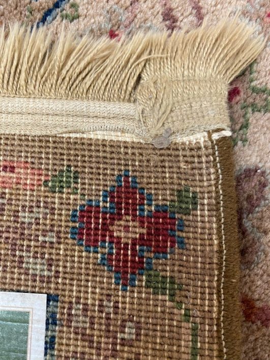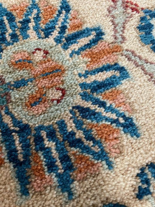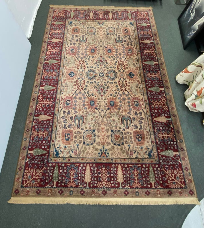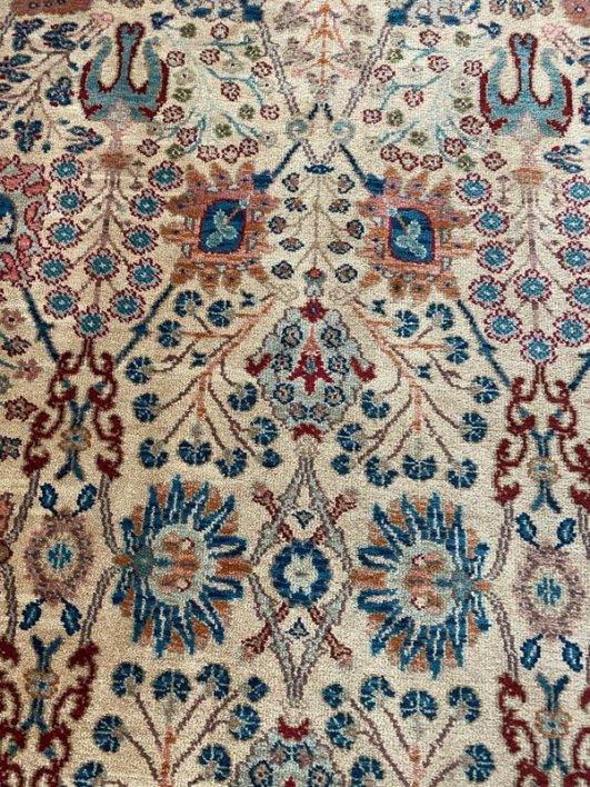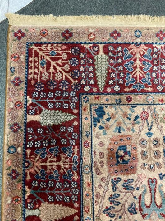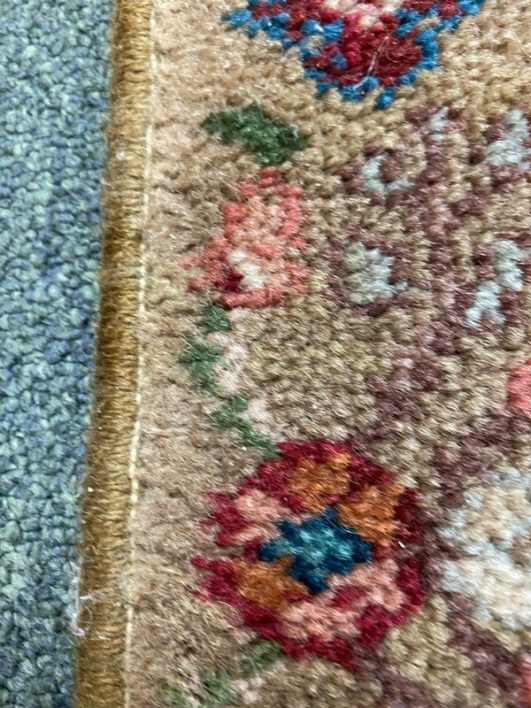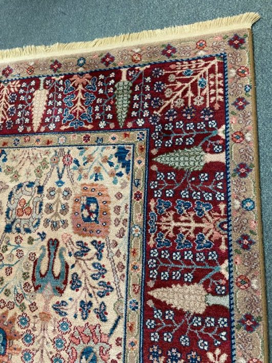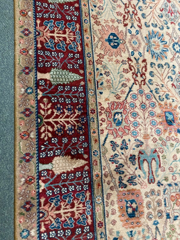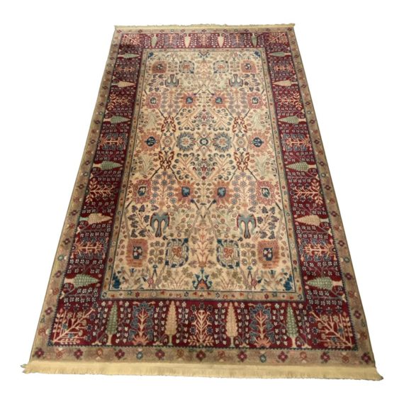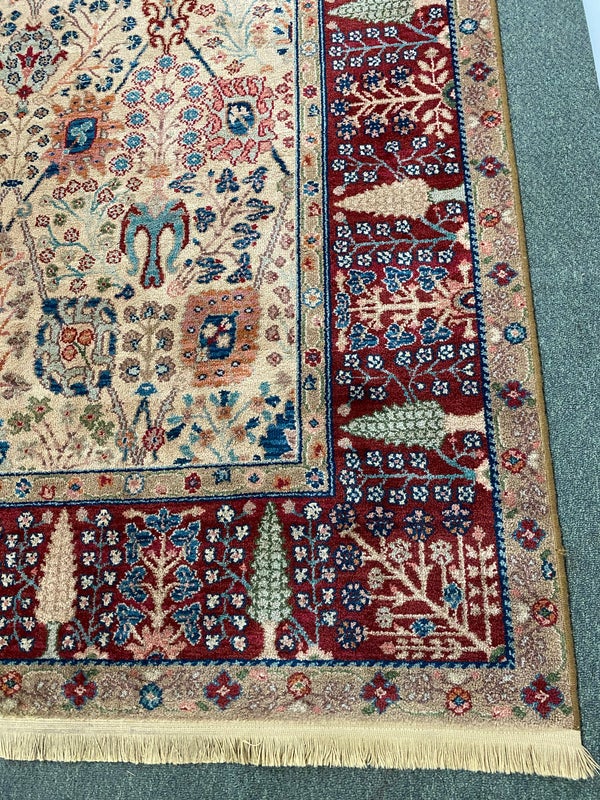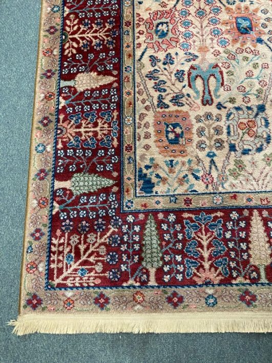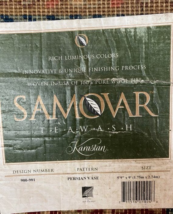 Design Plus Gallery presents the Samovar Persian Vase Rug by Karastan. The center ground, in a muted tea hue, gives depth to this lovely machine made rug. Flowers in many styles fill the Samovar Vases shown mid ground. Additional plants motifs create a deep border. Made in the USA of imported wool. Condition is consistent with age and use.