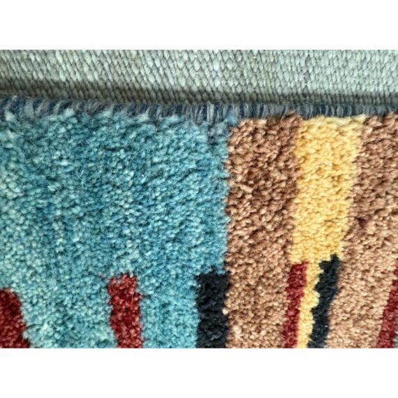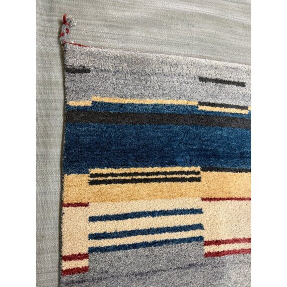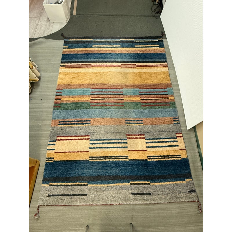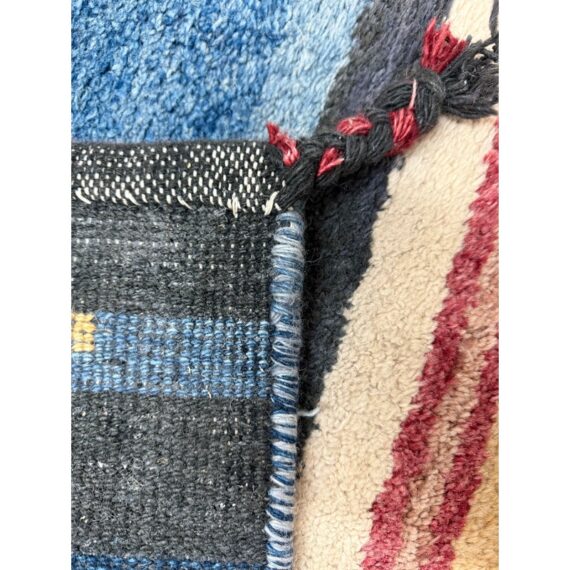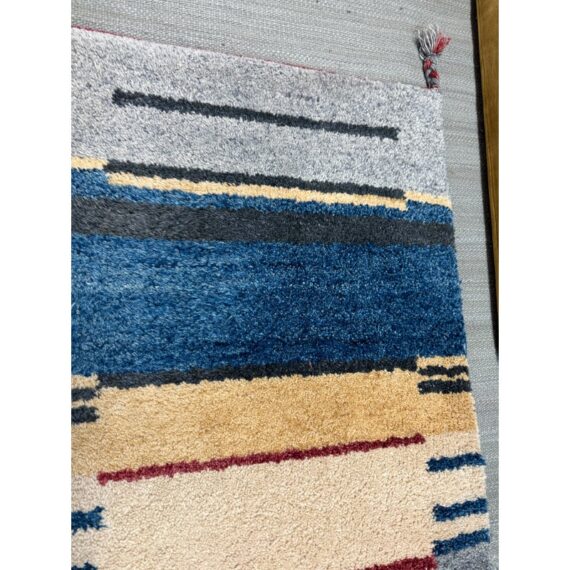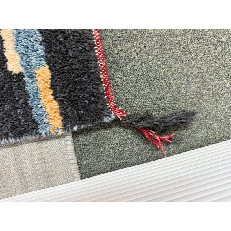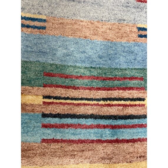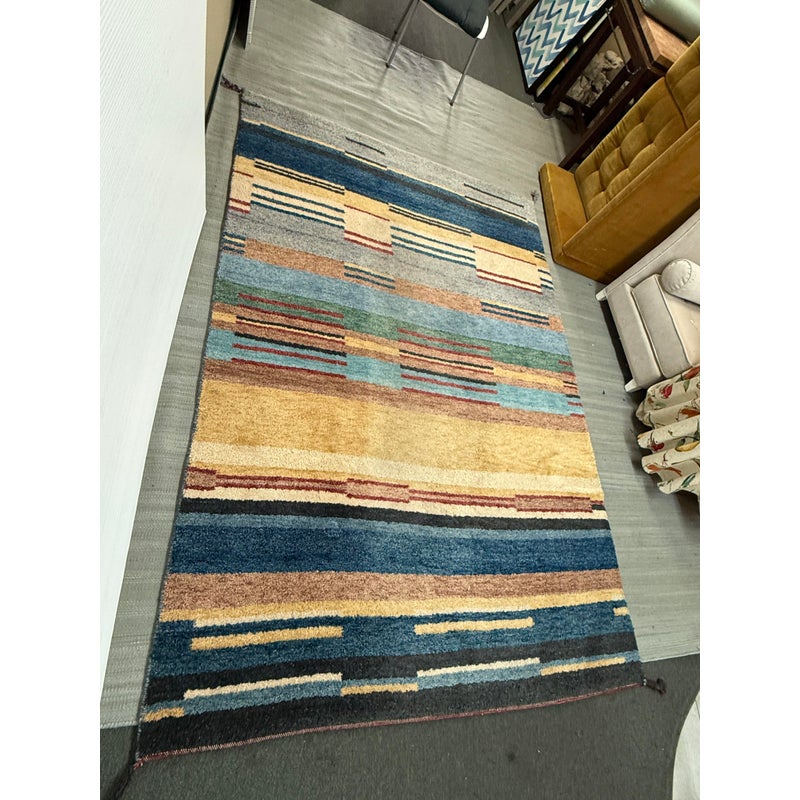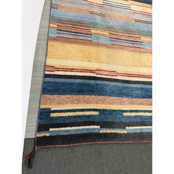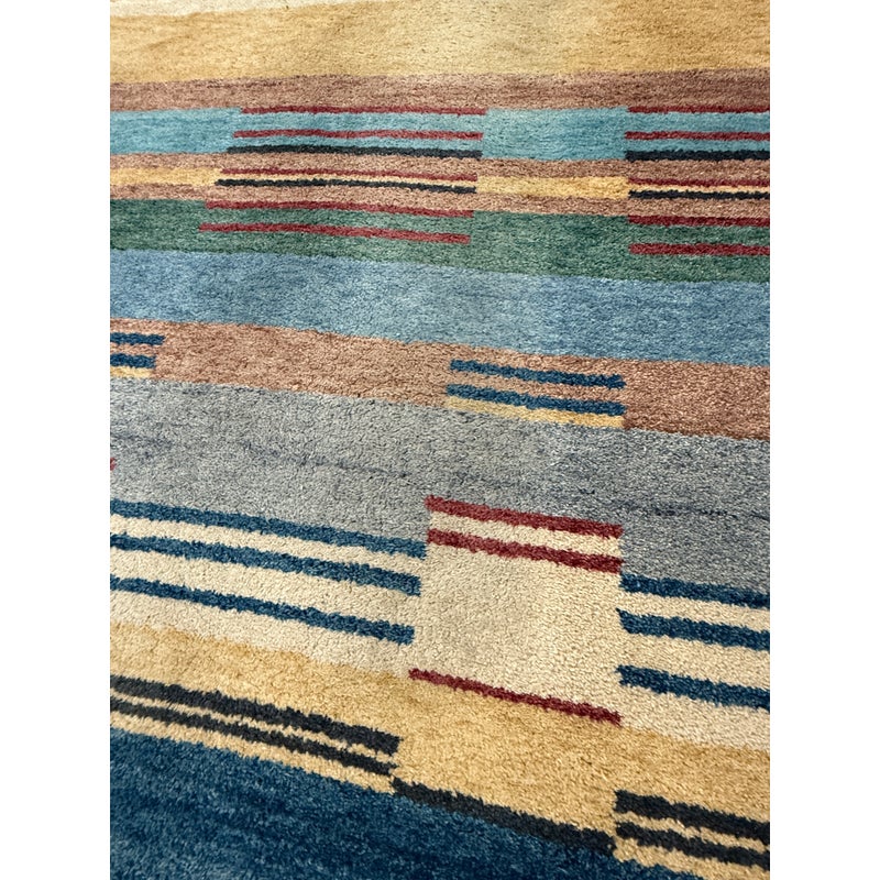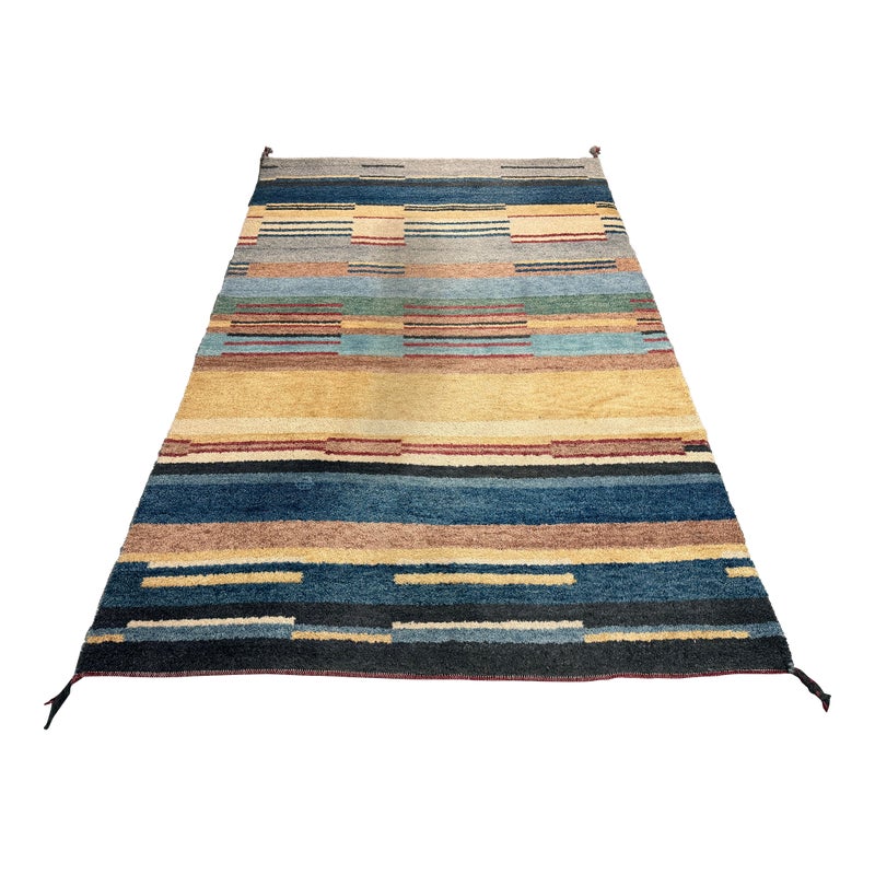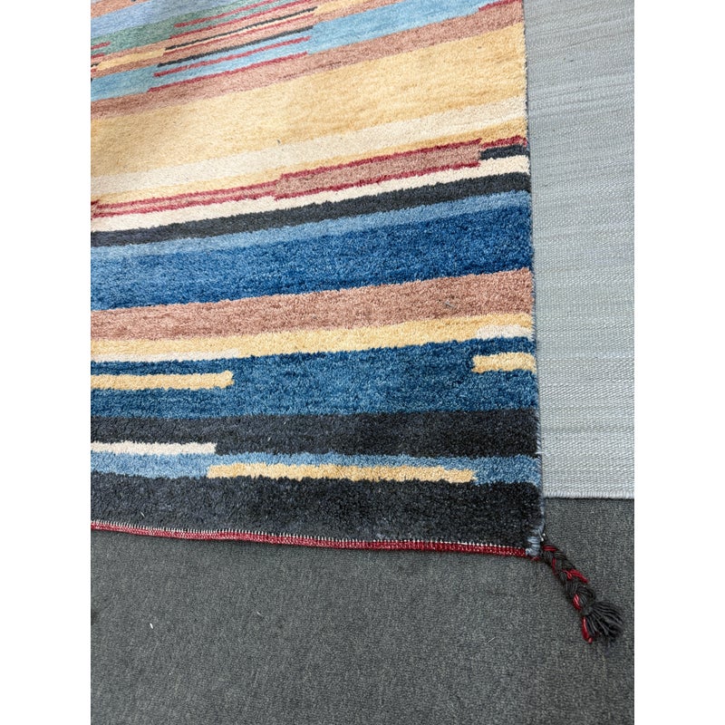 Design Plus Gallery presents a 5ft11in X 8ft11in Contemporary Himalayan Area Rug. A unique abstract that integrates asymmetrical bands of many colors and lengths throughout, from carefully selected 100% Himalayan wool. Hand bound edges are finished with small tassels. Light surface wear; condition is good for age and use.