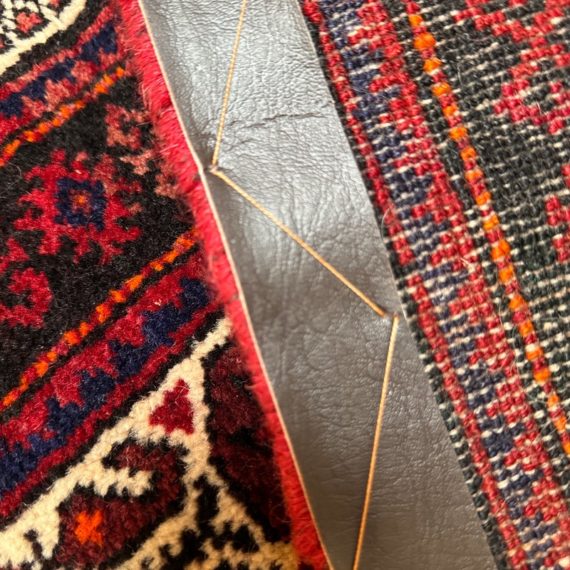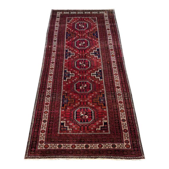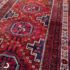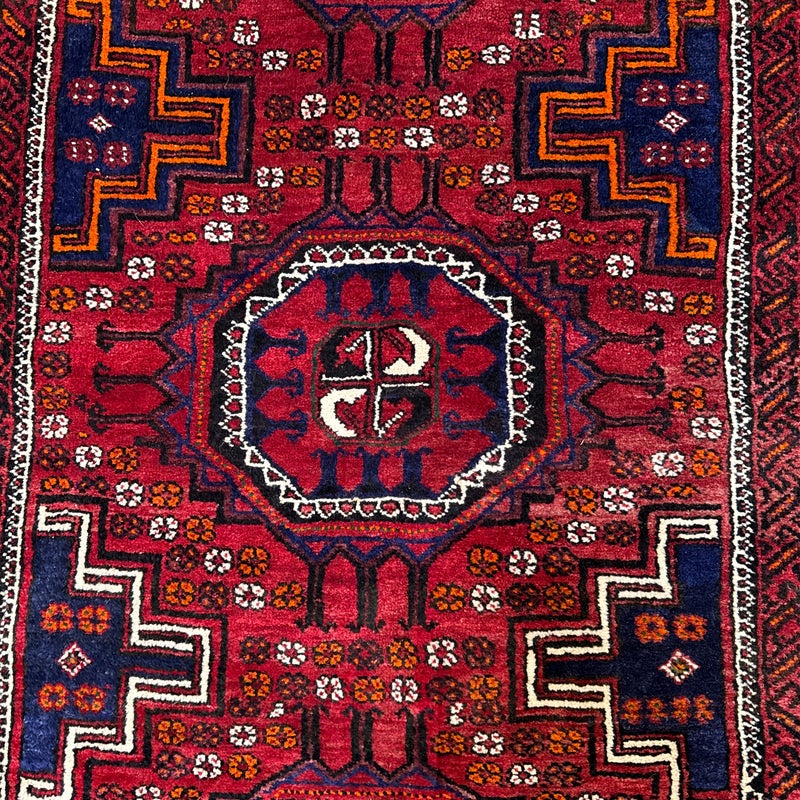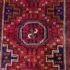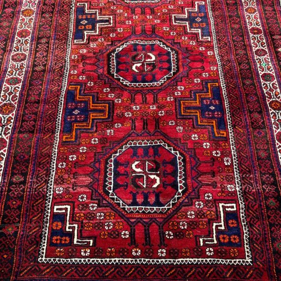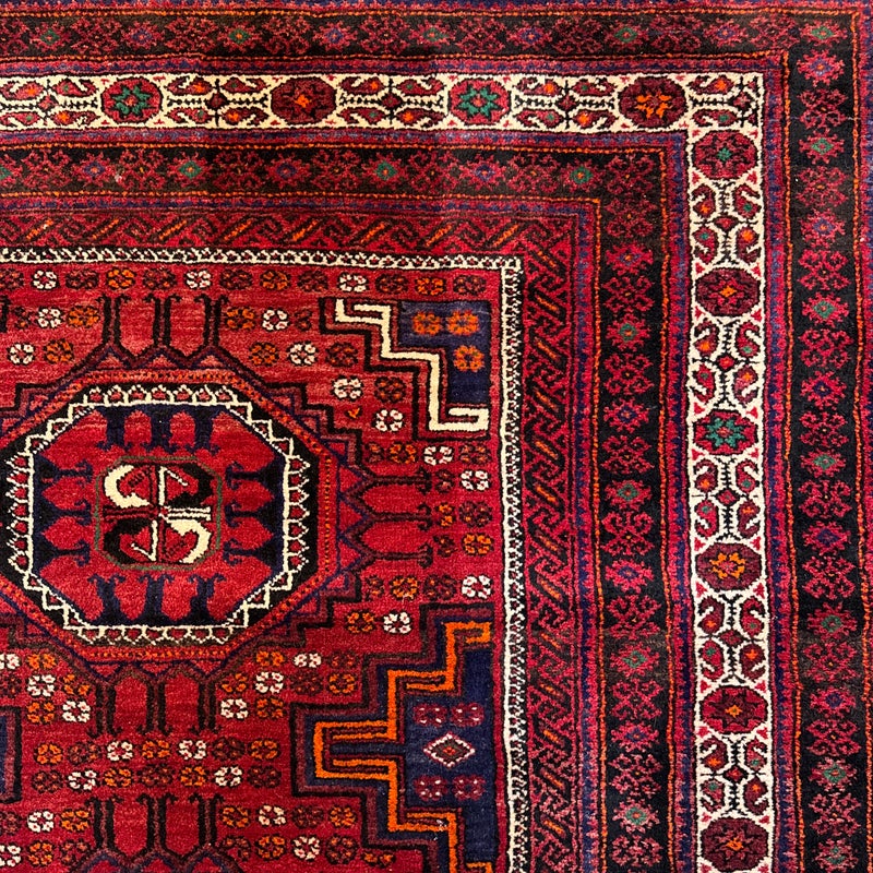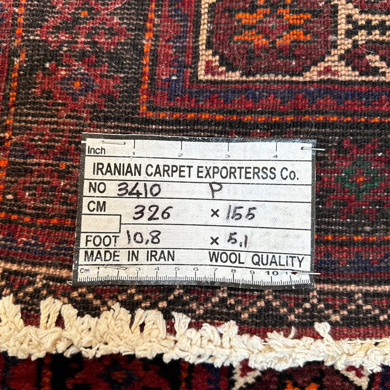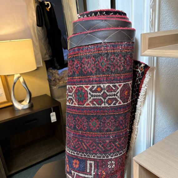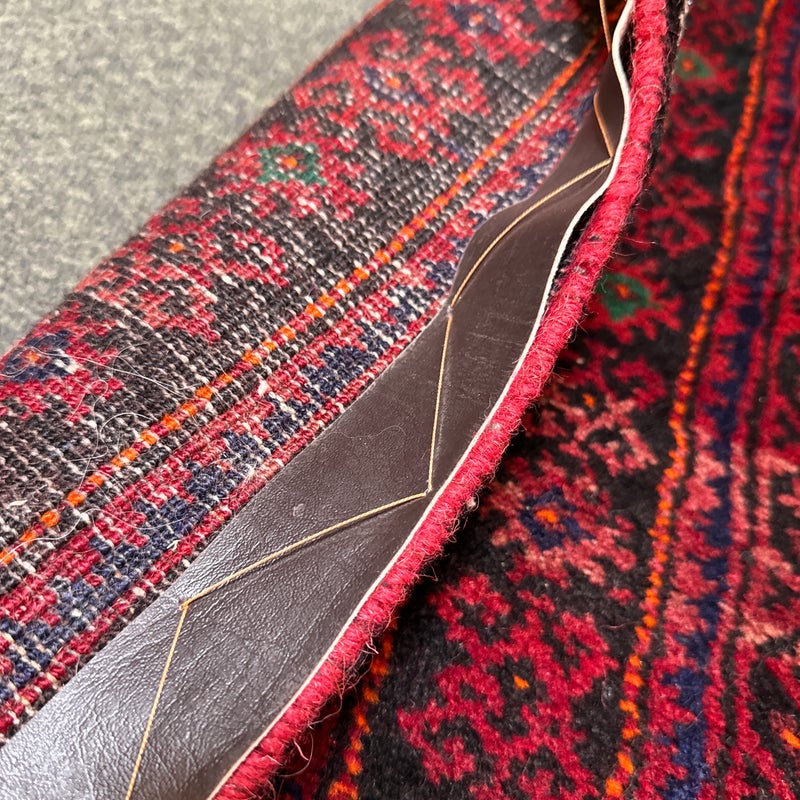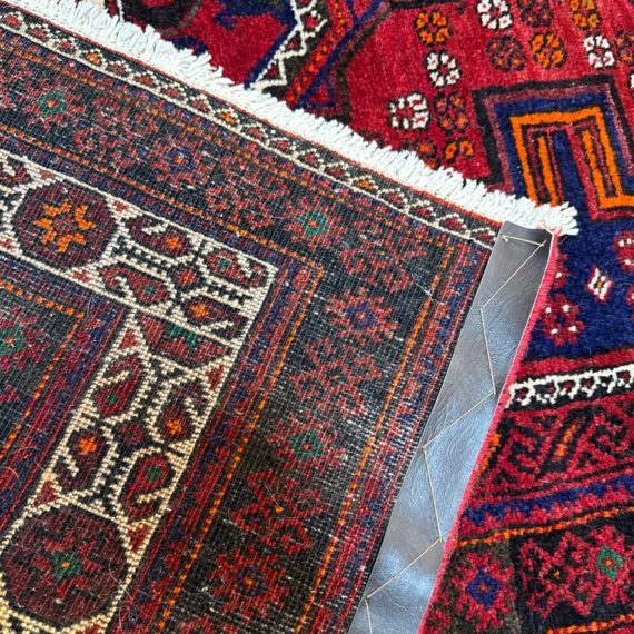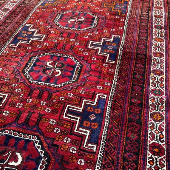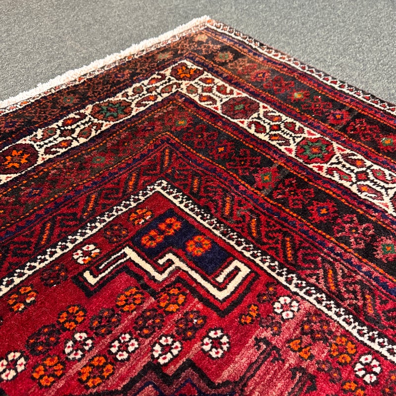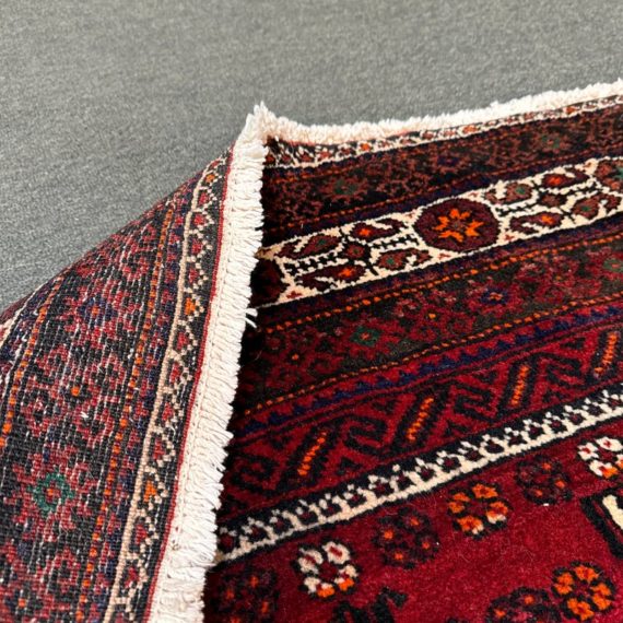 Design Plus Gallery presents a Vintage Persian Area Rug. Beautiful rich shades of red, black and white are handknotted into traditional tribal patterns creating a welcoming floor covering. The all wool rug has short natural fringe, leather binding on back. Little surface wear; condition is good for age and use.