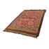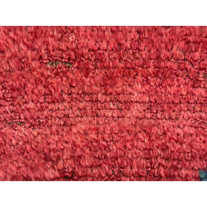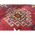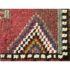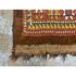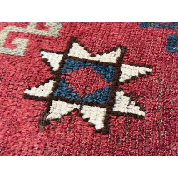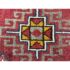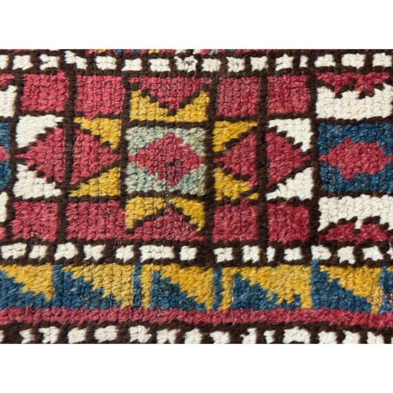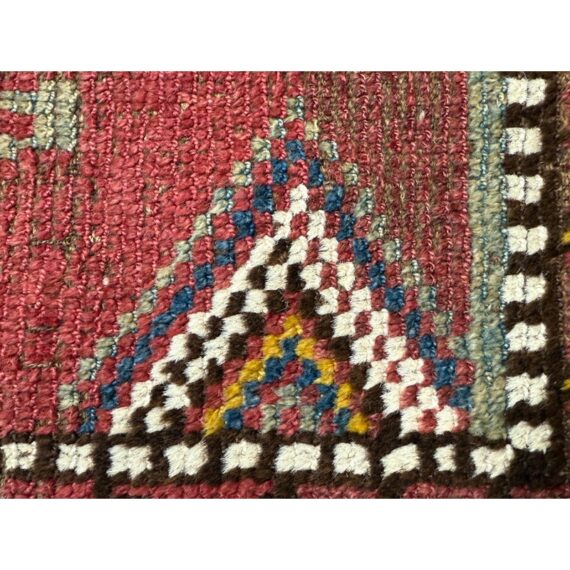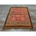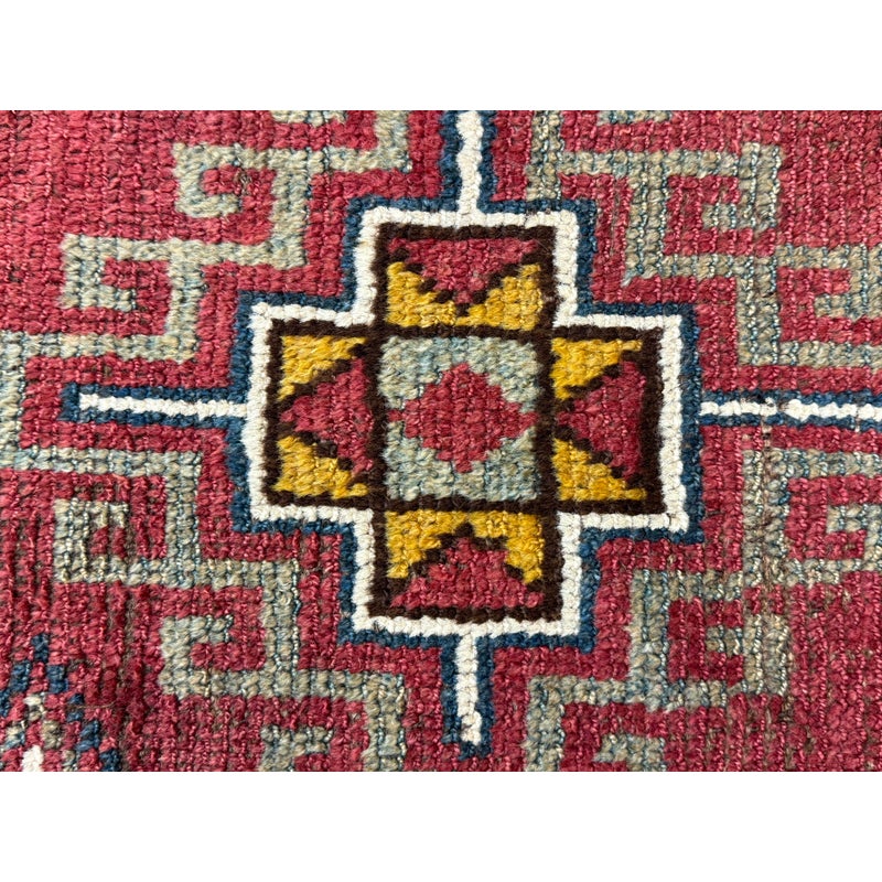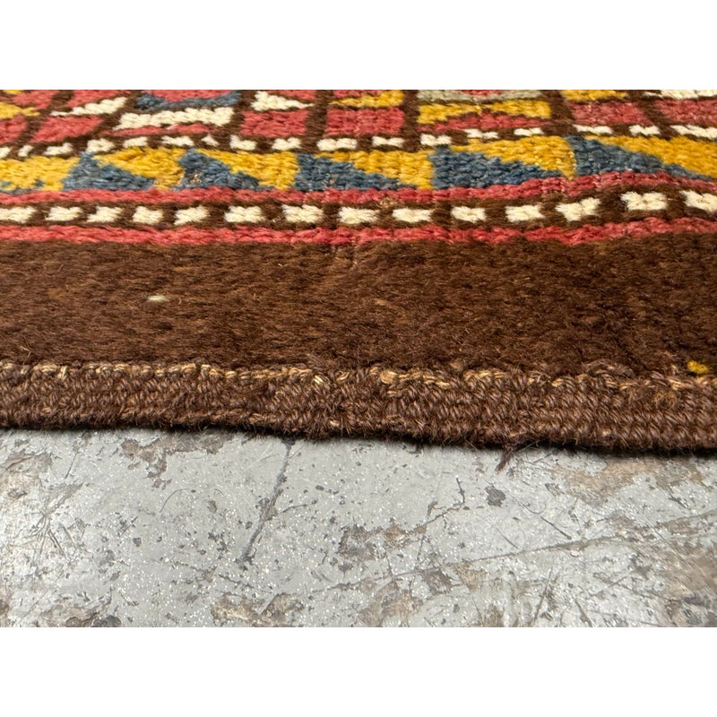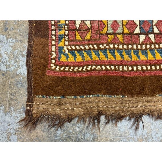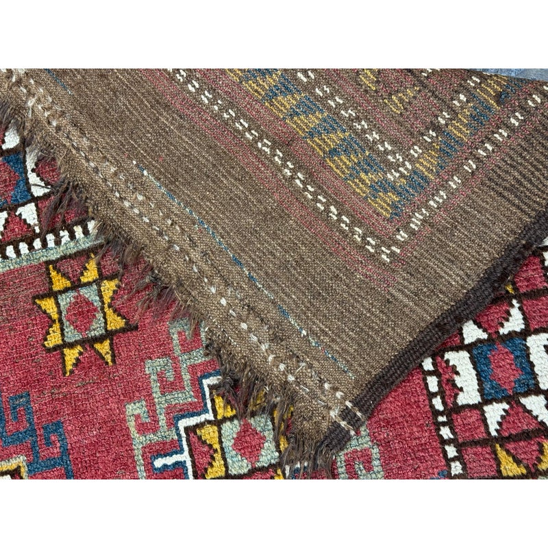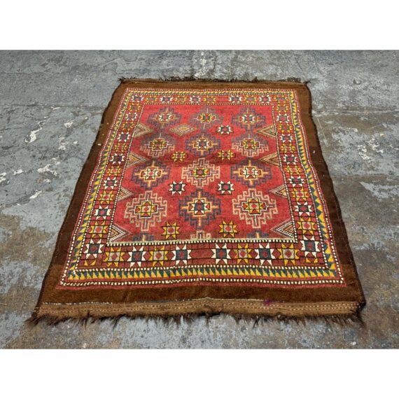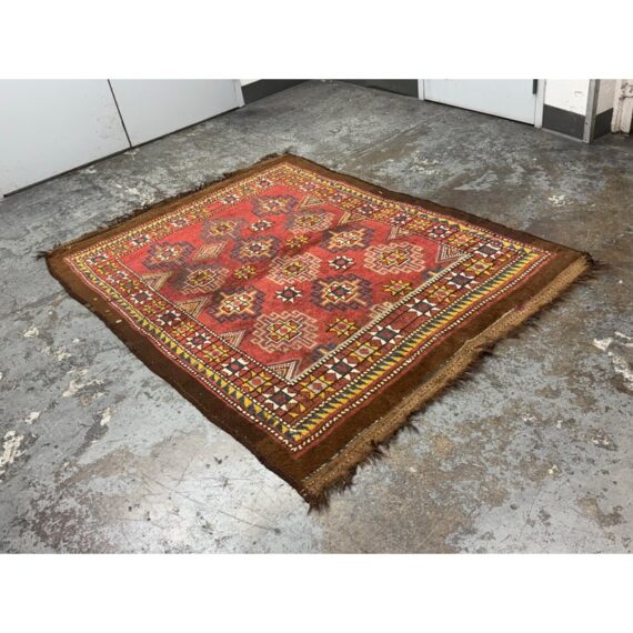 Design Plus Gallery presents 5ft3in X 7ft 3in 19th Century Uzbek, Afghanistan Area Rug. The rug features a predominantly red field with geometric patterns in yellow, white, blue, and black. The design includes repeating motifs of stylized shapes and borders with triangular and linear elements. The rug has a brown border and fringe, showing signs of wear consistent with its age. These types of rugs were often used as floor coverings or decorative pieces in homes and nomadic tents. In good antique condition, visible and minimal wear from usage.