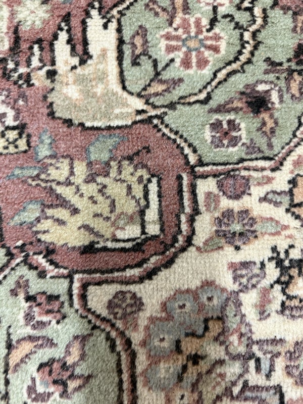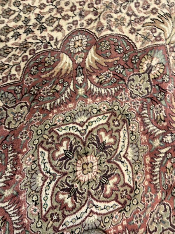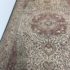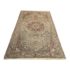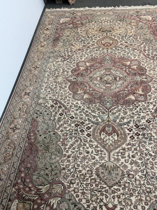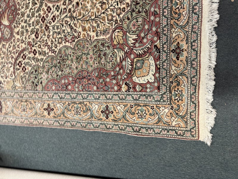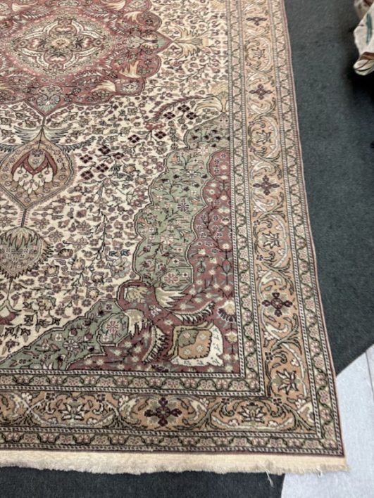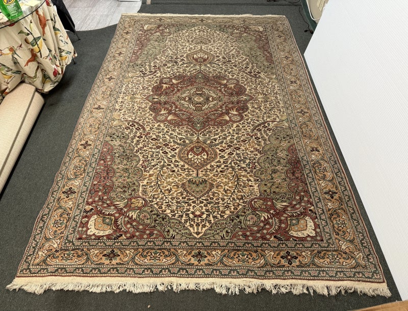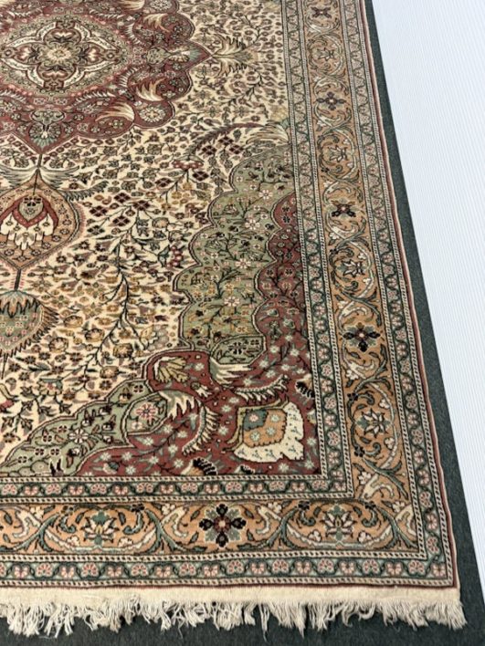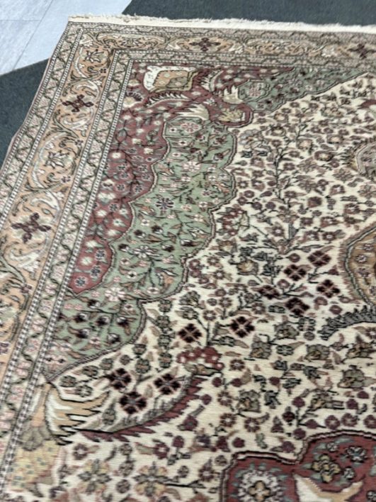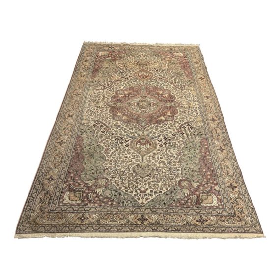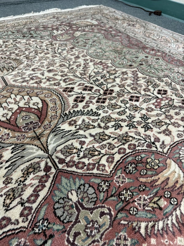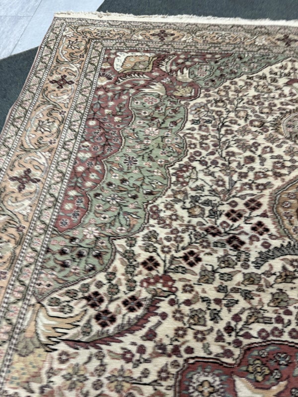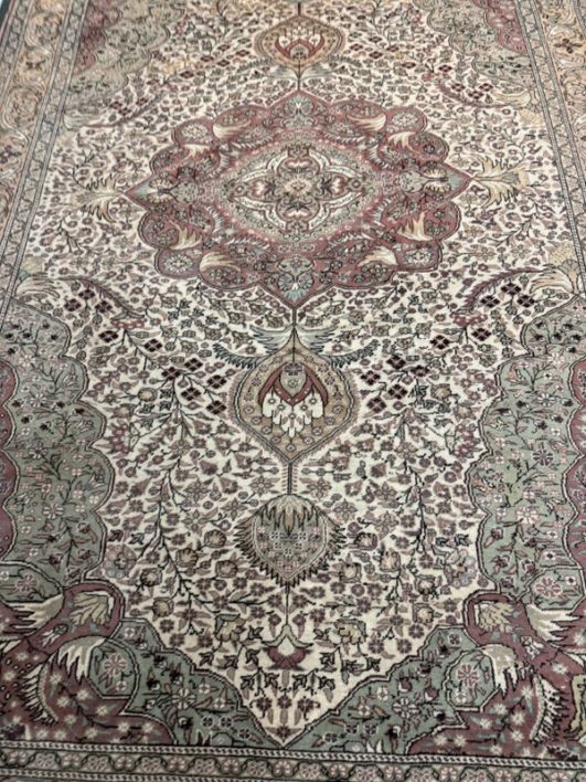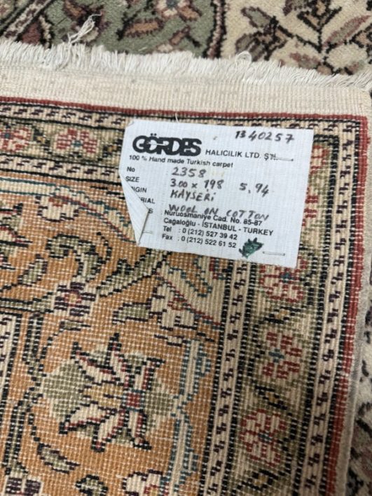 Design Plus Gallery presents a Turkish Area Rug by Gördes. Hand Made in Turkey, the rug is woven of pure cotton and wool, in the the region of Kayseri. This carpet is decorated with intricate and elegant patterns. The central area features a detailed medallion design with floral motifs surrounding it. It has a rich color palette with shades of cerulean, rose pink and tan plus it is handcrafted with their traditional hand weaving techniques. Does show some minimal wear that is considered consistent with its age + use.