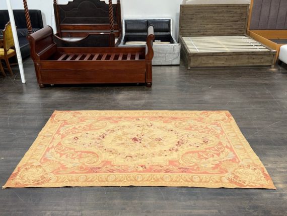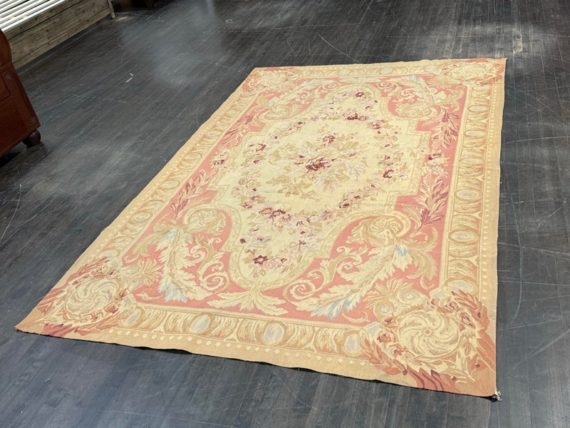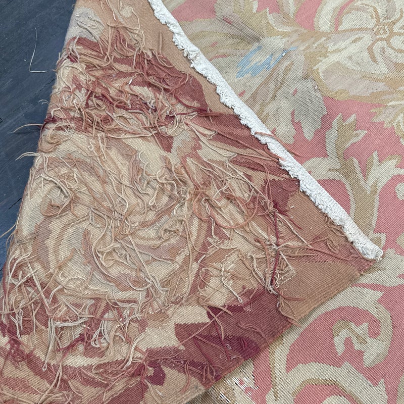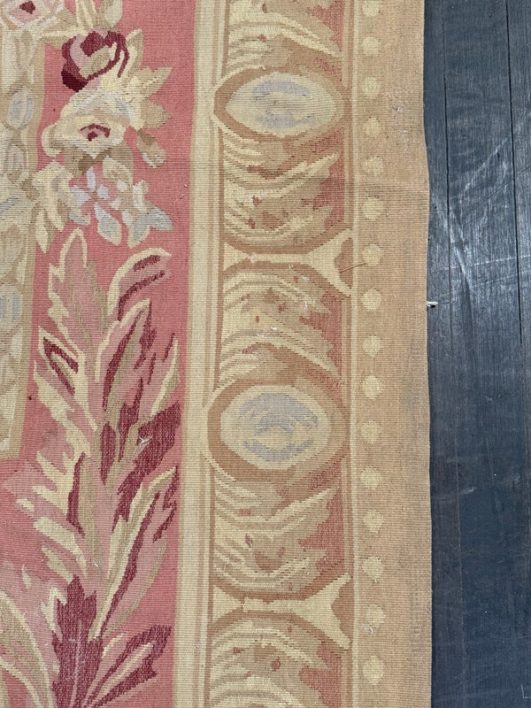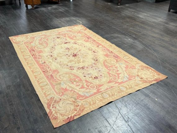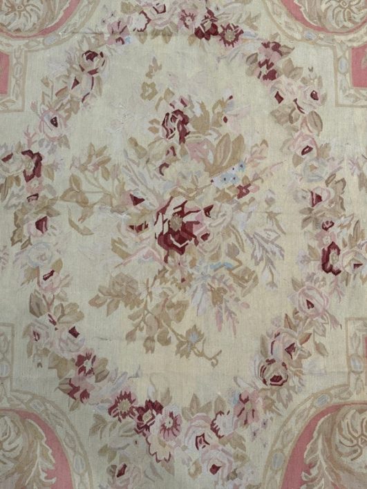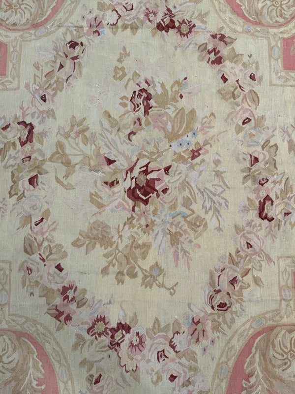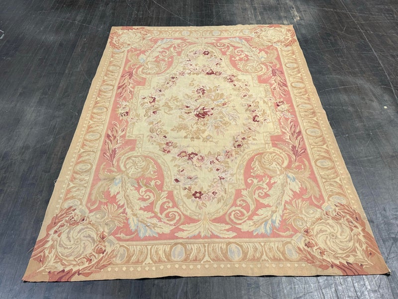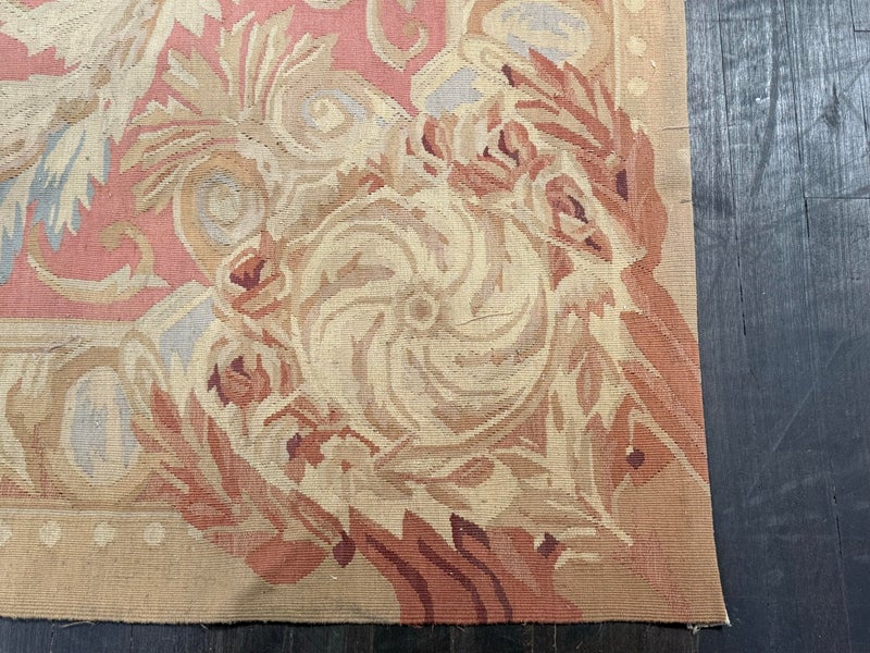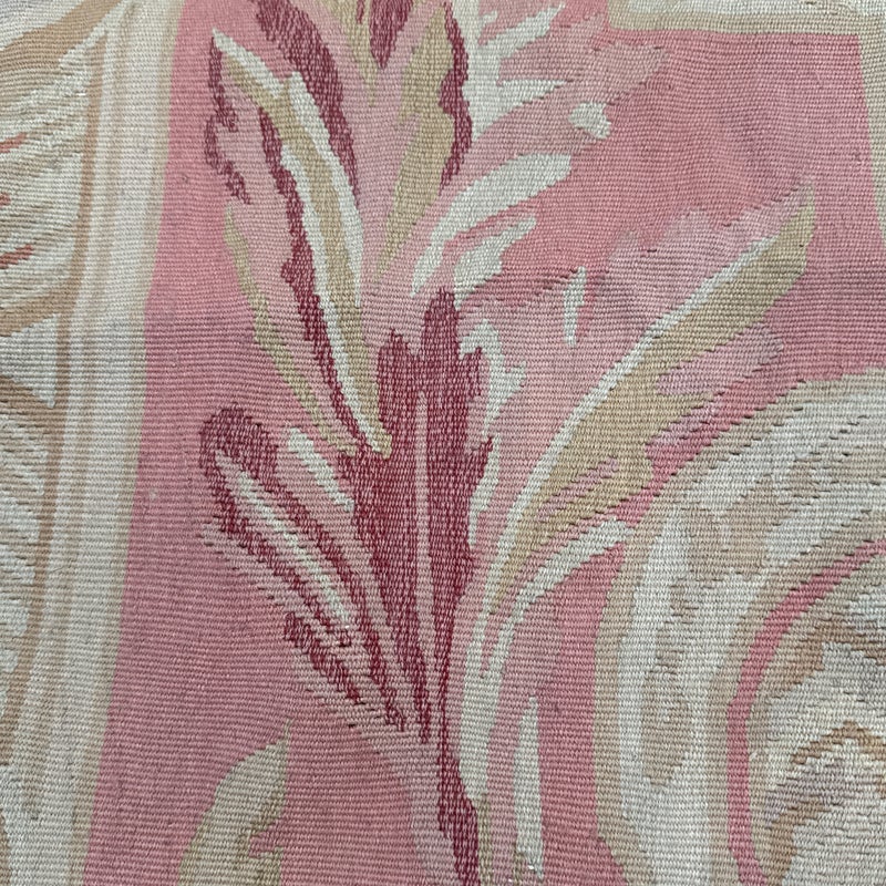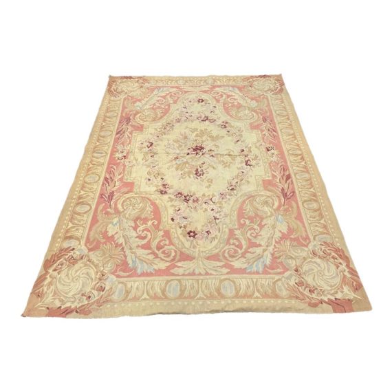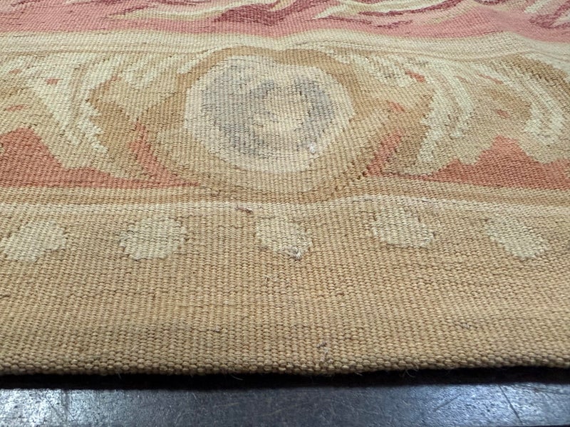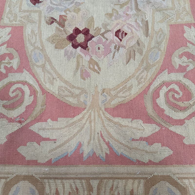 Design Plus Gallery presents a Aubusson French Louis XVI + Flower Cartridge 6ft x 8ft 5inches Size. Likely from the 19th Century the wall hanging is of flat weave construction. Feminine in its nature with a golden tan and rose pink as the primary colors. Flowers of deeper red with pink are present and light blue in some details as well. Is in good condition with visible and minimal signs of wear for use and age.