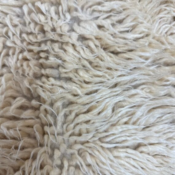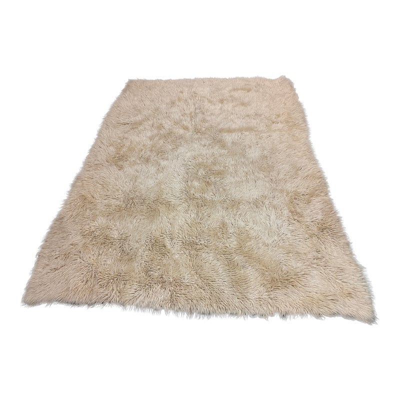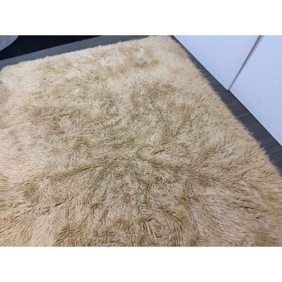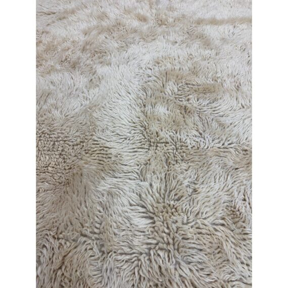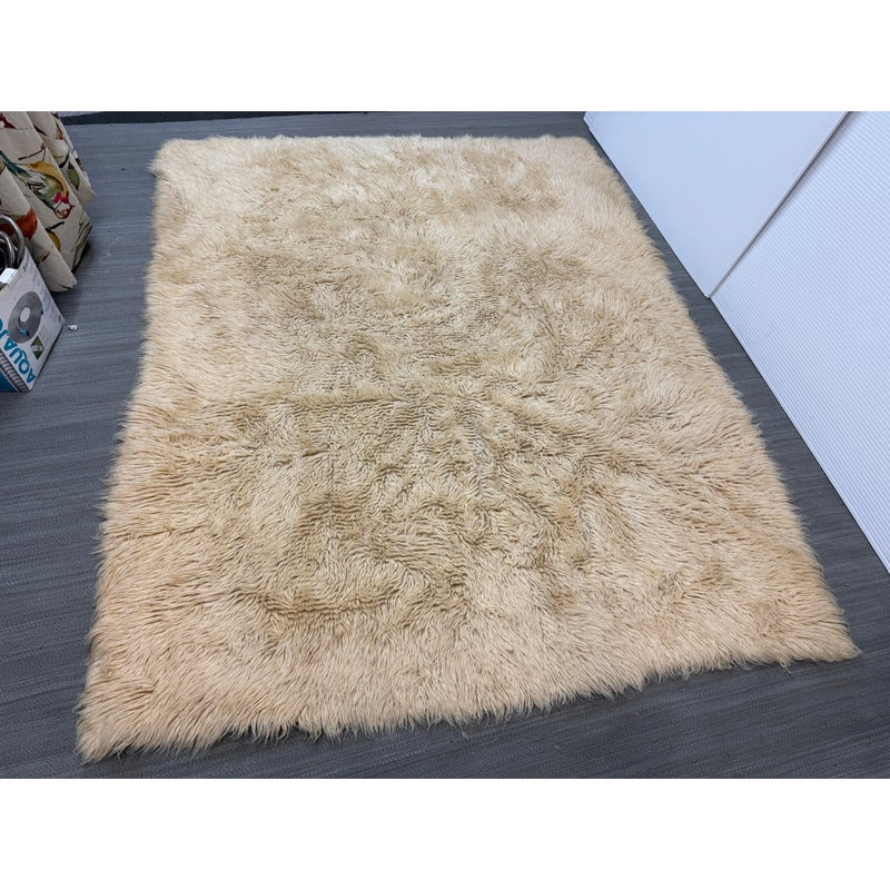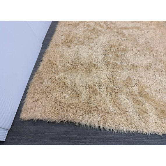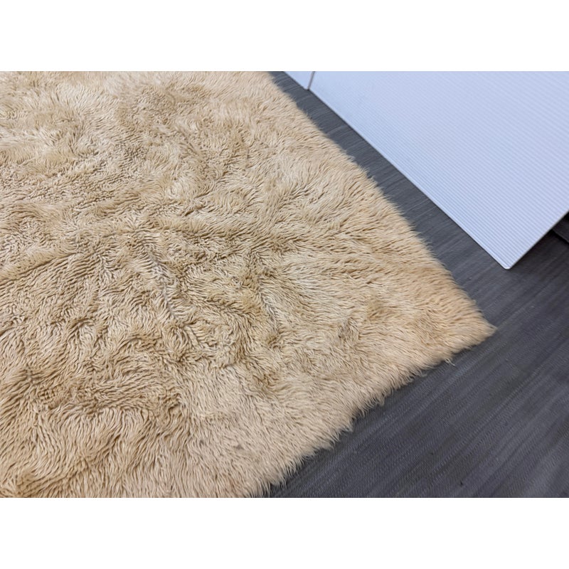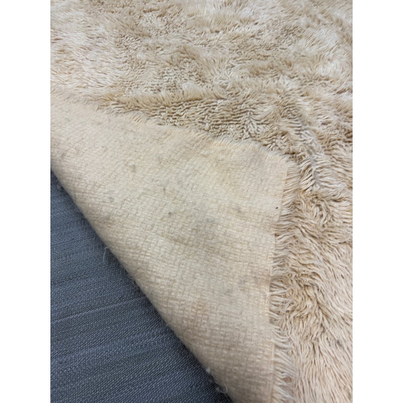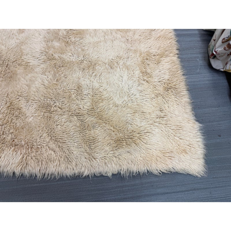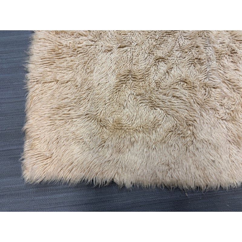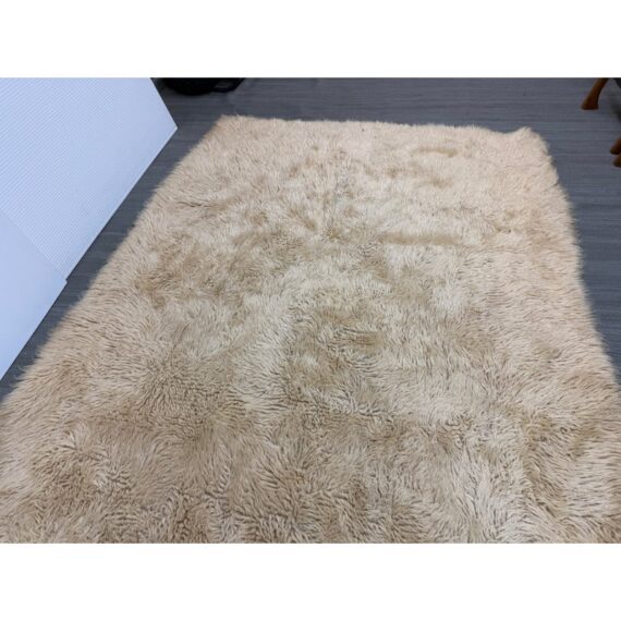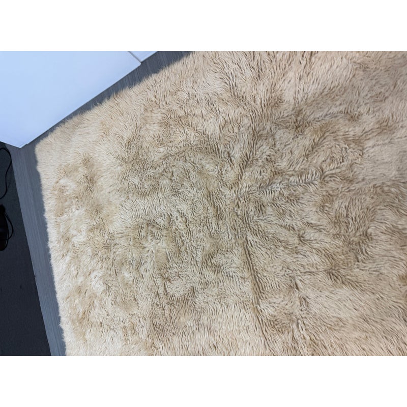 Design Plus Gallery presents a 6ft X 9ft Flokati Fur Area Rug. Organic modern blanket for your space is rich with a soft texture in a light cream tone. There is visible wear through out, rug is in good condition.