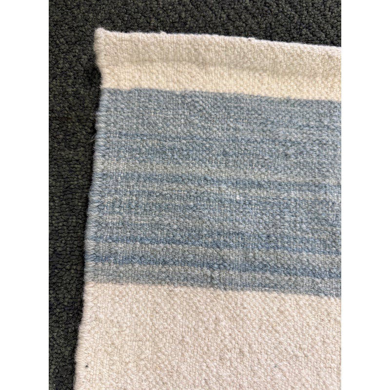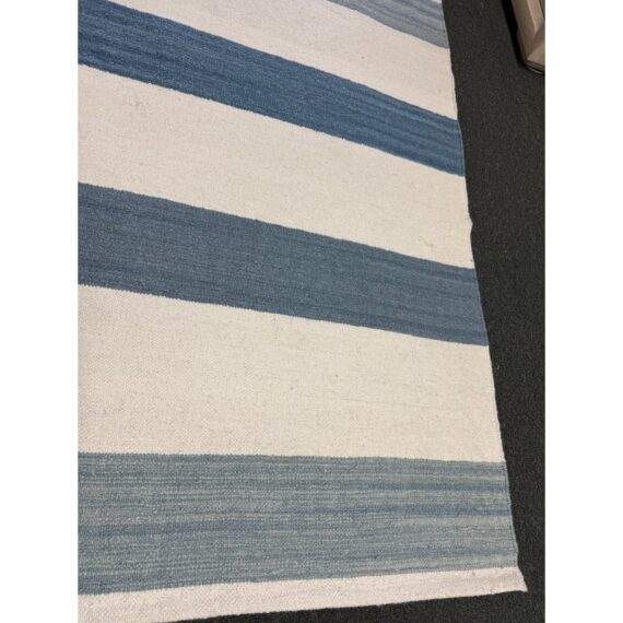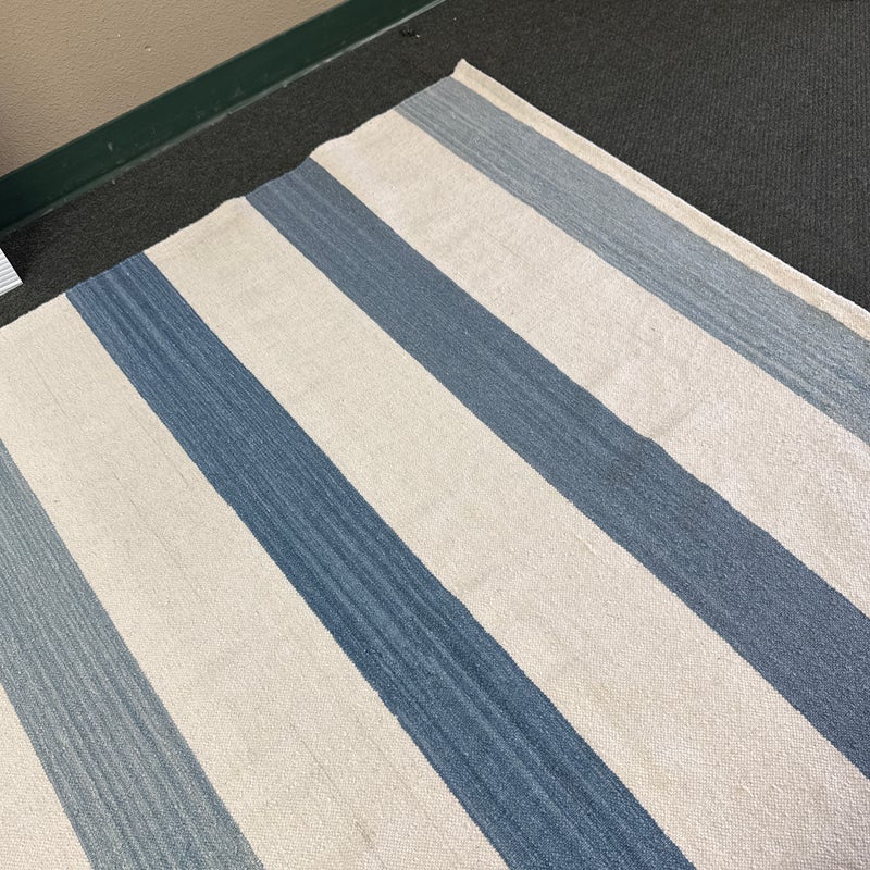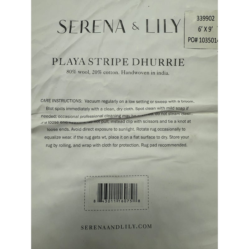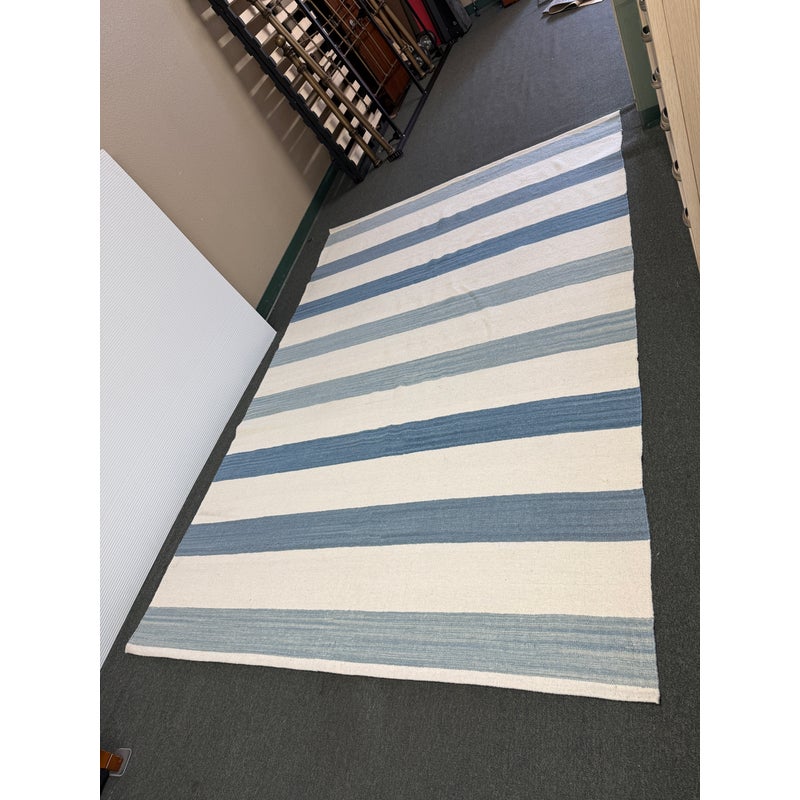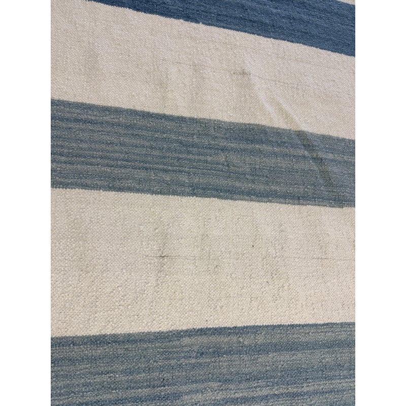 Design Plus Gallery presents the 6ft2in × 9ft2in Playa Stripe Rug by Serena & Lily. The flatweave dhurrie is handwoven in India from 80% wool and 20% cotton in variegated blue wide stripes against a natural background. Light and airy, casual and comfortable for any space. Little wear; condition is good.
