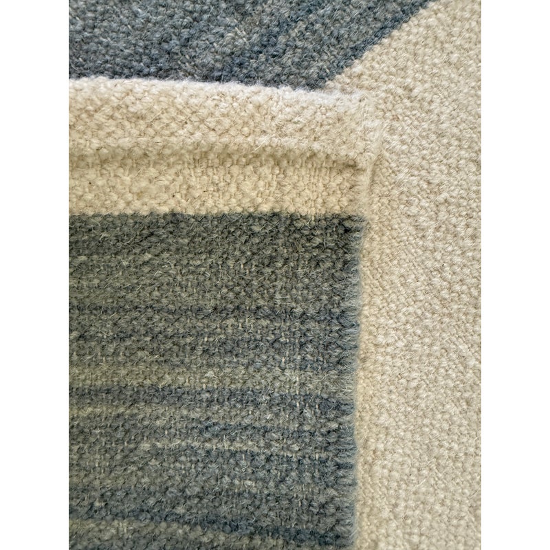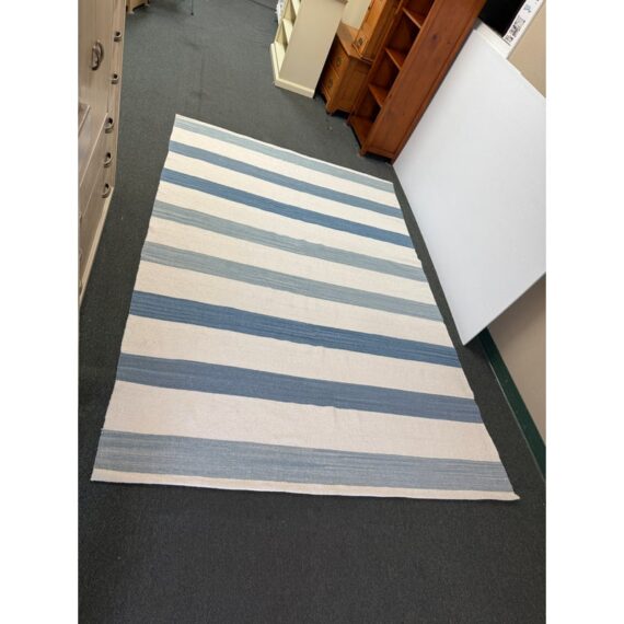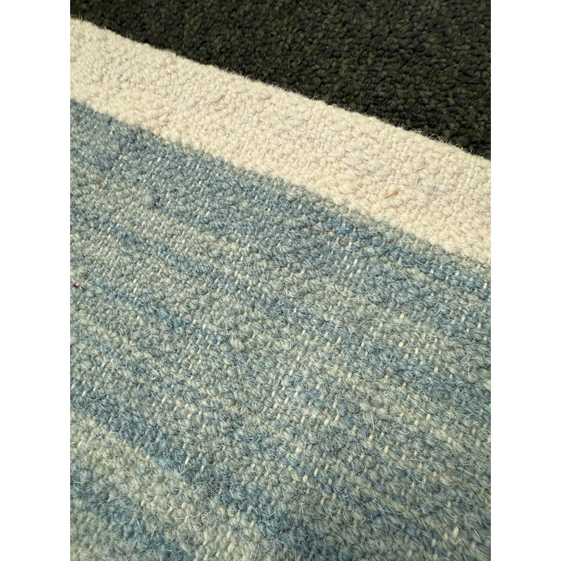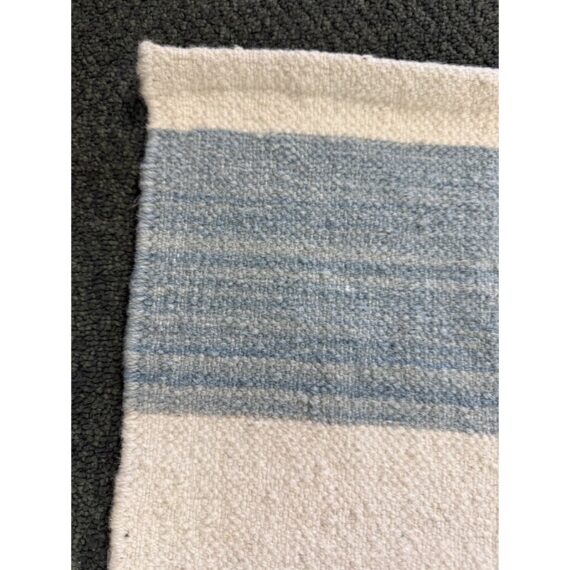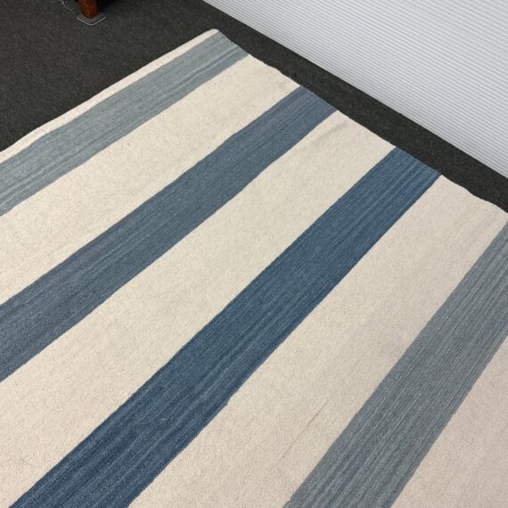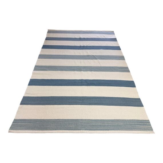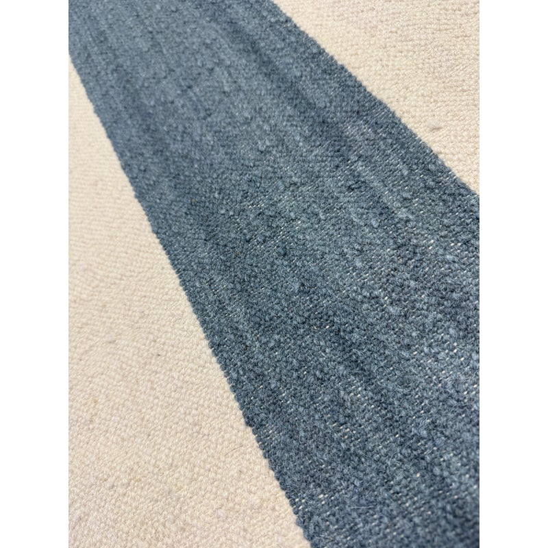 Design Plus Gallery presents the 6ft2in × 9ft2in Playa Stripe Rug by Serena & Lily. The flatweave dhurrie is handwoven in India from 80% wool and 20% cotton in variegated blue wide stripes against a natural background. Light and airy, casual and comfortable for any space. Little wear; condition is good.