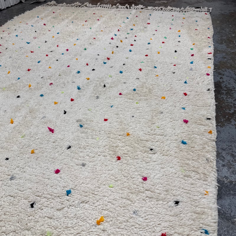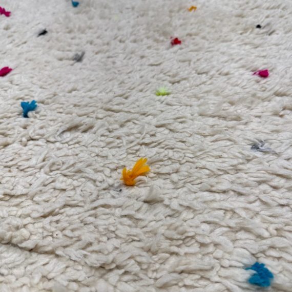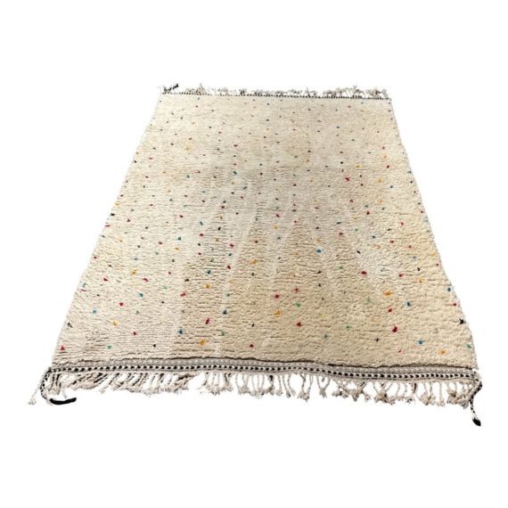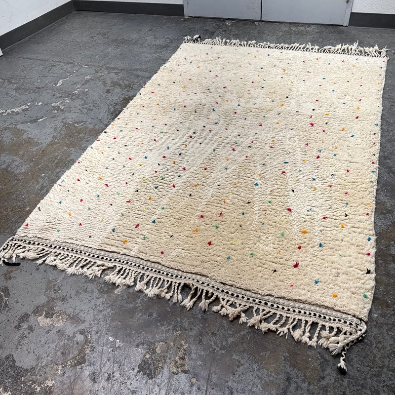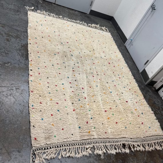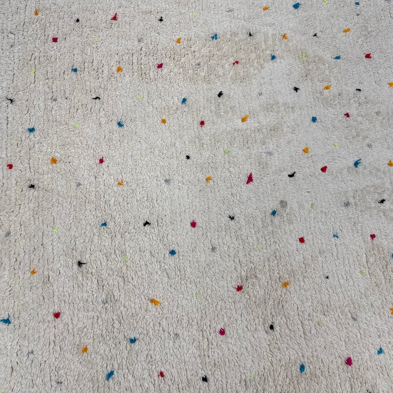 Design Plus Gallery presents a 6ft6in × 9ft8in Vintage Beni Ourain Moroccan Area Rug. This white moroccan rug, made in the highest mountains of Morocco by hardworking tribeswomen who made sure to make it perfect for you. Sprinkles of pop of colors are thought the rug. In good condition, visible and minor wear from usage + age. Minor spot cleaning needed.