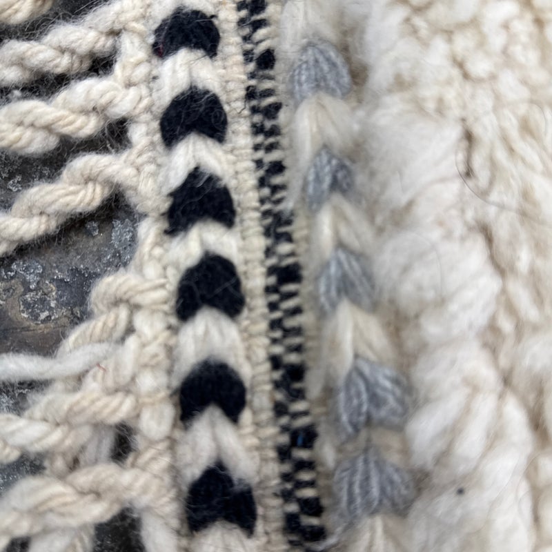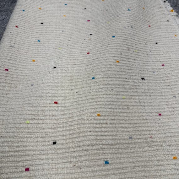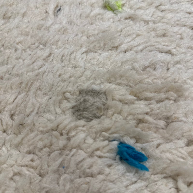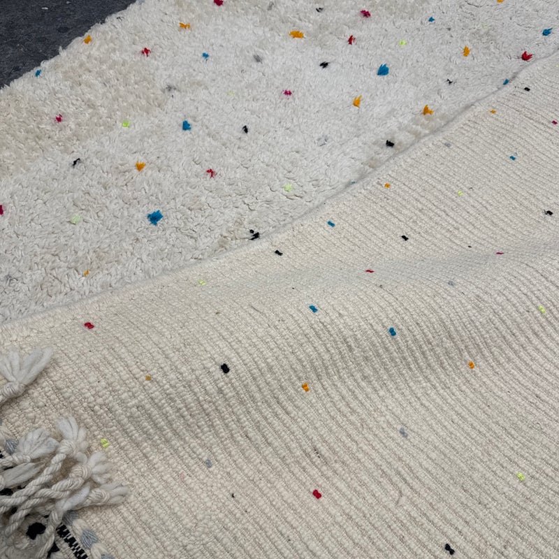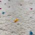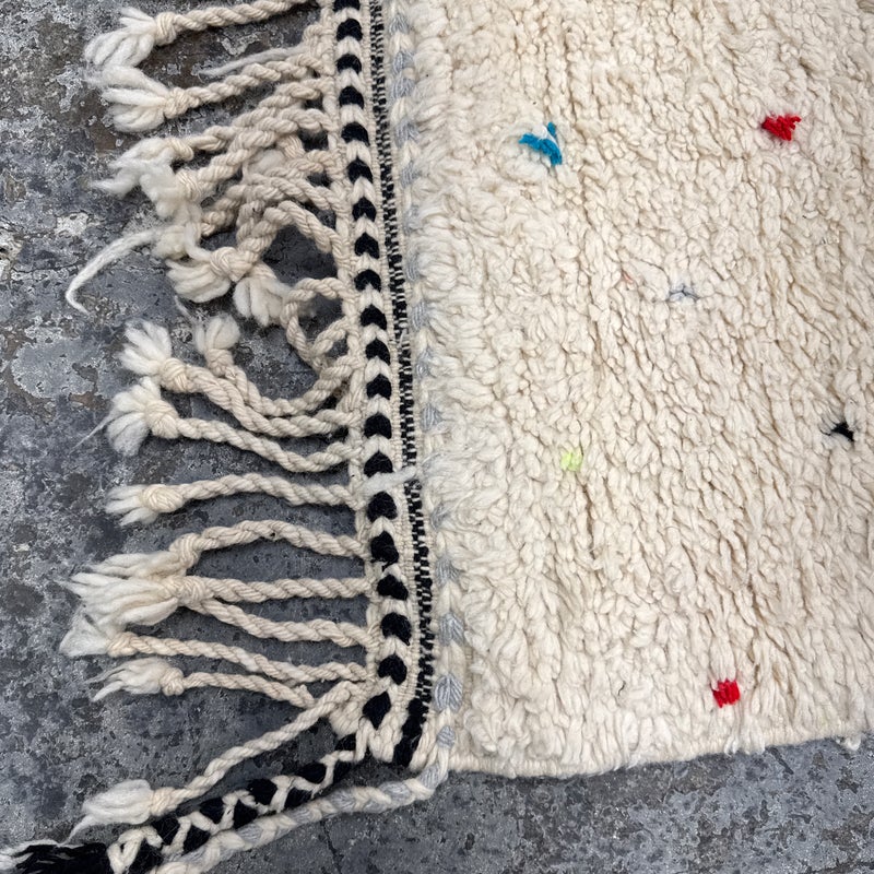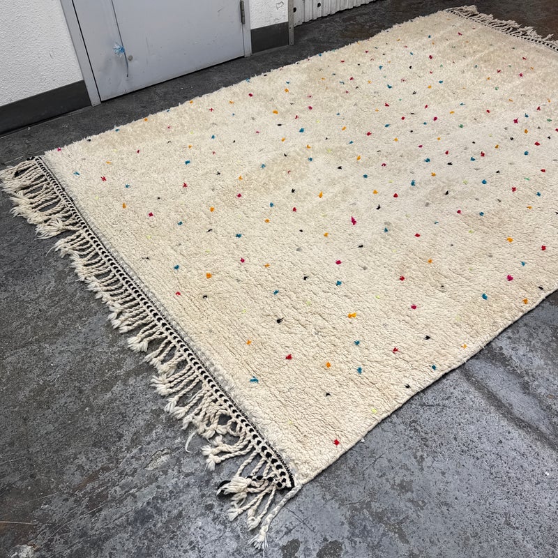 Design Plus Gallery presents a 6ft6in × 9ft8in Vintage Beni Ourain Moroccan Area Rug. This white moroccan rug, made in the highest mountains of Morocco by hardworking tribeswomen who made sure to make it perfect for you. Sprinkles of pop of colors are thought the rug. In good condition, visible and minor wear from usage + age. Minor spot cleaning needed.