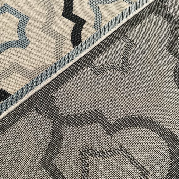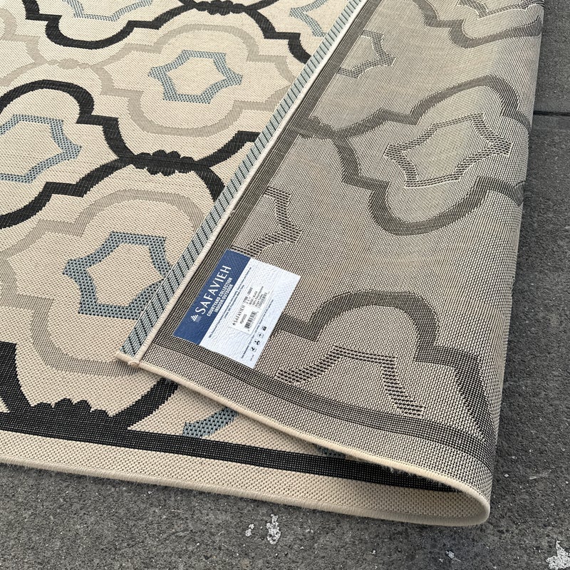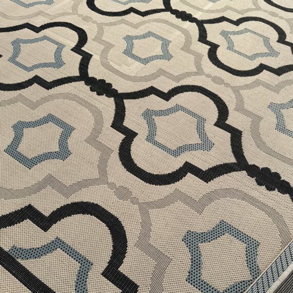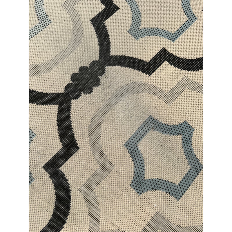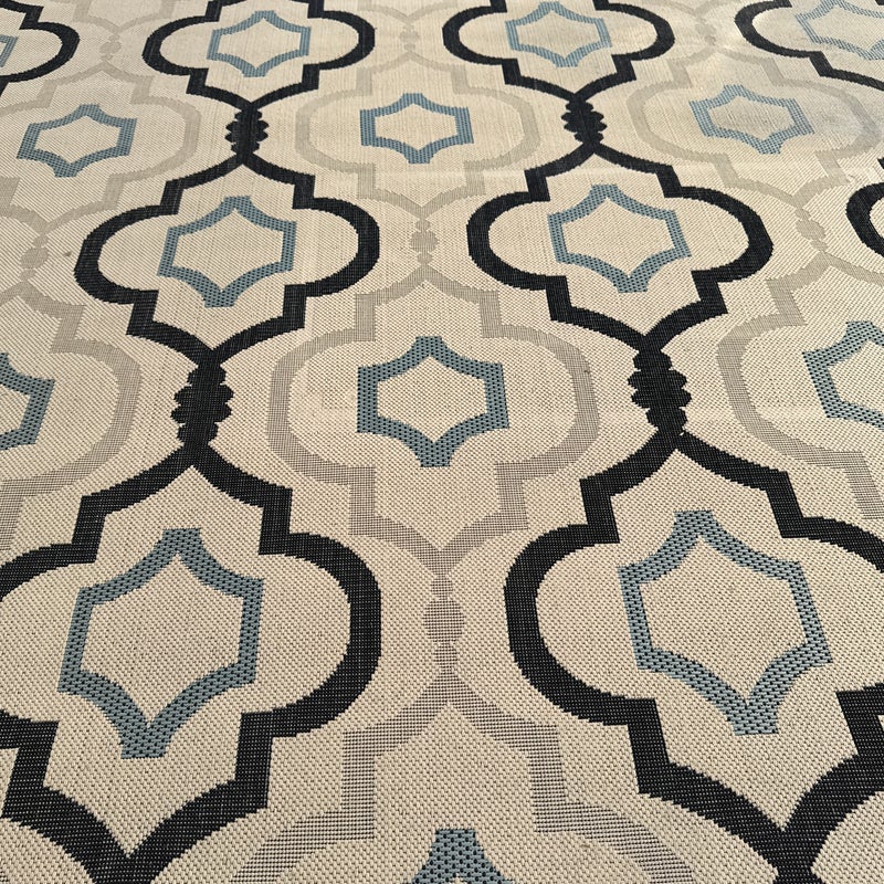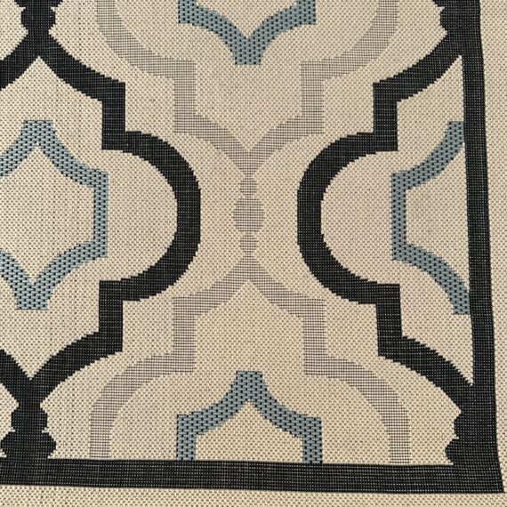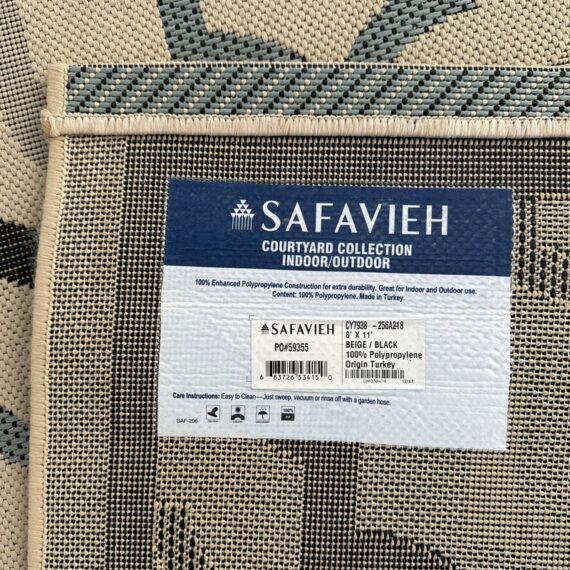 Design Plus Gallery presents the 7ft 10in × 10ft 9in Courtyard Collection Area Rug by Safavieh. The area rug has construction for durability with ability to use inside and outside. The tones are bright with a denim blue and black geometric pattern that repeats through its entirety. It is a breeze to clean and can be rinsed off, swept and/or vacuumed. The rug is in good condition with minimal signs of wear for its usage. Made in Turkey.