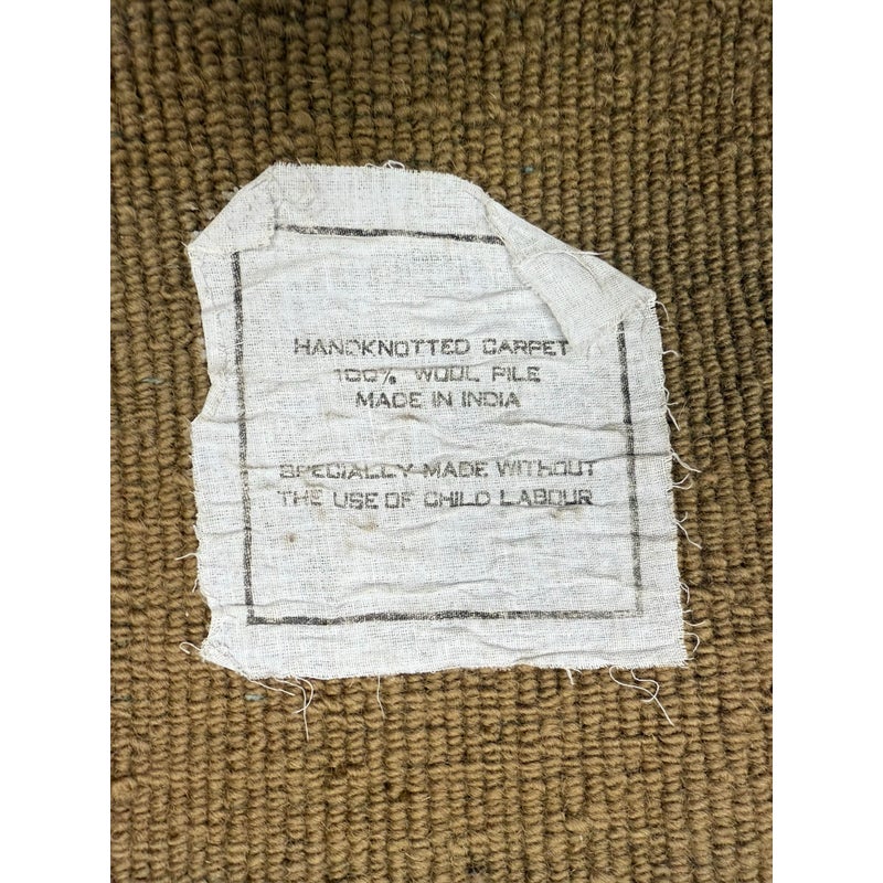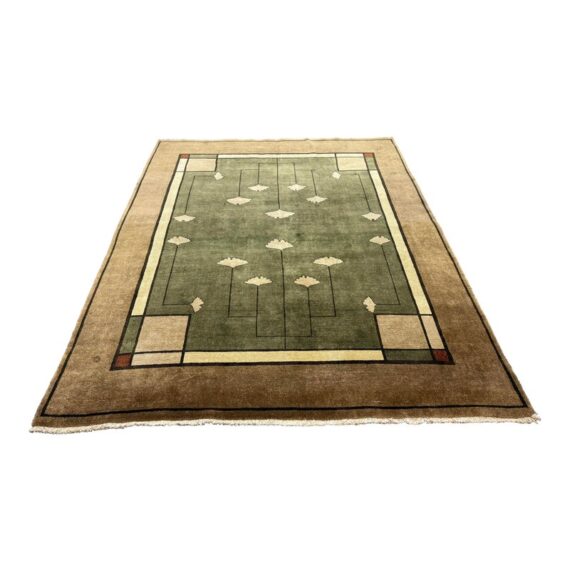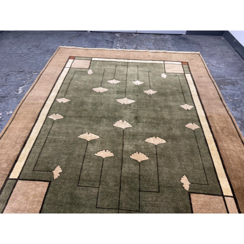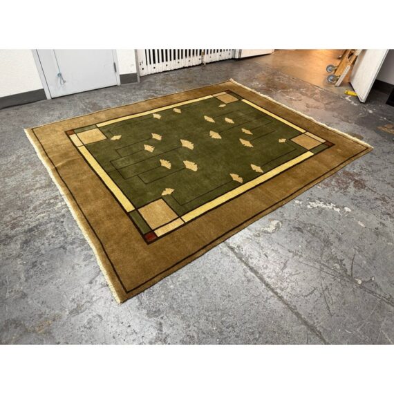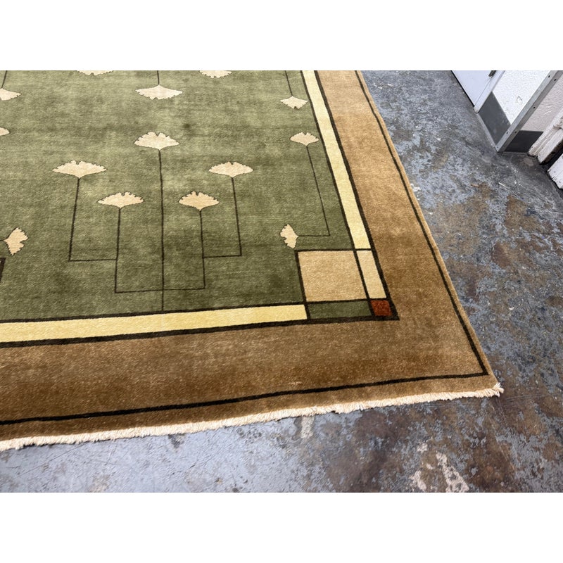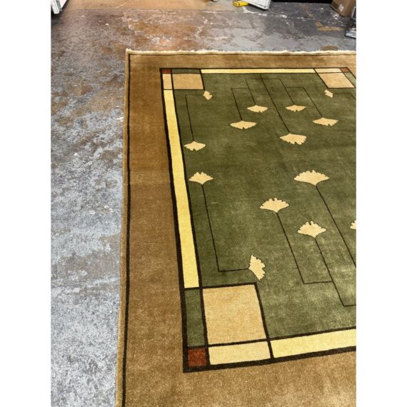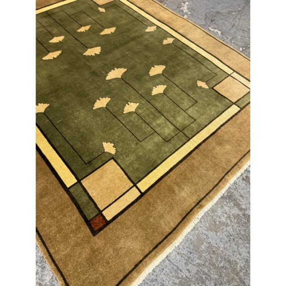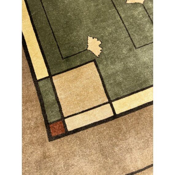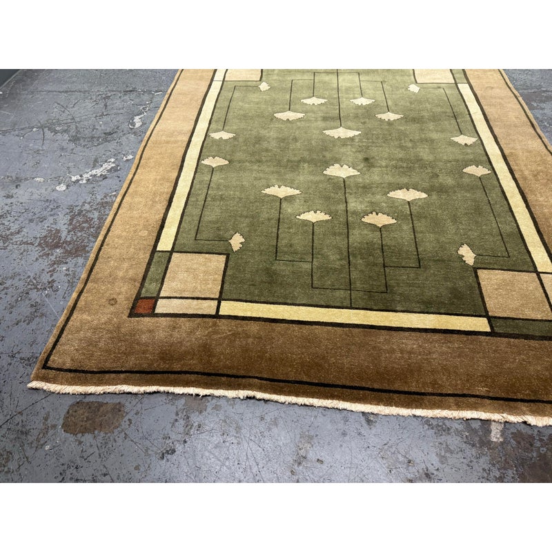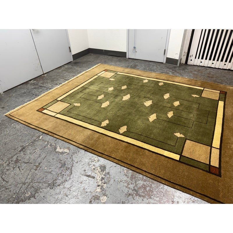 Design Plus Gallery presents a 7ft 11in × 9ft 10in Hand Knotted Prairie Style Area Rug. The rug offers botanical elements with its incorporation of the Asiatic ginkgo leaf is also emphasized with clean lines, horizontal elements, and a deep connection to the natural environment. There are shades of camel, sage and medium brown with burgundy accents. Is made with the use of pure New Zealand wool that ensures the colors will last. In good condition, visible and minimal wear from usage.