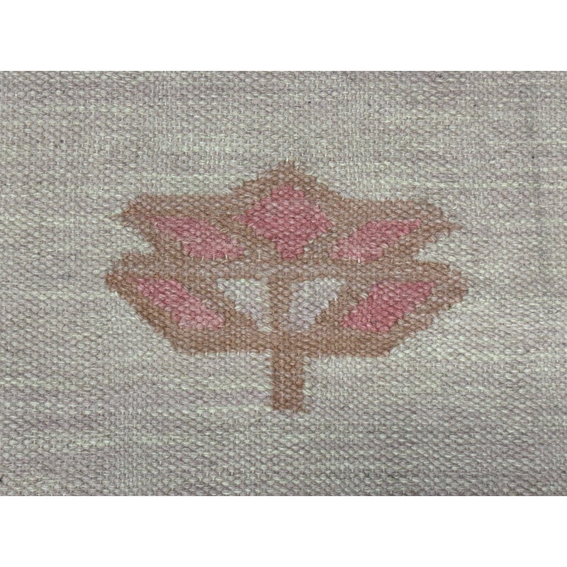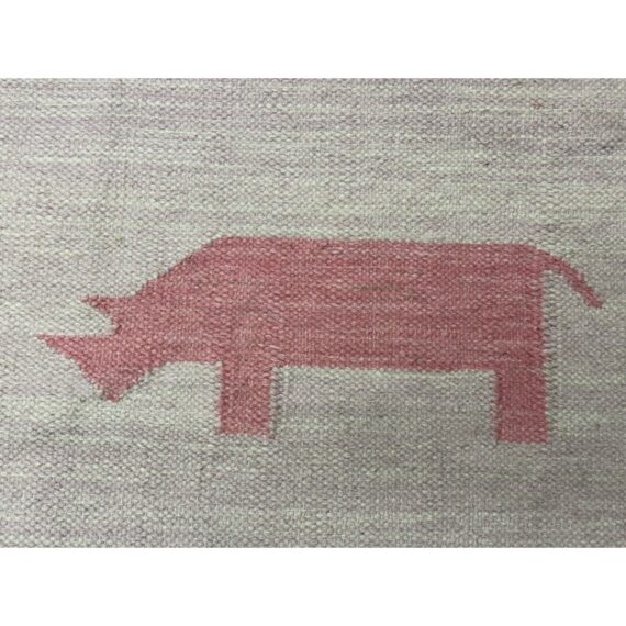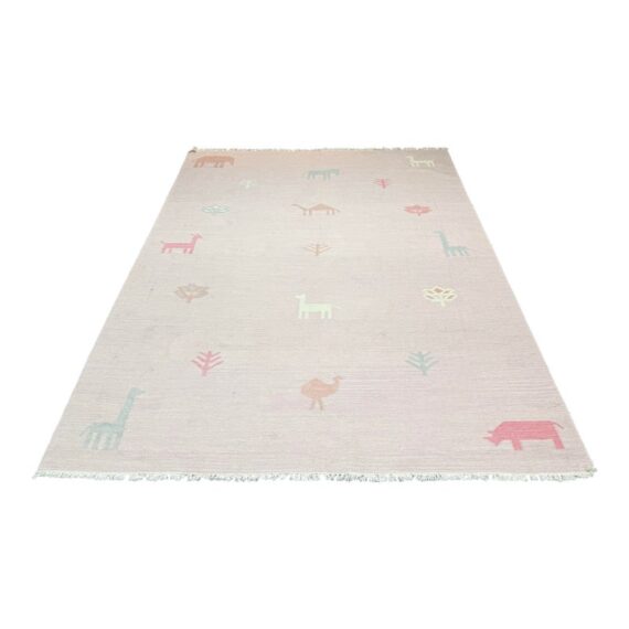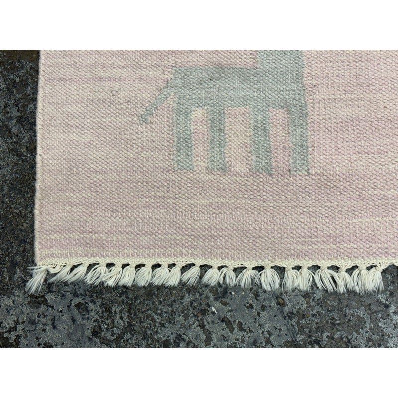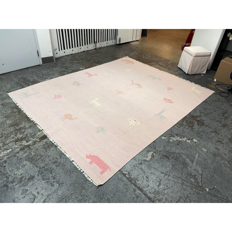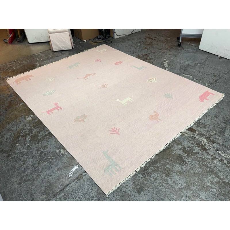 Design Plus Gallery presents the Porter Pink Hand Woven Wool Area Rug from Momemi Thompson Collection by Erin Gates. Timeless hand woven carpet techniques enhance the artisanal quality of this decorative area rug. Captured in colors ranging from pastel pink and ivory to denim blue and dove gray, fringed edges feel utterly bohemian beside bold geometric patterns and tribal motifs. Renown for its superior wear and stain resistance, 100% natural wool fibers make each decorative floor covering a true statement piece with sustainable beauty. It shows faint areas of wear but overall is in good condition for its usage.