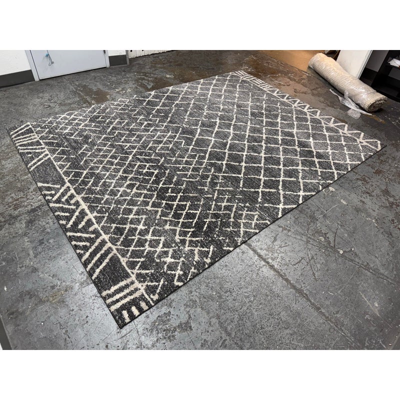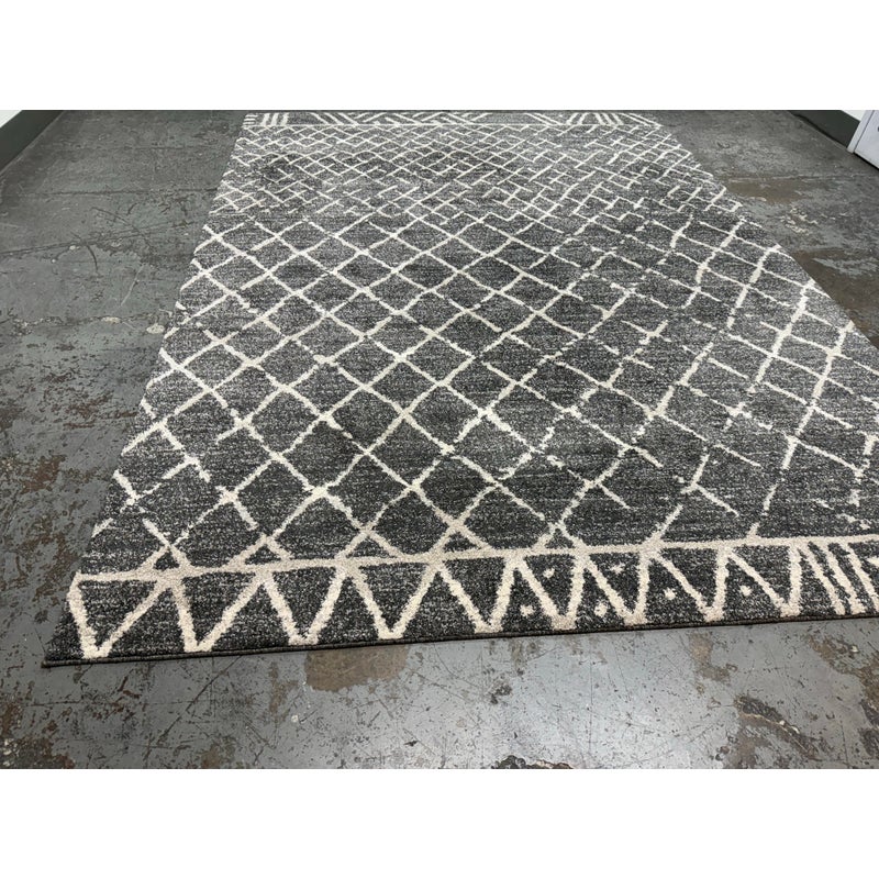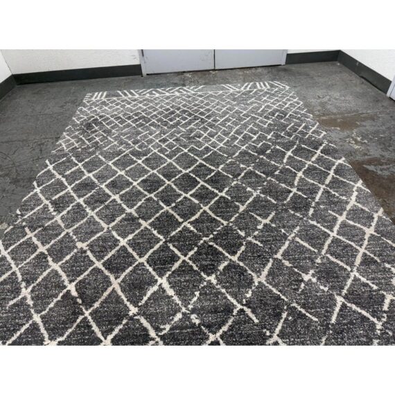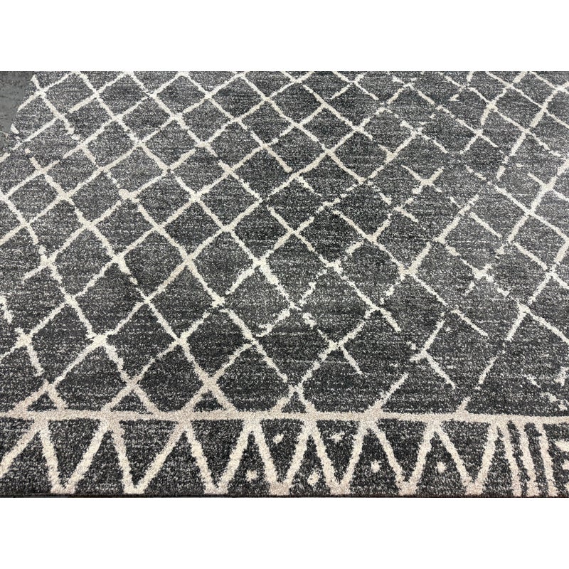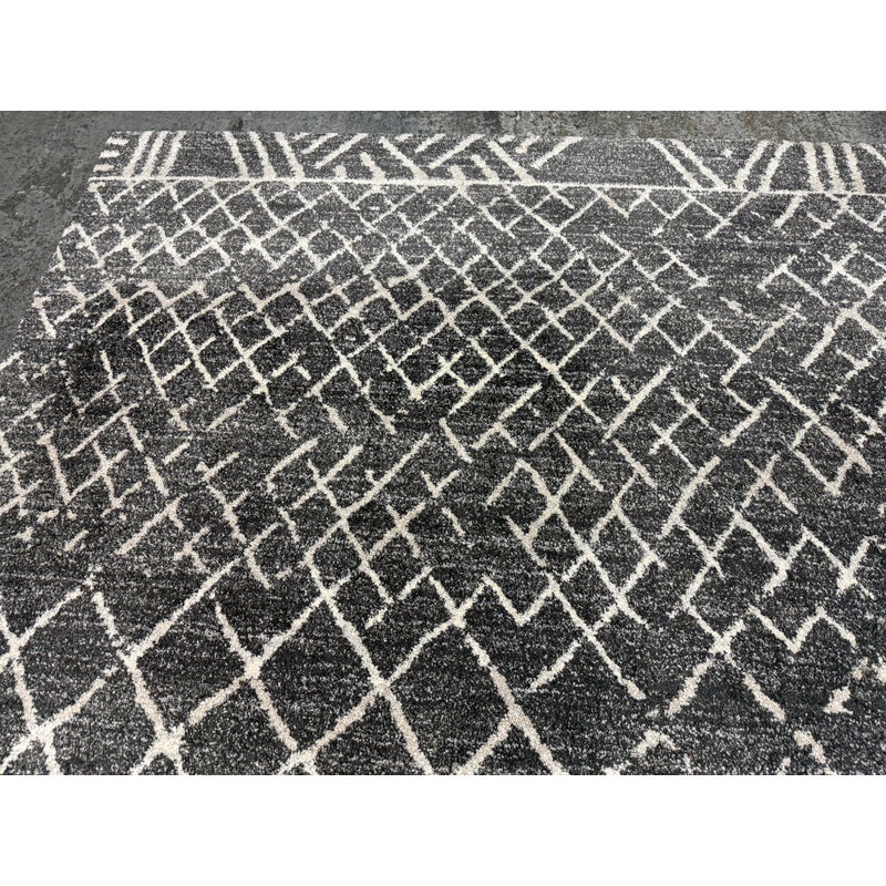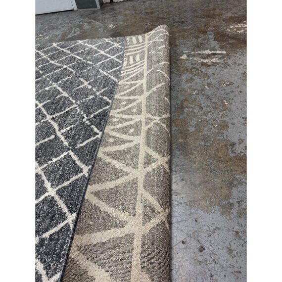 Design Plus Gallery presents the 7ft 8in x 10ft 7in Area Rug from Abbey Carpet & Floor. The area rug is a deep gray with geometric shapes in an off white tone. The timeless floor covering has a sophisticated design to incorporate into your home for impeccable style. This style is no longer in production with the brand. Overall the rug is in good condition with minimal visible wear for its usage.
