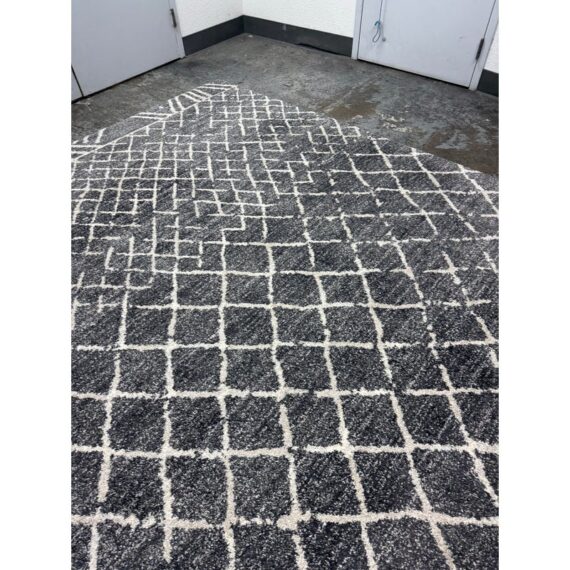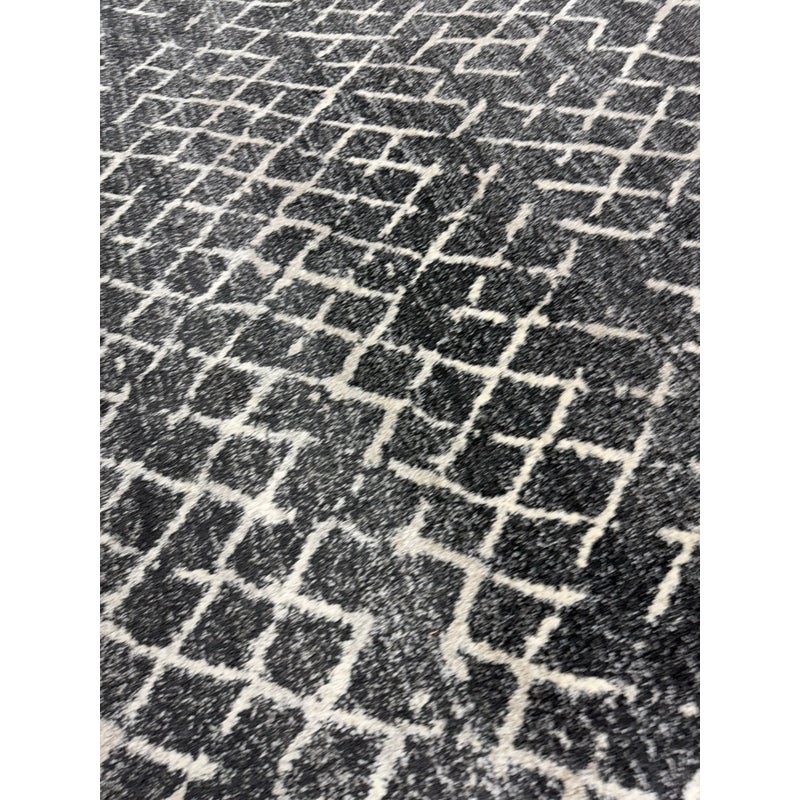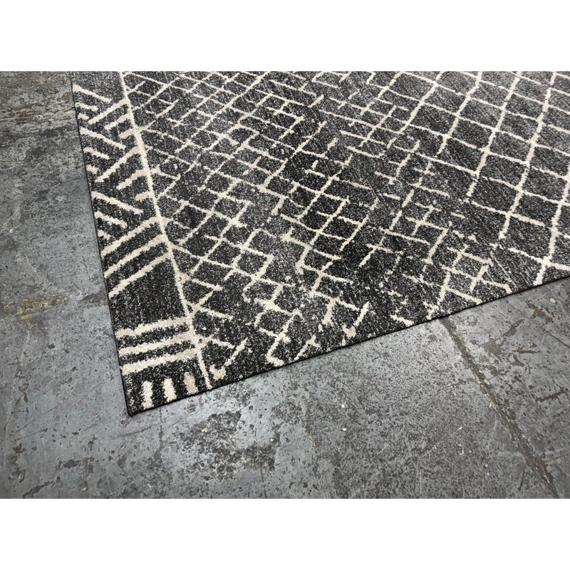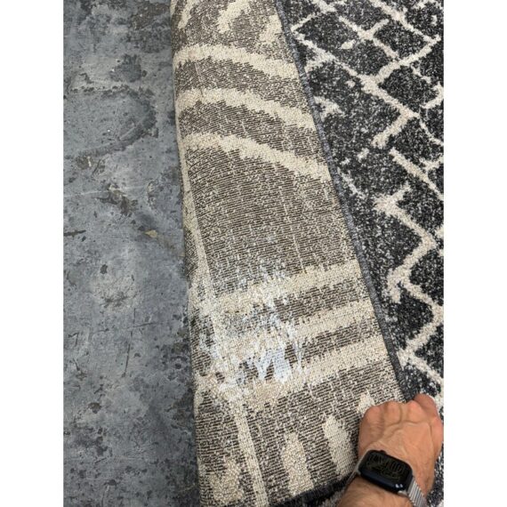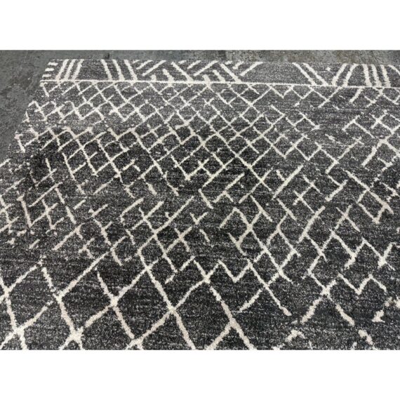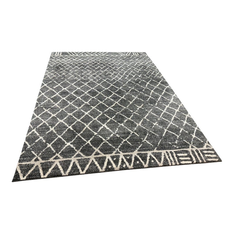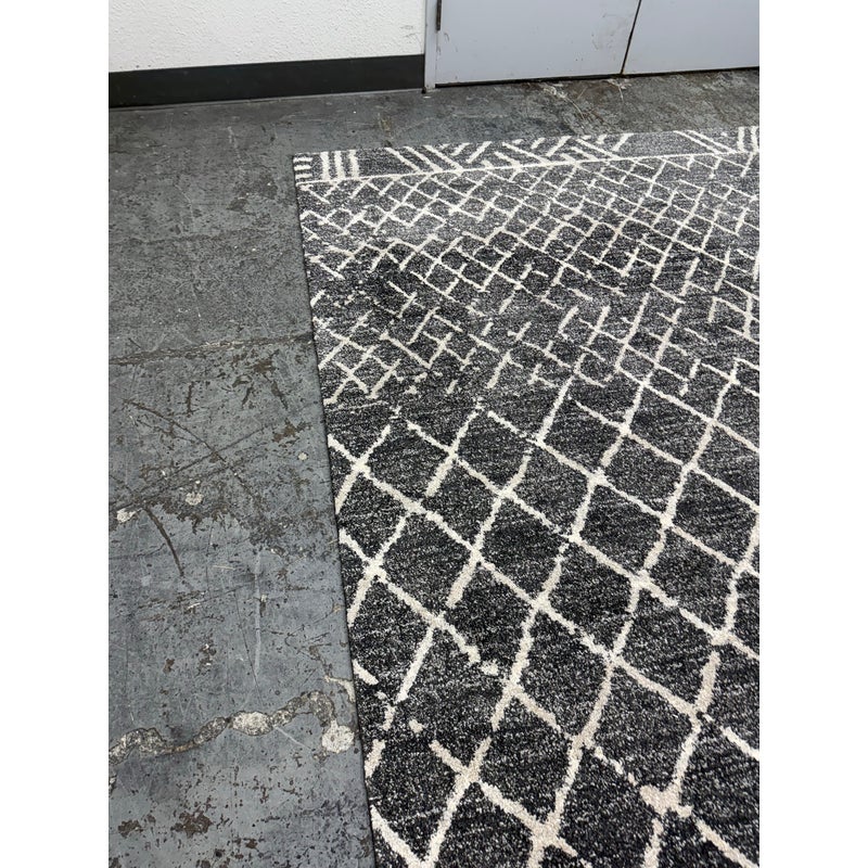 Design Plus Gallery presents the 7ft 8in x 10ft 7in Area Rug from Abbey Carpet & Floor. The area rug is a deep gray with geometric shapes in an off white tone. The timeless floor covering has a sophisticated design to incorporate into your home for impeccable style. This style is no longer in production with the brand. Overall the rug is in good condition with minimal visible wear for its usage.