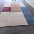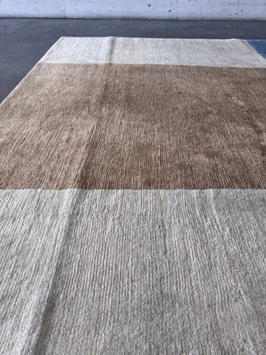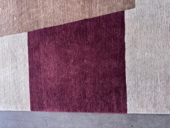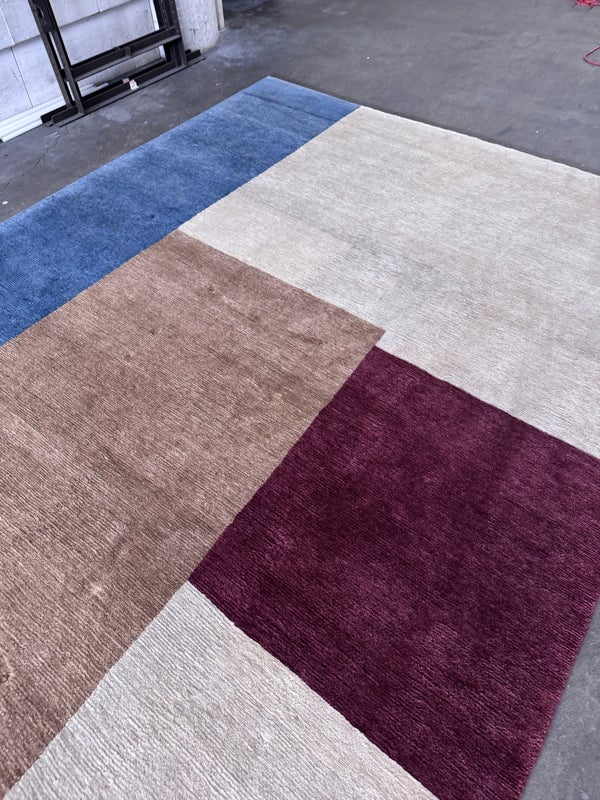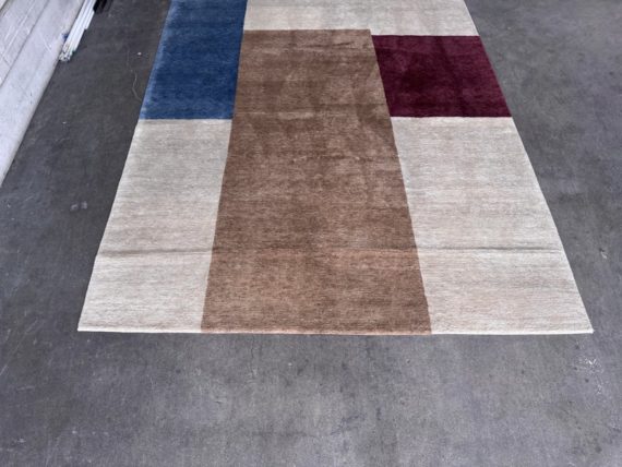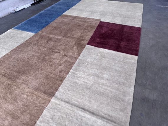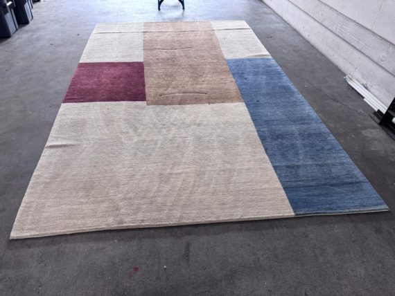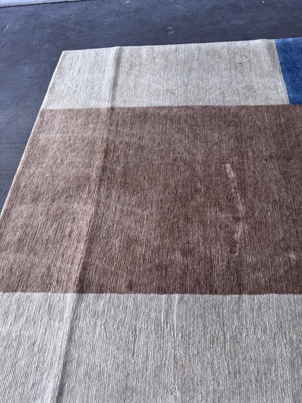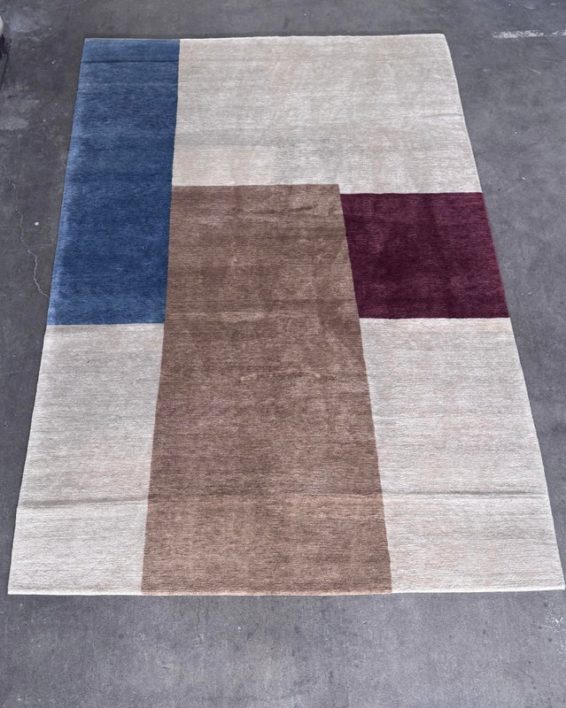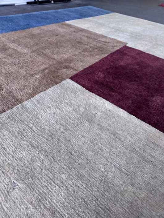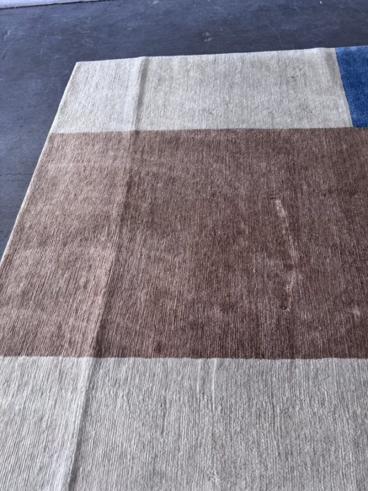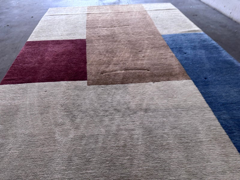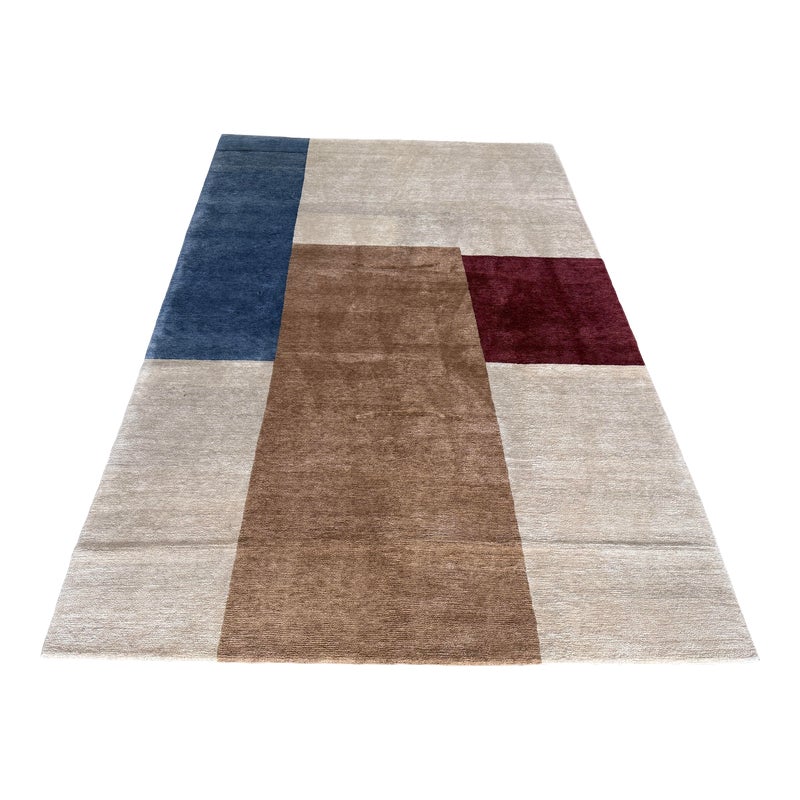 Design Plus Gallery presents a Geometric Area Rug Custom Made by Designer Gary Hutton. There was a beige, tan with red and blue rectangular blocks of color. Gary Hutton, aka “Dean of West Coast” Design designs for contemporary homes and highlights artful objects. The rug is in good condition with its age + use. Visible stains, would benefit with professional cleaning.