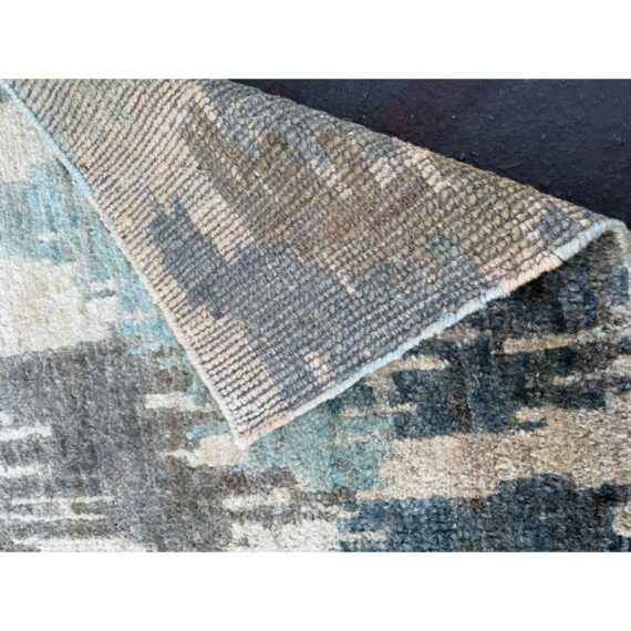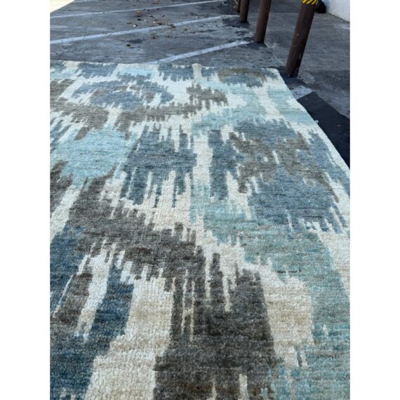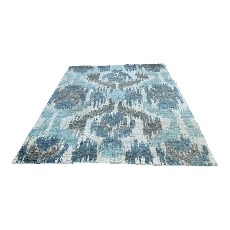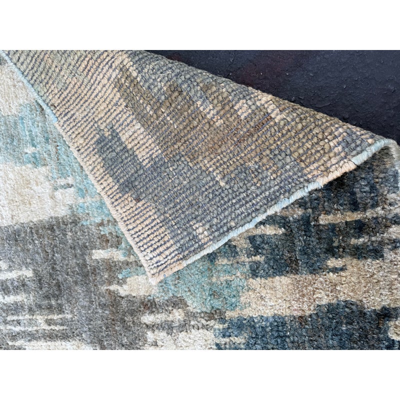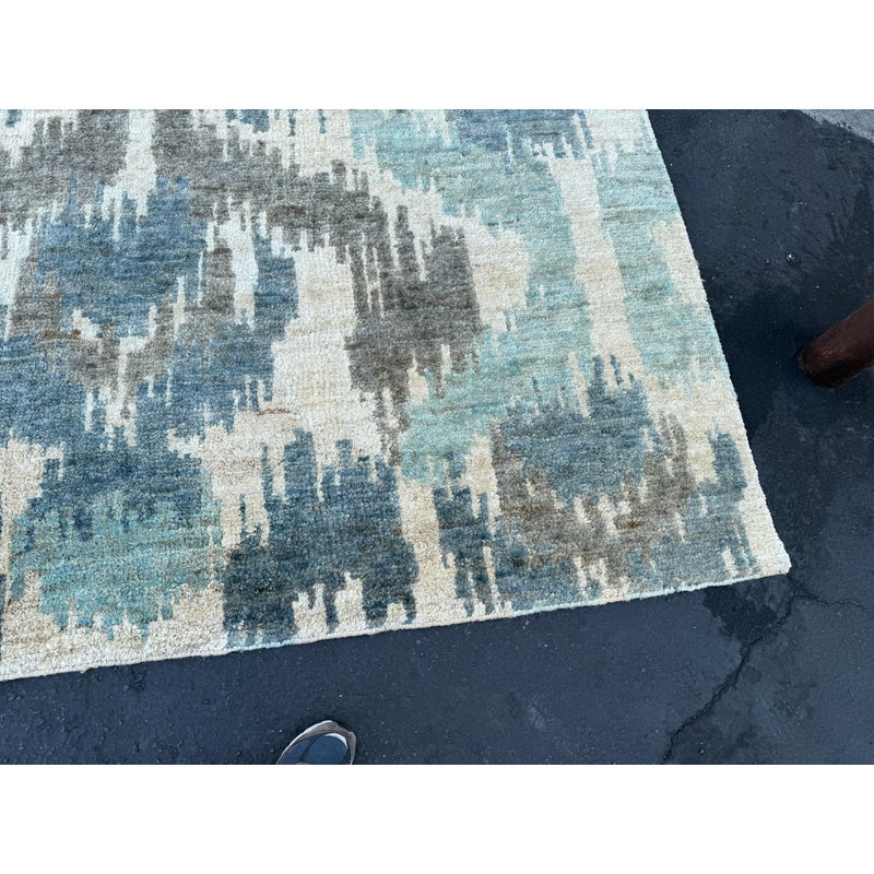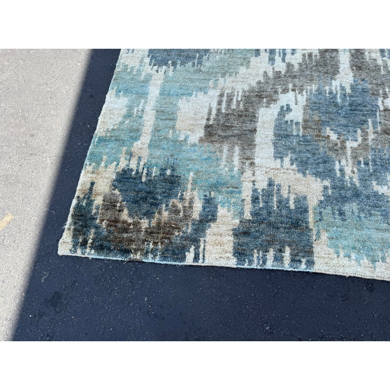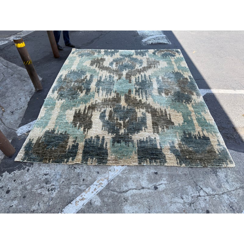 Design Plus Gallery presents a 8ft 1in x 9ft 11in Ithaca Irate Area Rug from Classic Home. The tribal style of pattern work is crafted from Jute with Cotton added to give a softer feel underfoot. Nice cooling tones of greens + blues stand out against the natural off white background. Light surface wear; condition is consistent with age and use.