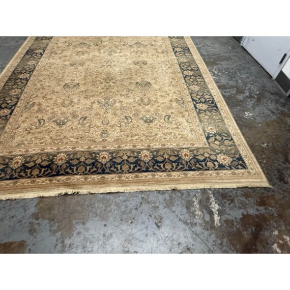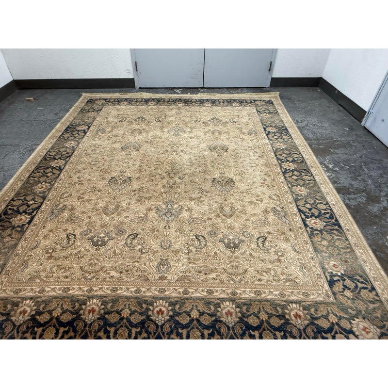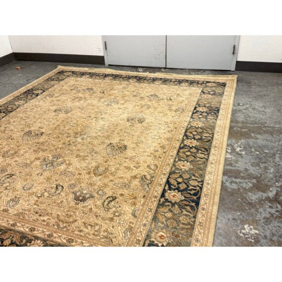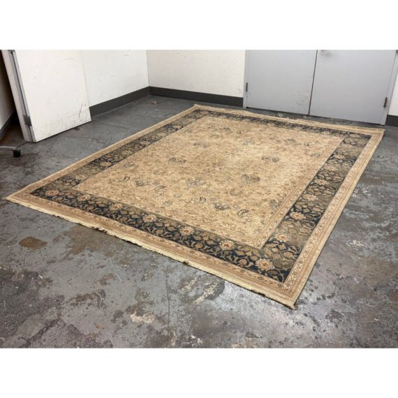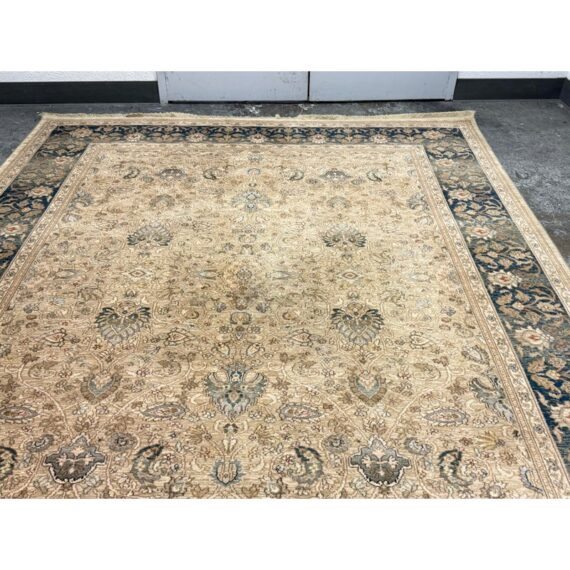 From the Original Karastan 700 Collection, Persian Garden is inspired by classic Persian garden motifs, celebrated for their balance, symmetry, and lush floral detailing. Machine woven on Karastan’s renowned Axminster looms, this rug is crafted from 100% New Zealand wool, offering a dense, luxurious pile with outstanding durability and softness underfoot. The design features an elegant, softly worn appearance that enhances its antique character while remaining refined and sophisticated. A harmonious palette of blues ranging from pale blue to slate and deep Prussian blue, accented with subtle touches of rust, creates depth and visual richness. The intricate floral pattern fills the field and border with graceful movement, making the rug both a statement piece and a grounding element within a room. In good condition, visible and minimal wear from usage.