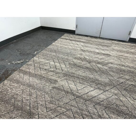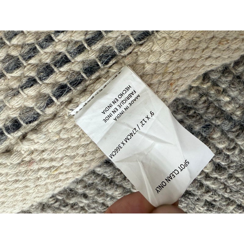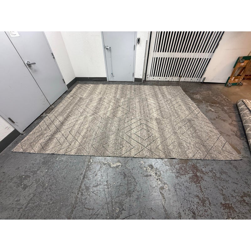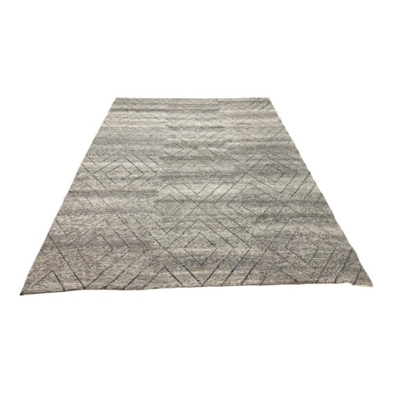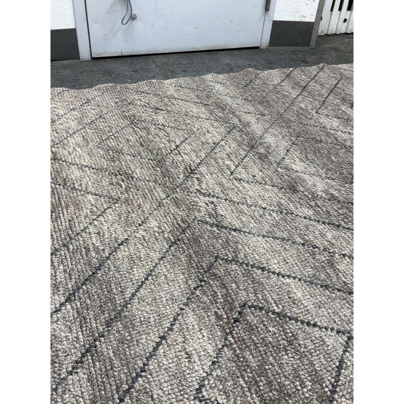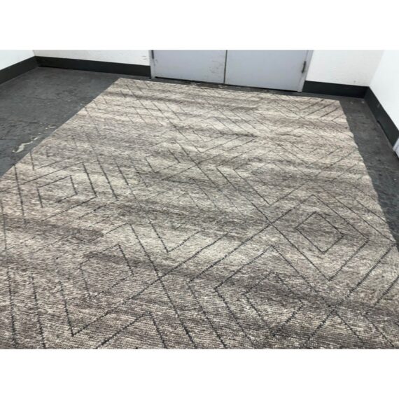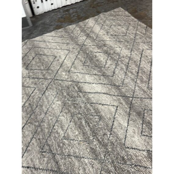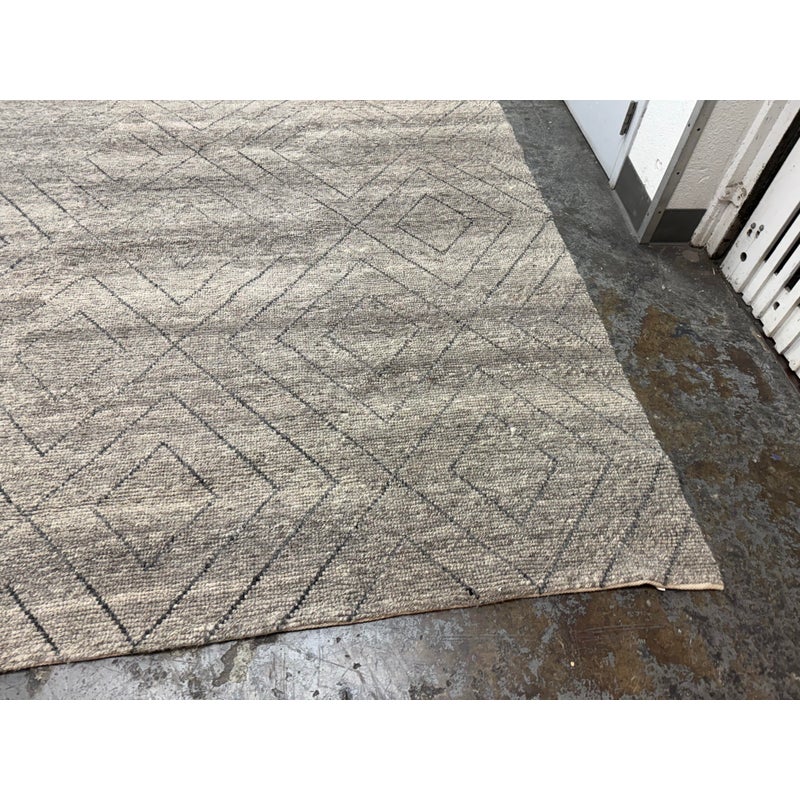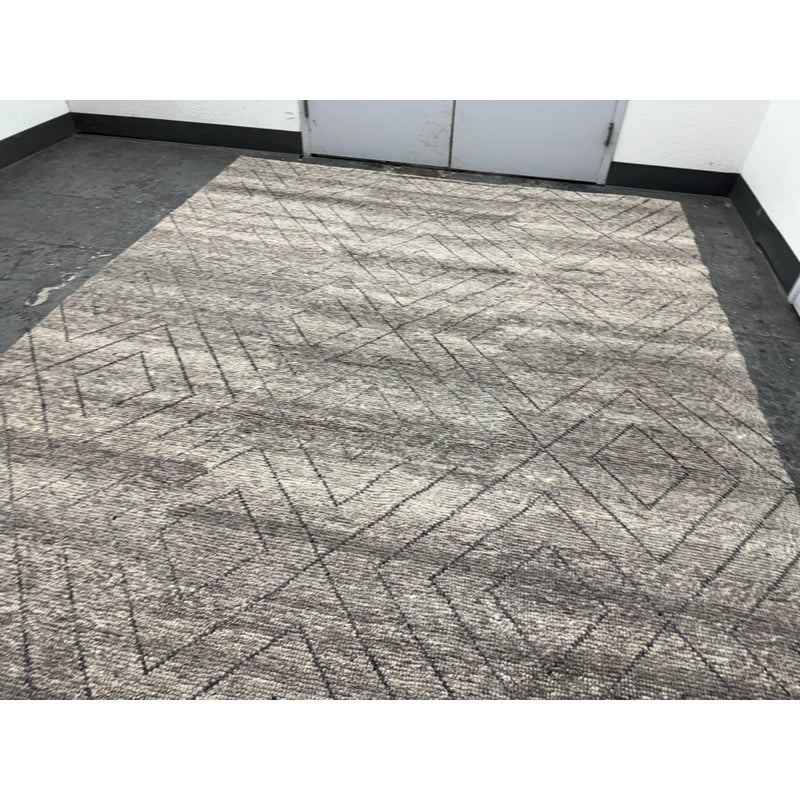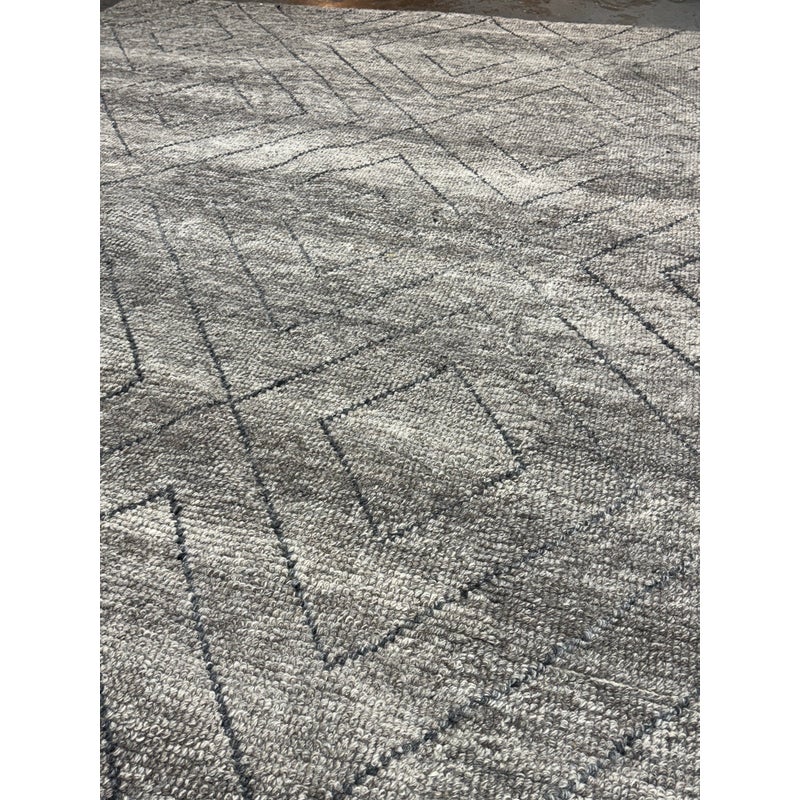 Design Plus Gallery presents an 8ft 9in x 12t Diamond Pattern Area Rug from Caravan. The Parisian brand is well known for their use of noble fibers and ethical discovery of craftsman around the world. This rug was hand made in India with the use of wool through the hands of well treated laborers. The background of the fiber is in a pleasant greige with a slate gray repeating pattern of diamonds. The pattern of rug is no longer in production with Caravan. The rug shows minimal surface wear from usage and is considered to be in good condition.