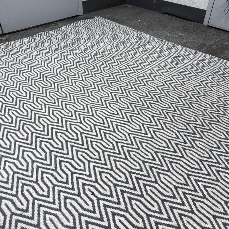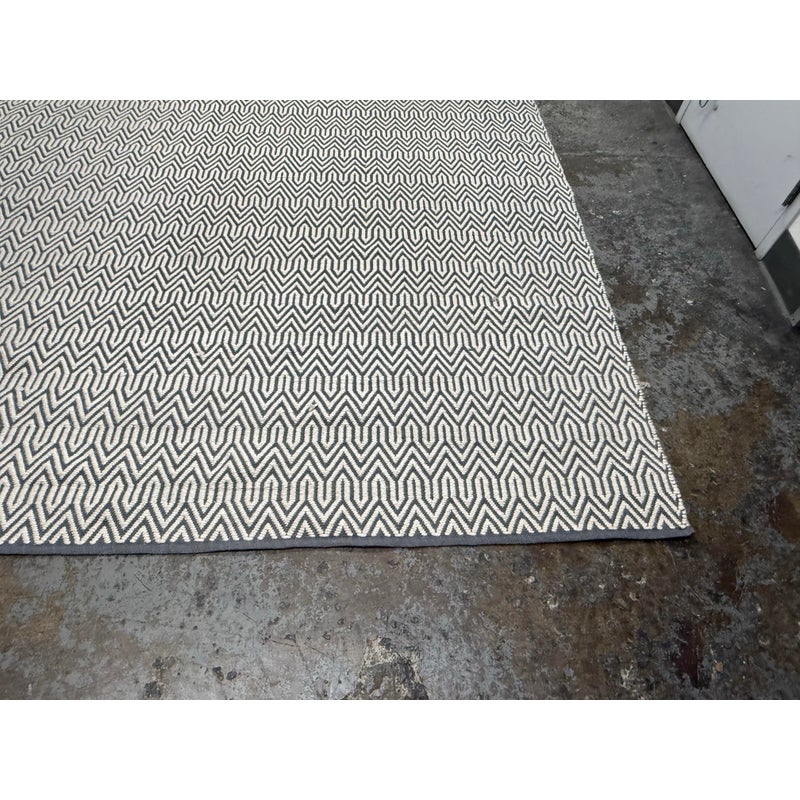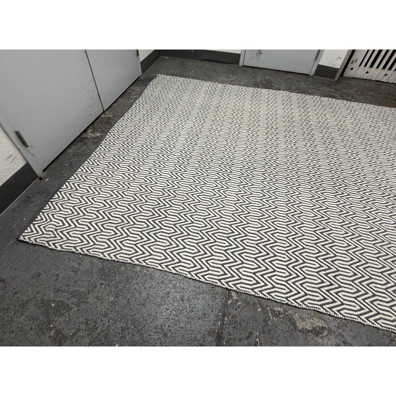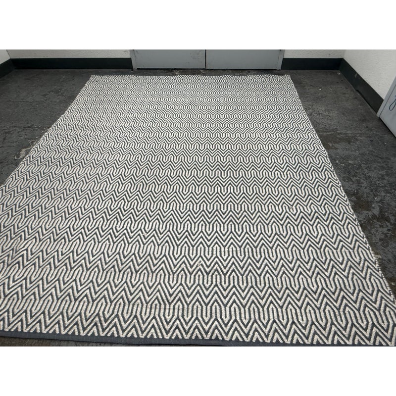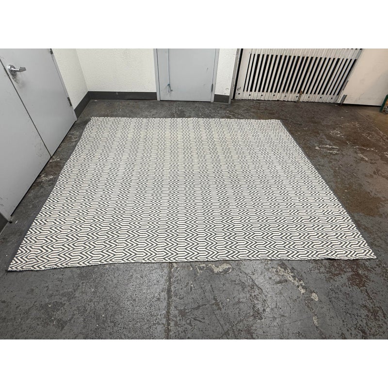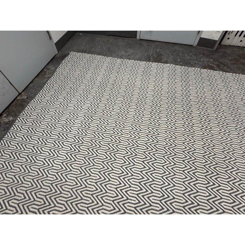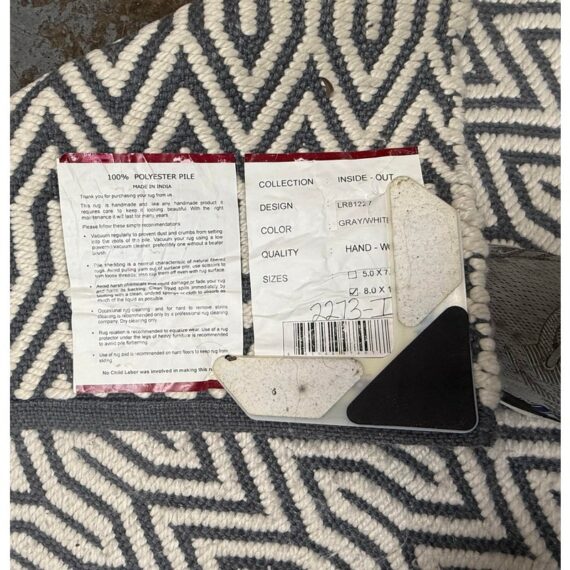 Design Plus Gallery presents an 8ft x 10ft 2in Inside Out Collection Area Rug. The rug is white with a blue trim that offers repeating patterns of alternating shapes that run throughout. It is able to be placed outdoors due to its fabrication of Polyester pile. Overall the rug is in good condition with minimal visible wear for its usage.