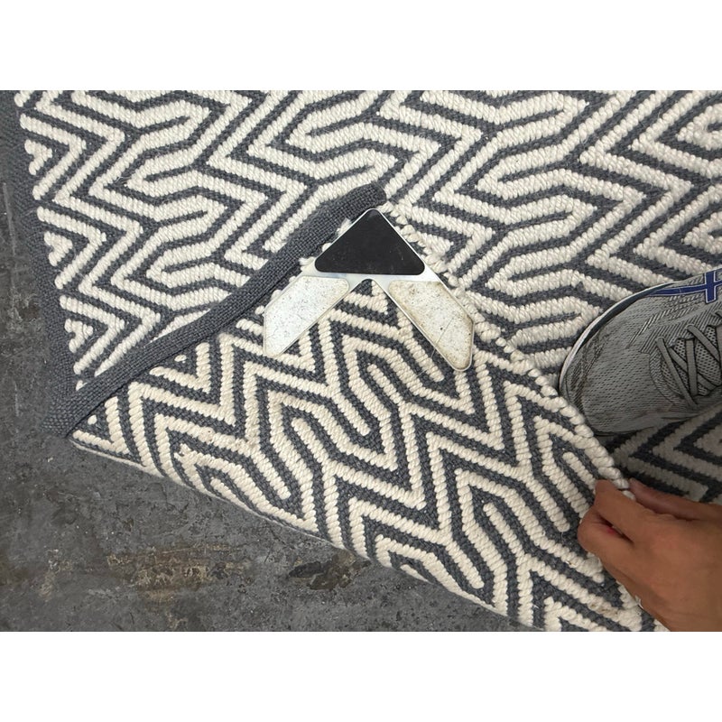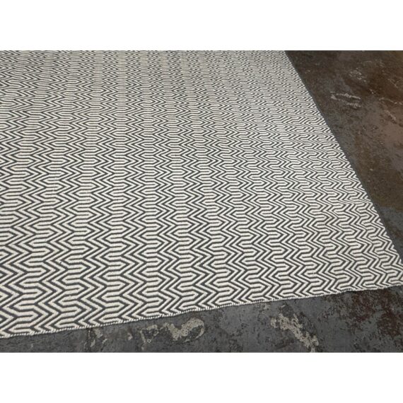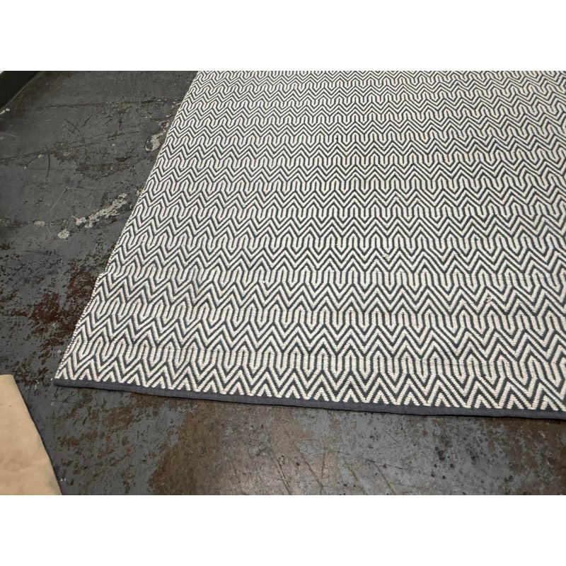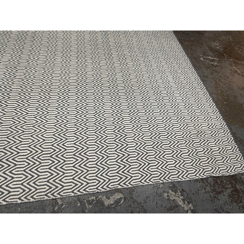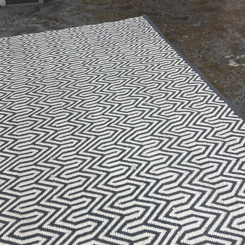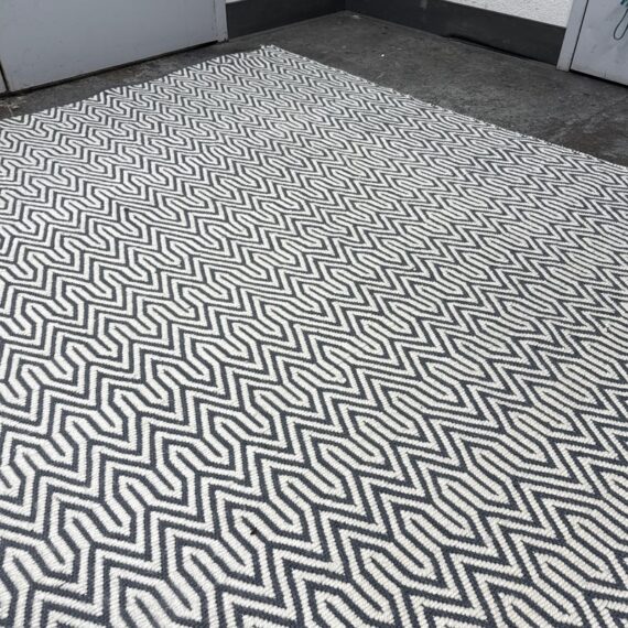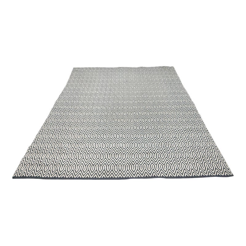 Design Plus Gallery presents an 8ft x 10ft 2in Inside Out Collection Area Rug. The rug is white with a blue trim that offers repeating patterns of alternating shapes that run throughout. It is able to be placed outdoors due to its fabrication of Polyester pile. Overall the rug is in good condition with minimal visible wear for its usage.