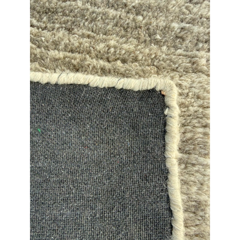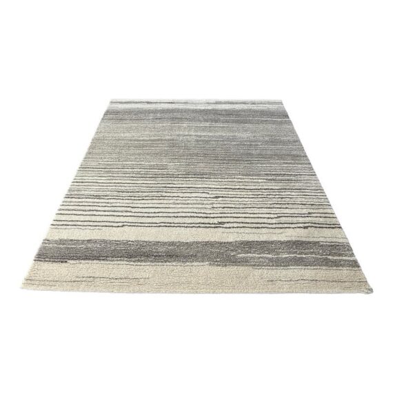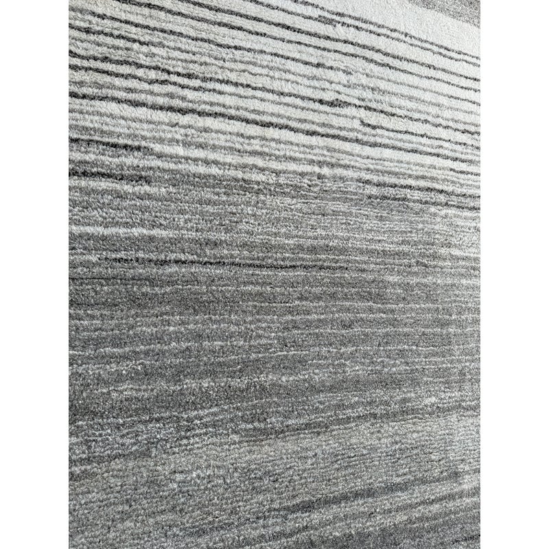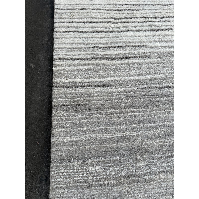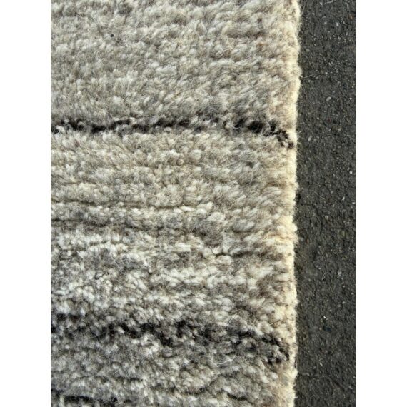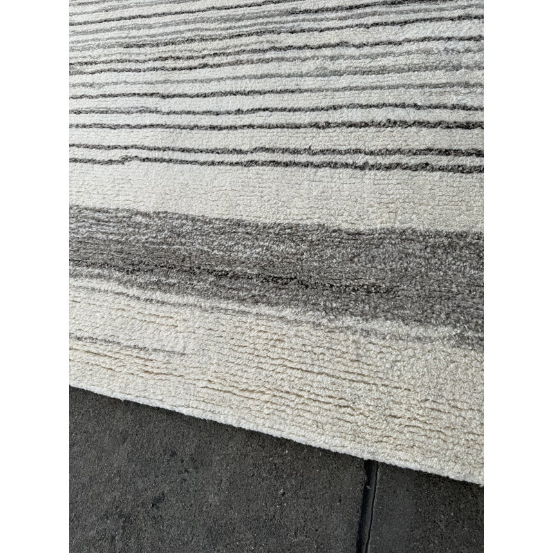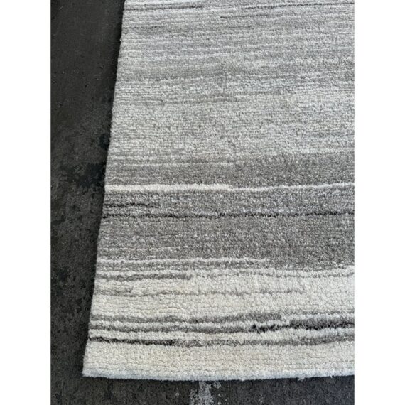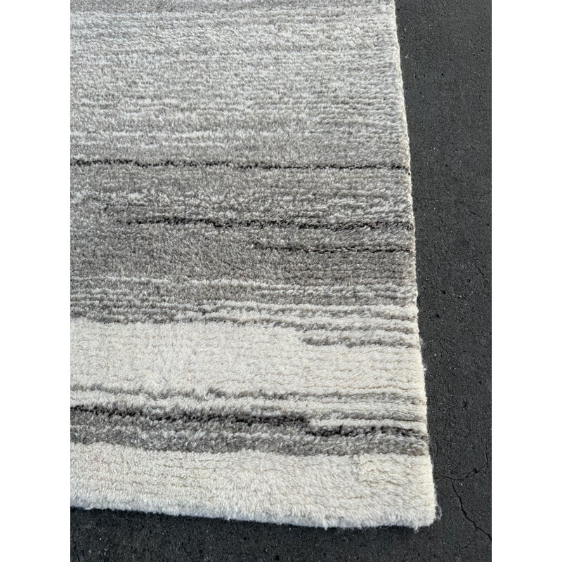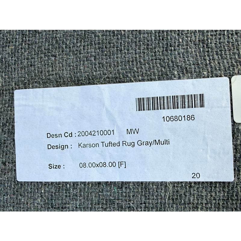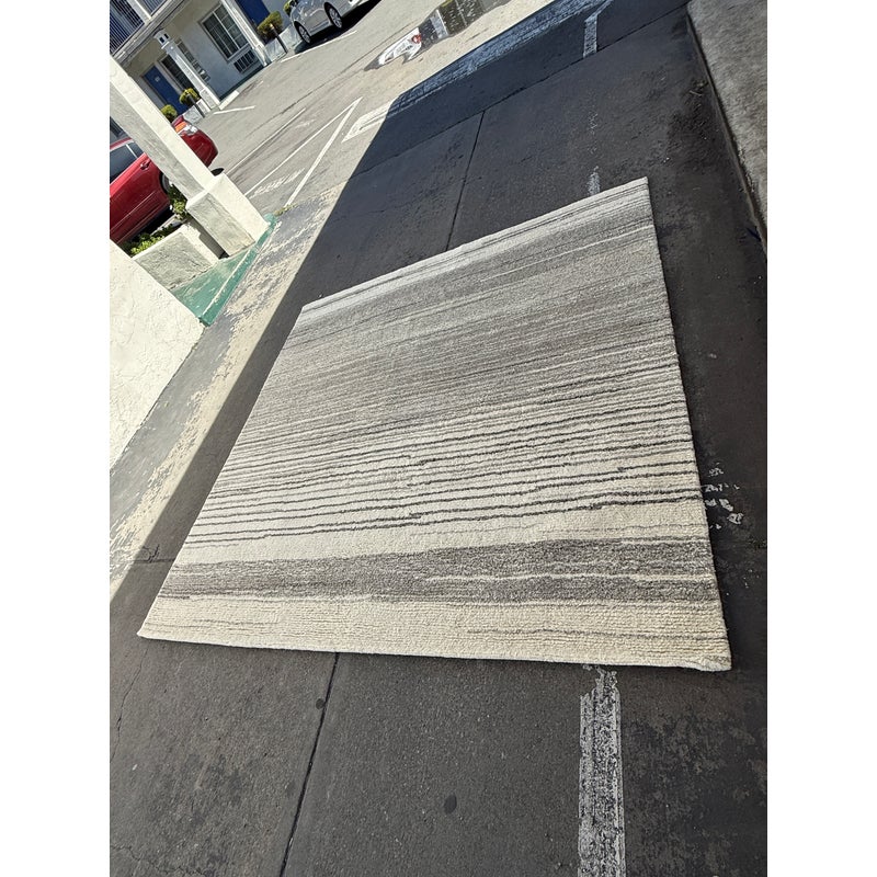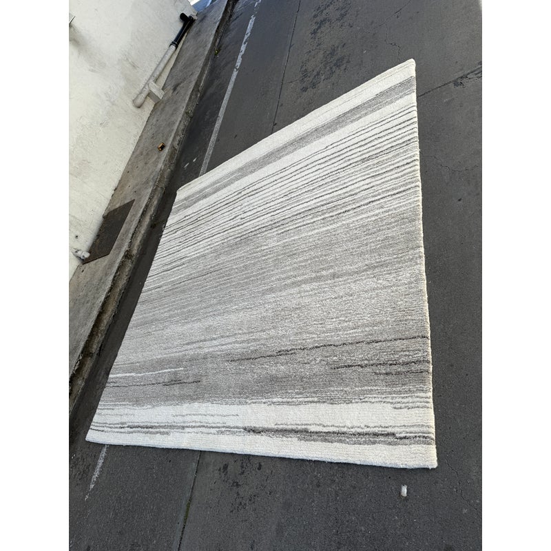 Design Plus Gallery presents an 8ft x 8ft Karson Area Rug in Gray from Pottery Barn. This contemporary area rug has a neutral-textured and toned balance that is made from 100% wool with a plush 0.5-inch pile height. It is known for its durability and versatility, featuring a hand-tufted construction that works well in high-traffic areas. it has alternating striations of tones of gray within an off-white background. It shows general wear that is overall in good condition for its usage.