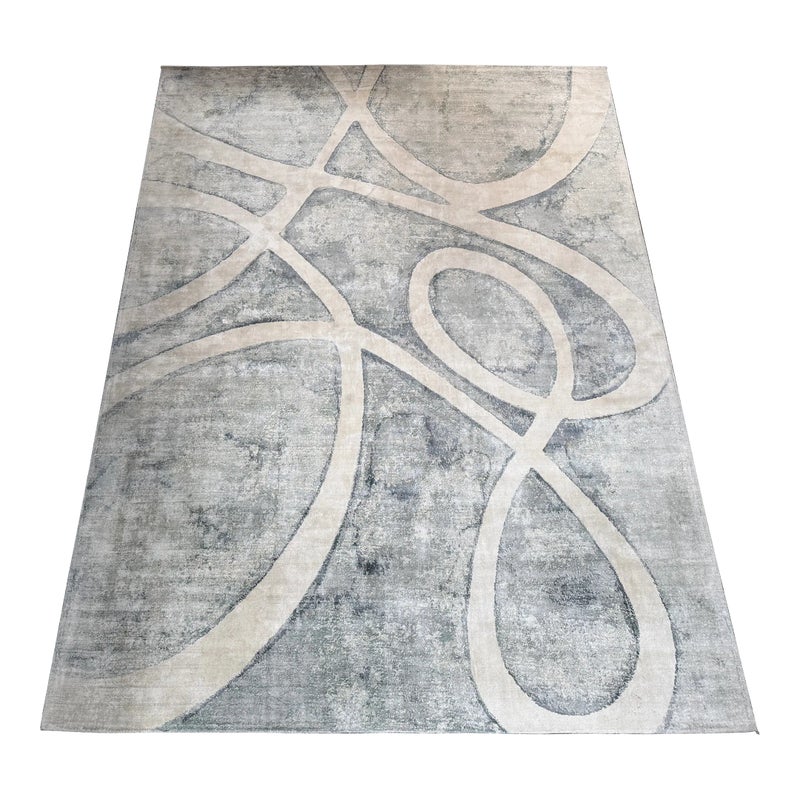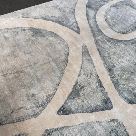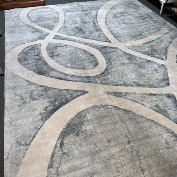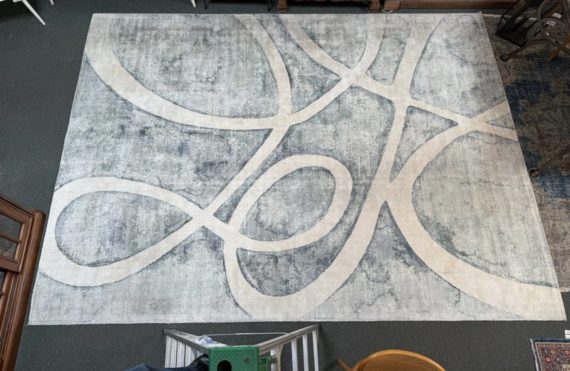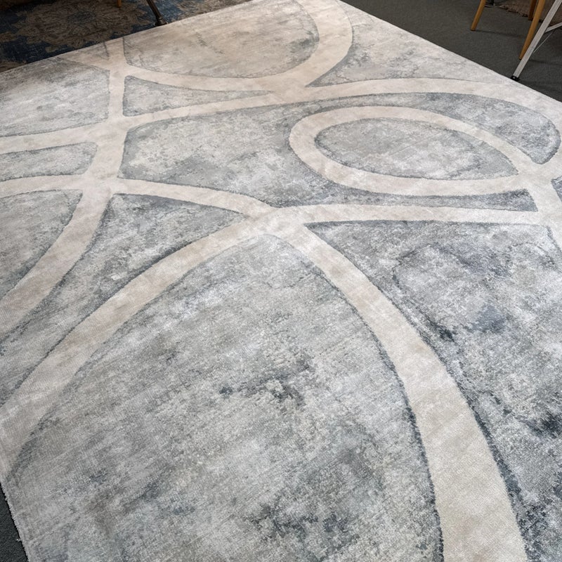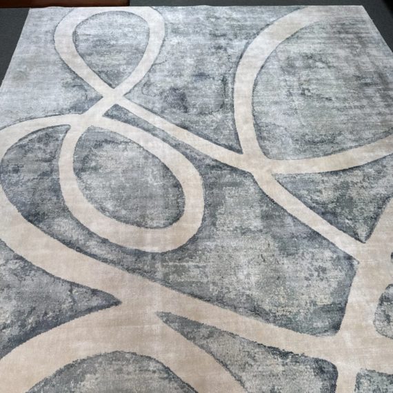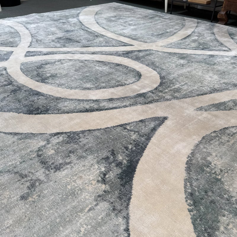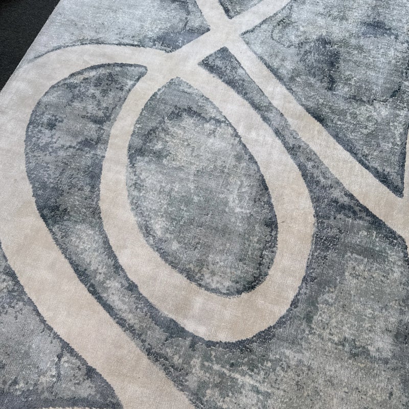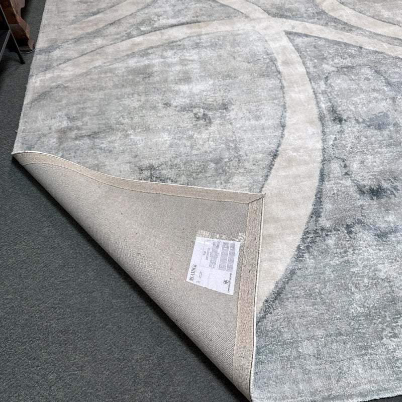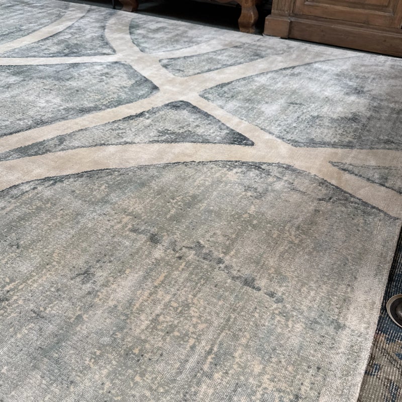 Design Plus Gallery presents the 8ft11in × 12ft Meander Rug by Global Views. A mesmerizing large scale pattern, the Meander Rug design is based on an original watercolor painting. The sheen of bamboo silk construction and the subtle blue/white/cream watercolor effects and makes a chic foundation for your space. Little evidence of wear; condition is consistent with age and use.