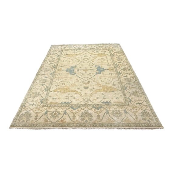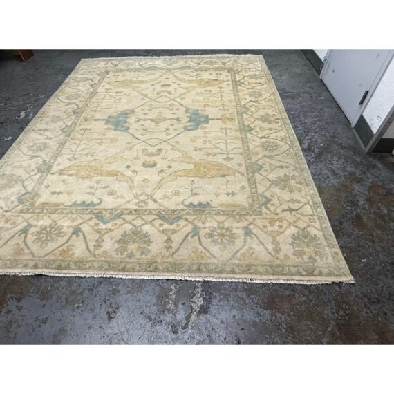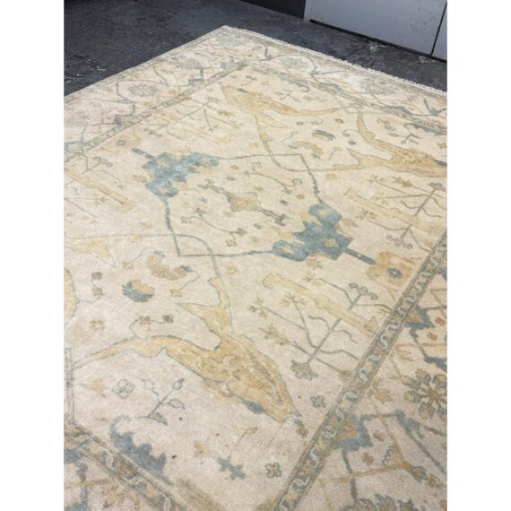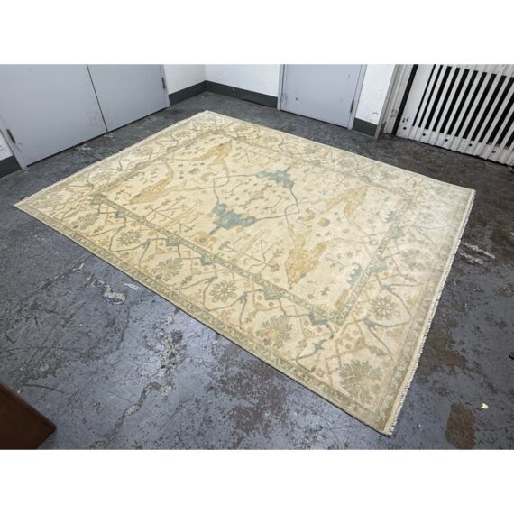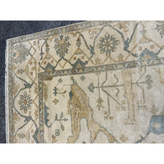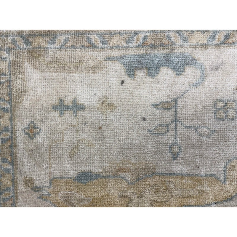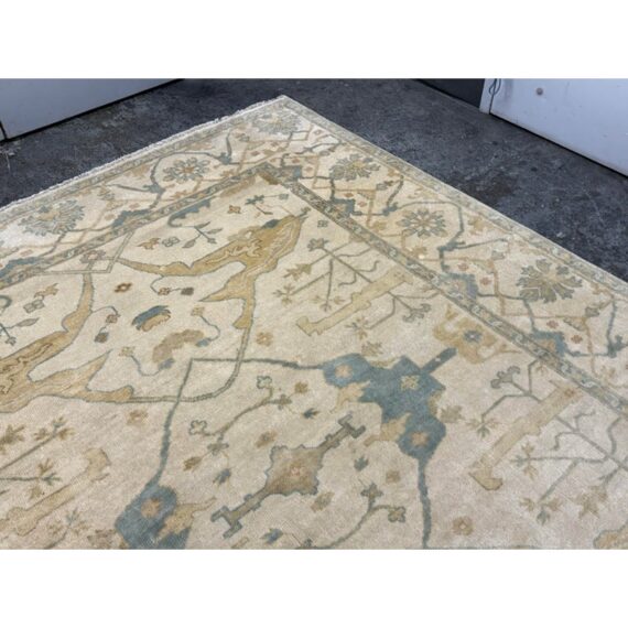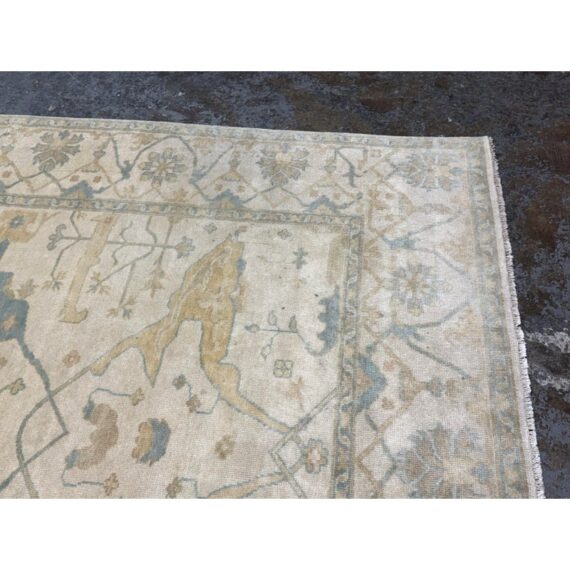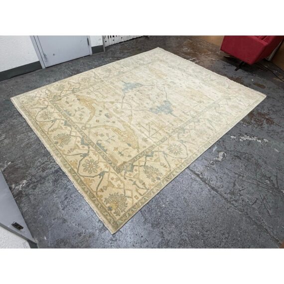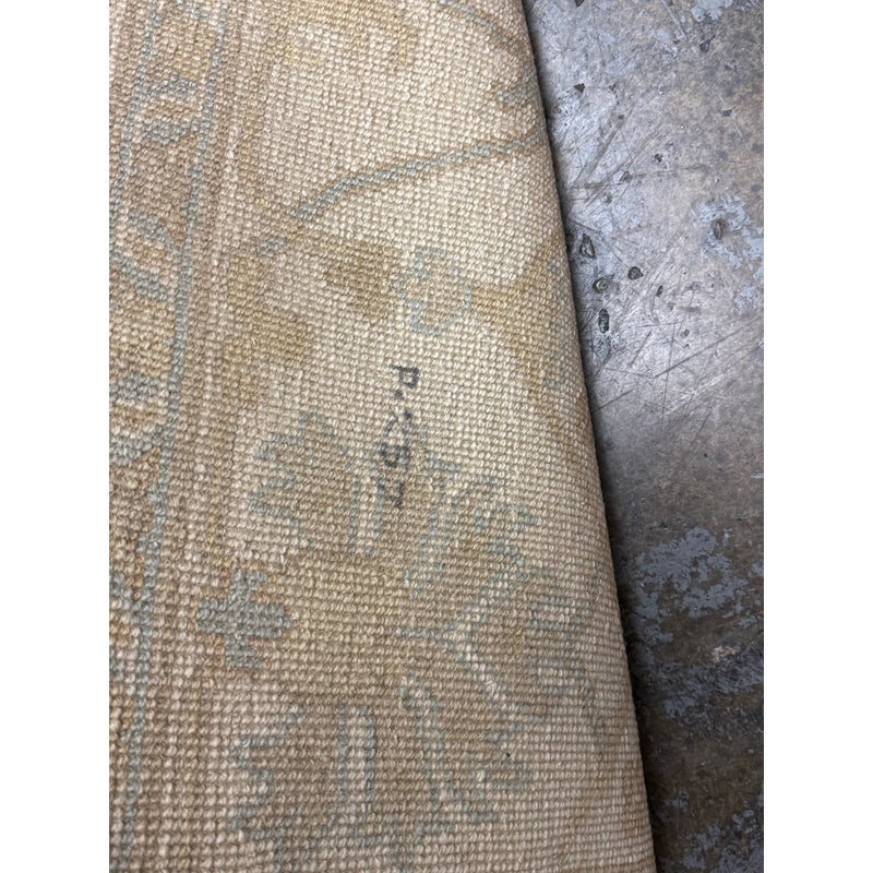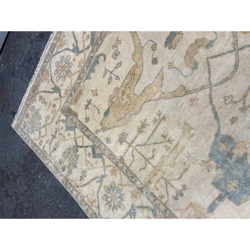 Design Plus Gallery presents a 8ft1in × 10ft1in Antique Style Turkish Weave Oushak Area Rug. It carries an air of understated elegance, perfectly encapsulating the essence of the original antique Turkish Oushaks. The rug is hand-knotted by master weavers, ensuring a high level of craftsmanship and quality. The colors are a blend of beige and blue, creating a soothing and inviting atmosphere. These muted tones contribute to the rug’s antique look, making it an ideal choice for those who appreciate vintage aesthetics. The design is intricate yet not overwhelming, maintaining a balance between detail and simplicity. The rug is made from hand-spun New Zealand wool, known for its durability and softness. Whether used in a living room, dining room, or bedroom, this rug is sure to enhance any space with its timeless beauty and superior craftsmanship. In fair condition, visible markings. Would benefit with a professional cleaning.