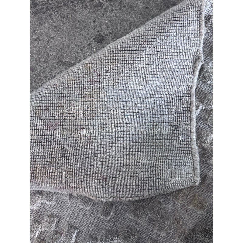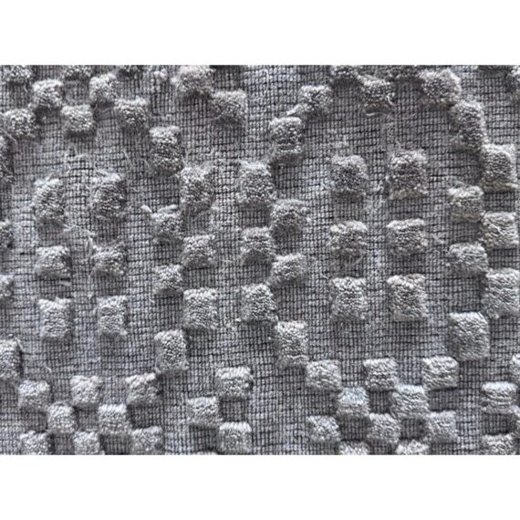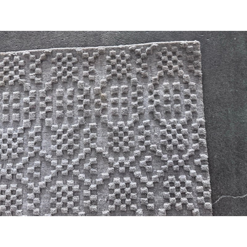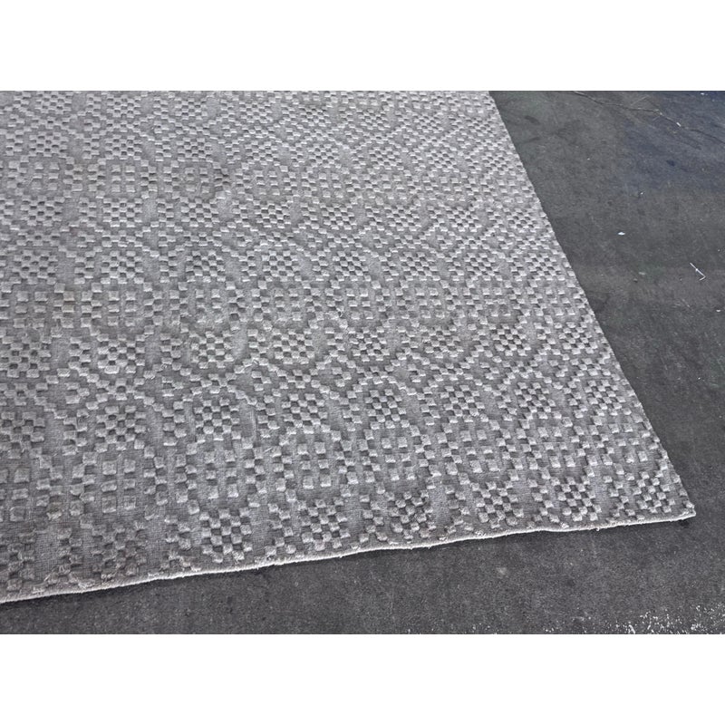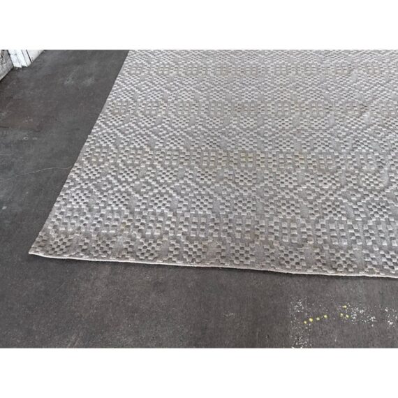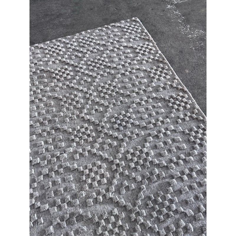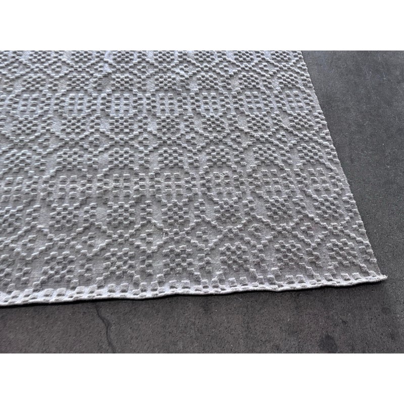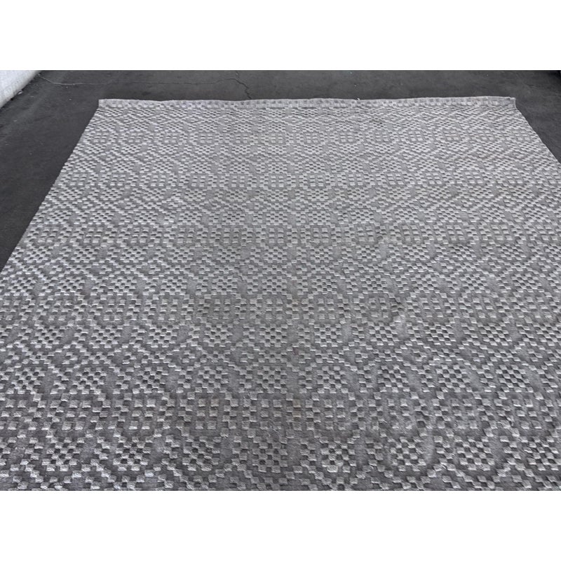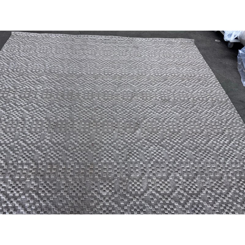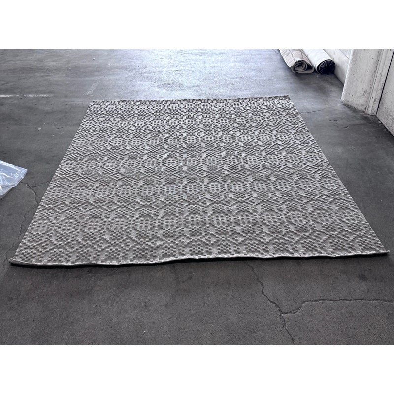 Design Plus Gallery presents a 8ft2in × 9ft8in Textured Area Rug from Arkitektura. Providing a substantial coverage area that is ideal for larger rooms. This piece is inspired by Moroccan prints, creating a dynamic, geometric pattern that adds visual interest and depth to any space. The rug features a lecture light gray color, a sophisticated neutral that can easily blend with a variety of interior color schemes. It’s crafted with a textured surface, providing a soft and comfortable underfoot feel while adding an element of tactile appeal. This rug is perfect for enhancing the aesthetic of your living room, dining area, or bedroom, providing a blend of style, comfort, and functionality. Was a showroom sample. In good condition, visible and minimal wear from usage.