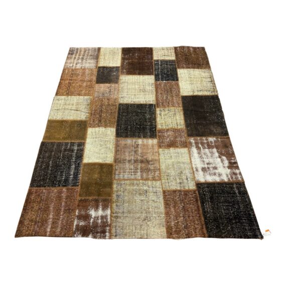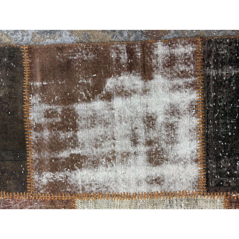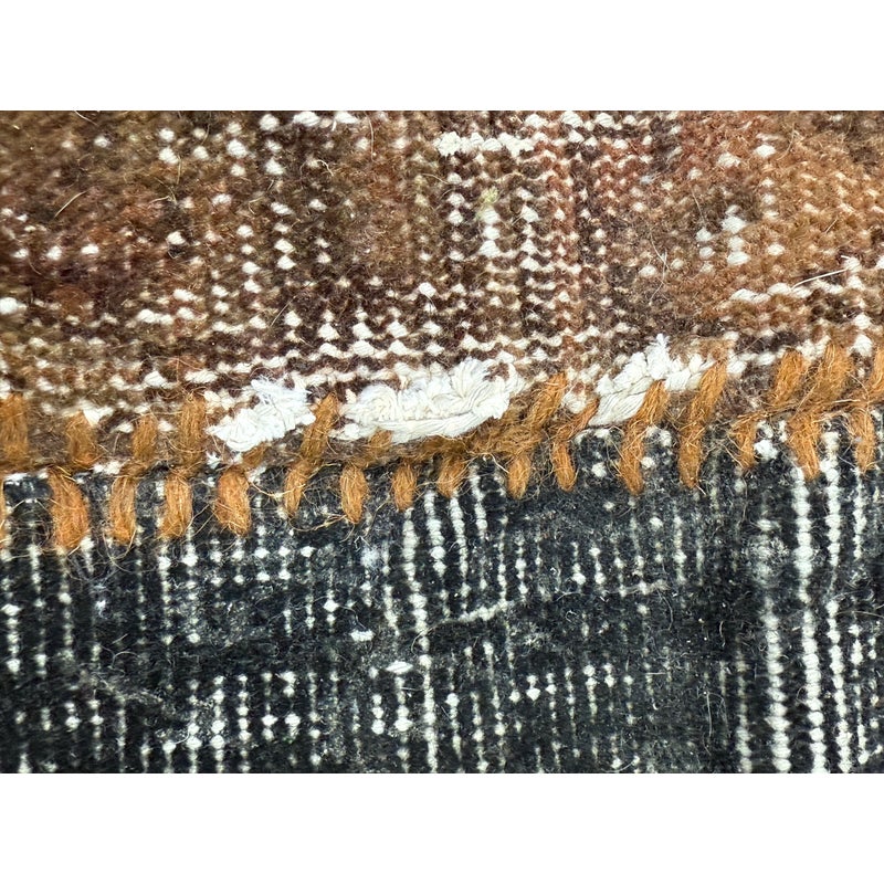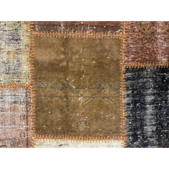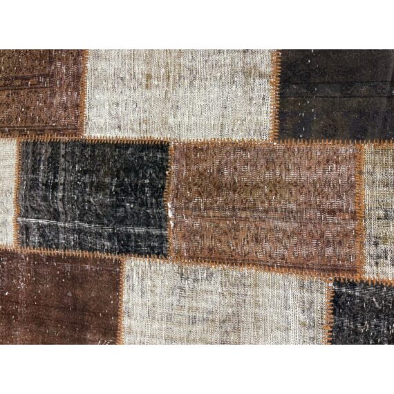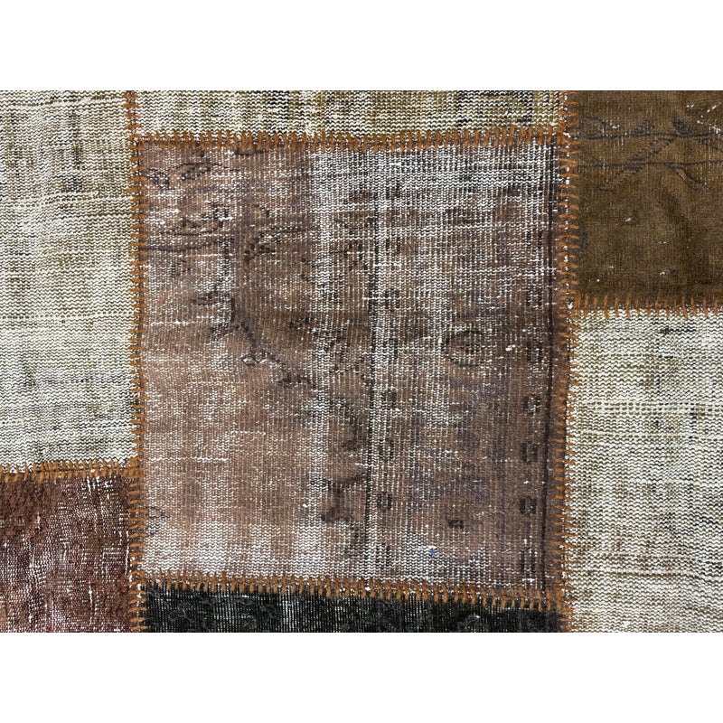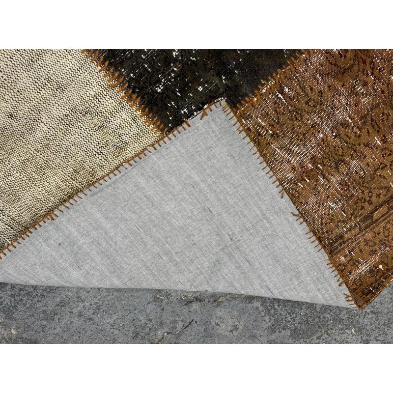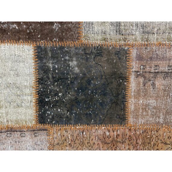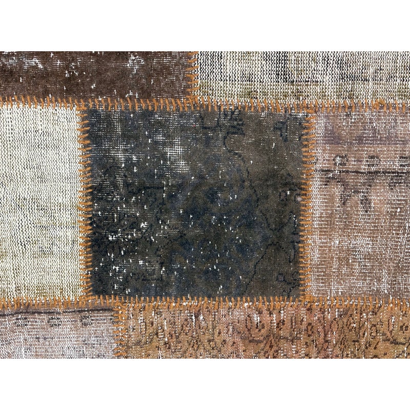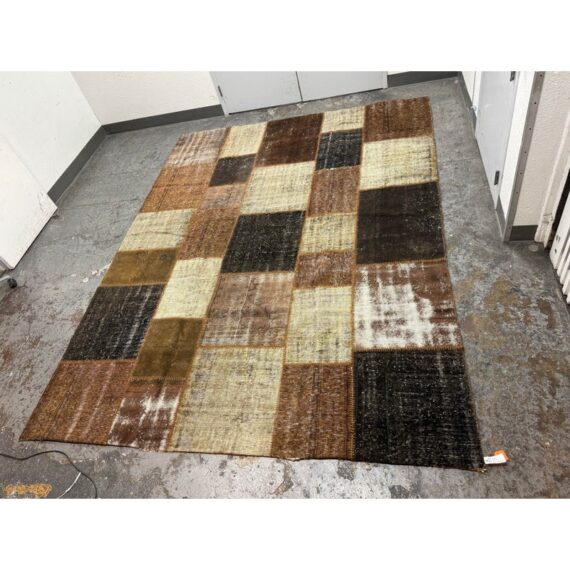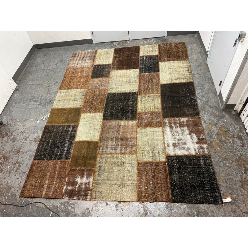Design Plus Gallery presents a 9ft 5in x 12ft 5in Turkish Patch Work Hand Woven Area Rug. This Turkish hand-knotted rug was woven in the second half of the 20th century to this over-dyed patchwork rugs. The patchwork was made from cutting squares of other rugs into smaller pieces and hand sew the fragments together with a sturdy yarn. The back the patchwork rug with buckram and a cotton cloth that strengthens the rug. The rearrangement of the fragments transforms the ancient craft of rug making into unique artwork suited for contemporary settings at home or in offices. Is in good condition for its usage with slight fade to tones.
