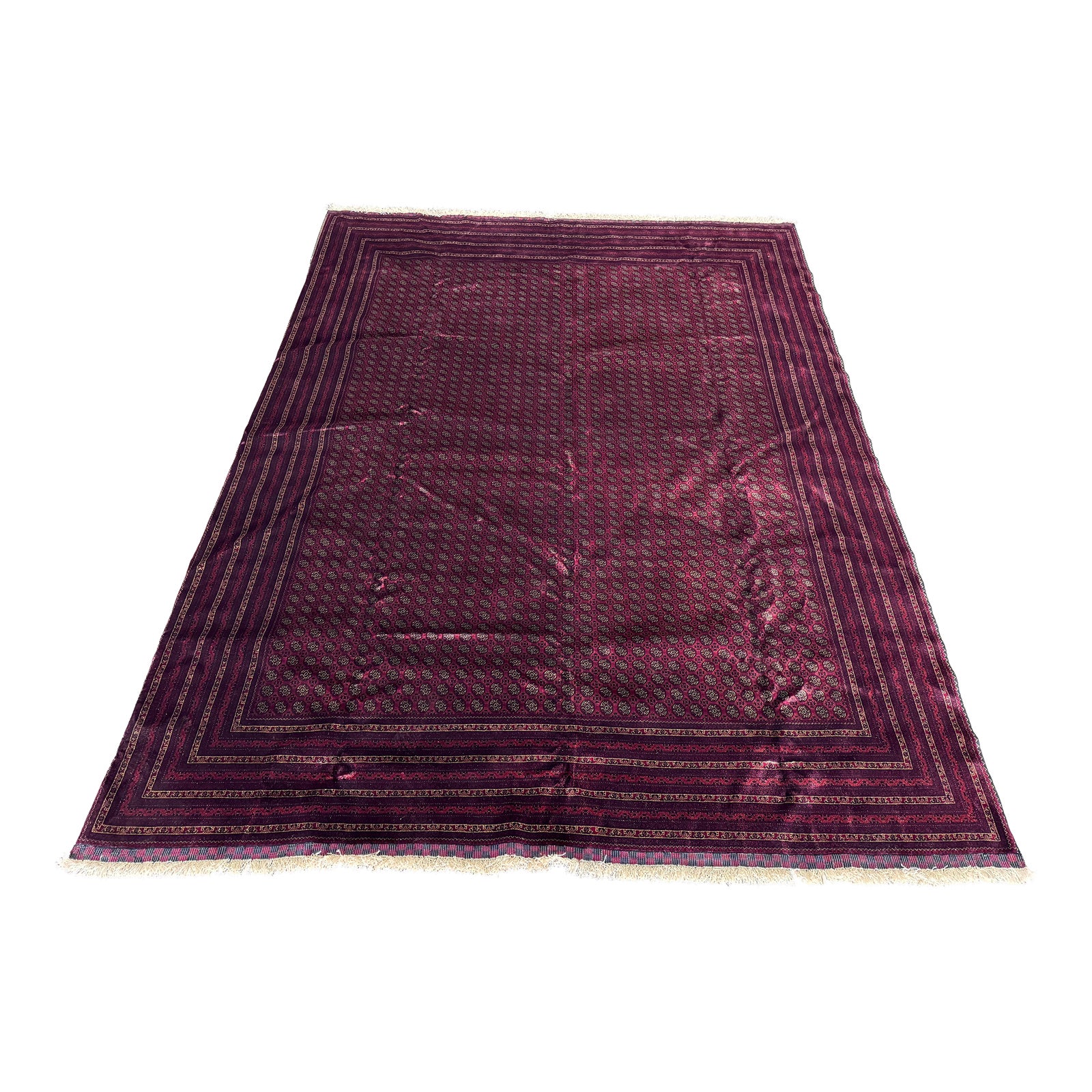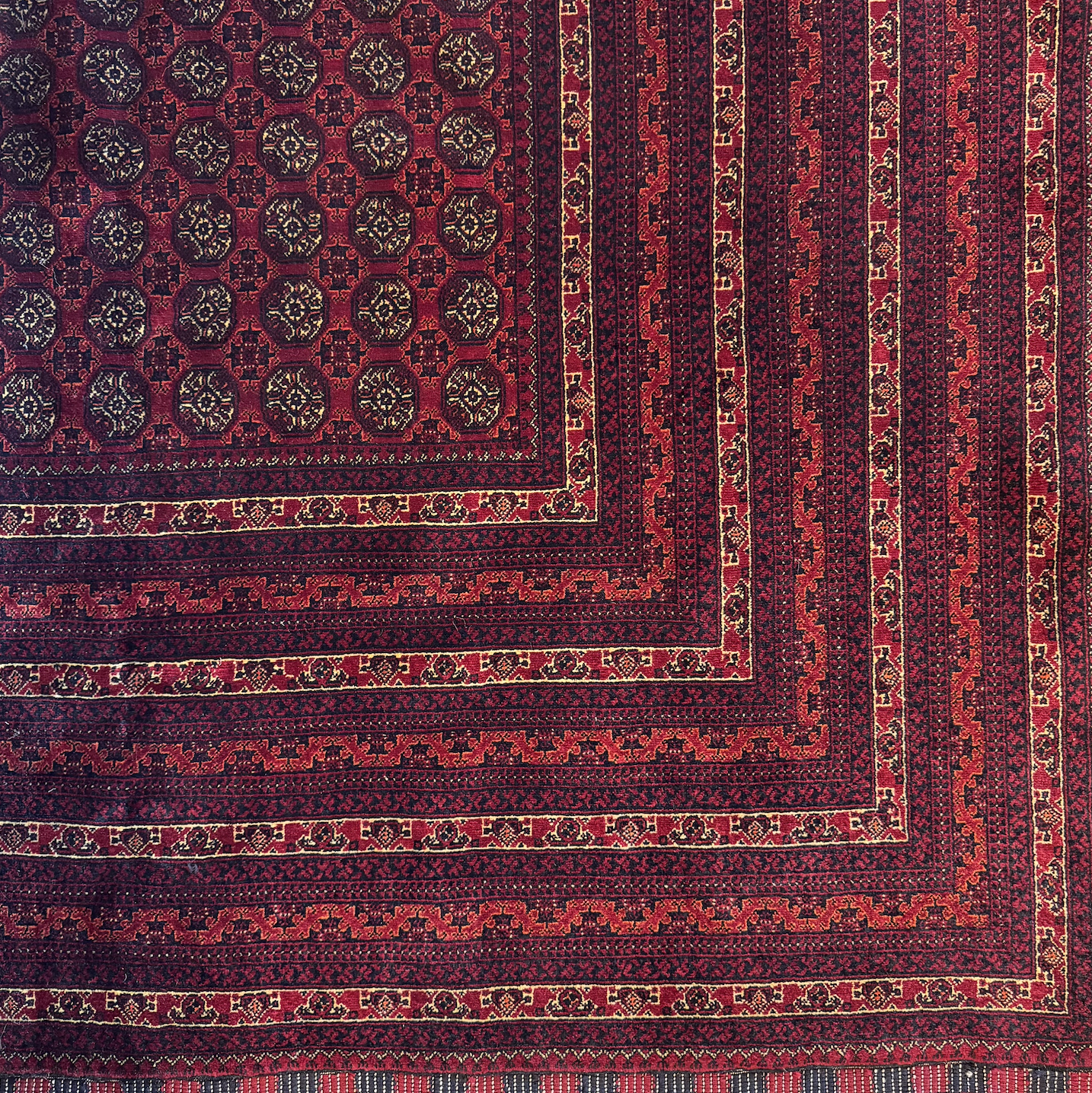 Design Plus Gallery presents the Afghan Mazar-E Sharif Persian Princess Bukhara. Princess Bukhara is the most sought after rug in Afghanistan. The name relates to the wondrous history Bukhara is known for. Bukhara is a city in Turkestan where the world’s best handicrafts were made. These Princess Bokhara is now only found in Afghanistan as most of the collections are in local houses and villages who have received these rugs through their ancestors. Princess Bukhara uses silk like wool, from the neck and ankle area of the sheep. The sheep reside in mountainous cold areas which ensures soft wool with sheen of silk. The knotting is as fine as a silk rug, however the wear and tear is unmatched. Princess Bukhara uses pomegranate and other fruits and vegetable dye, giving it a distinct look. In good condition, with minimal wear.