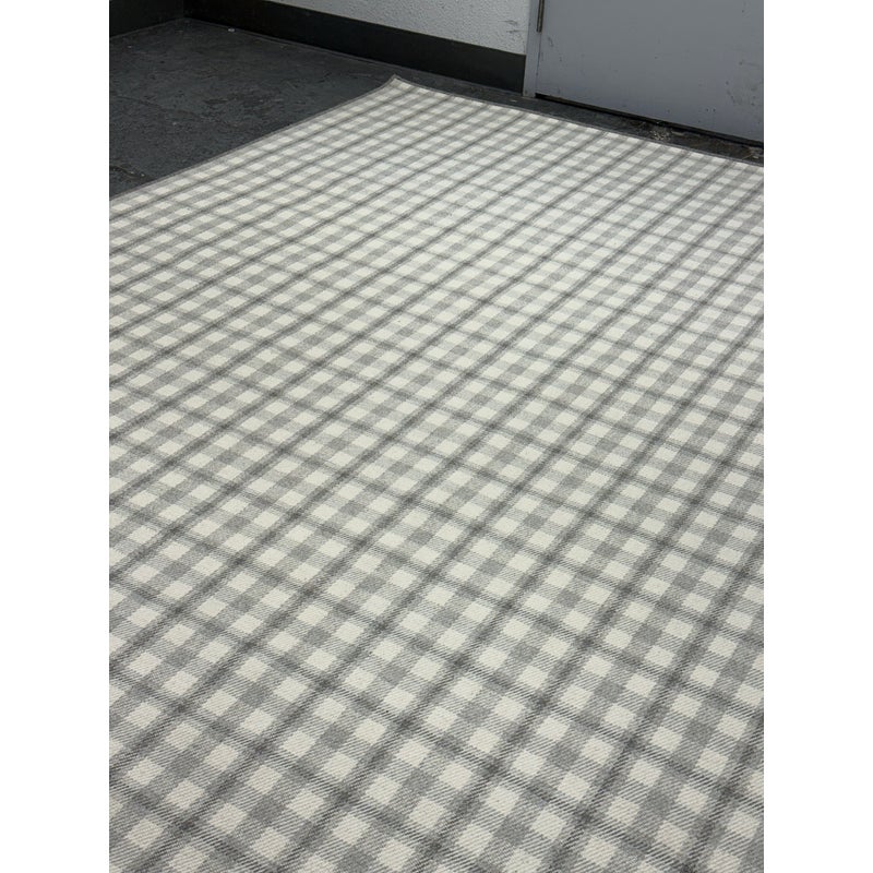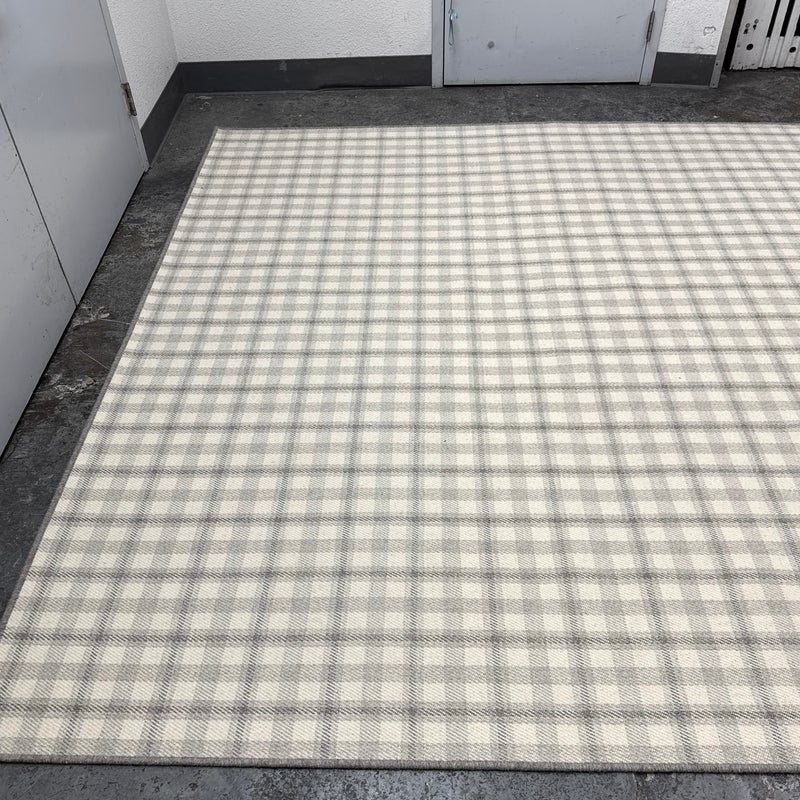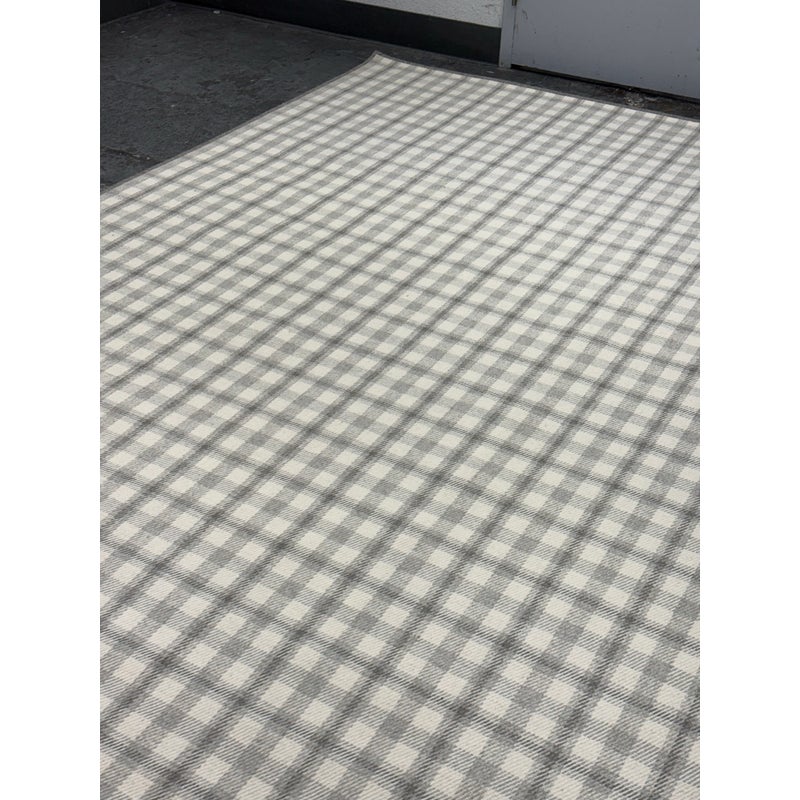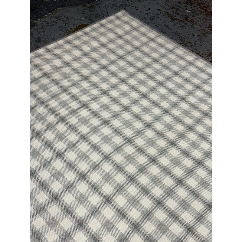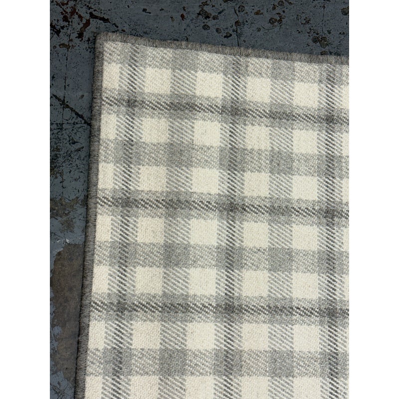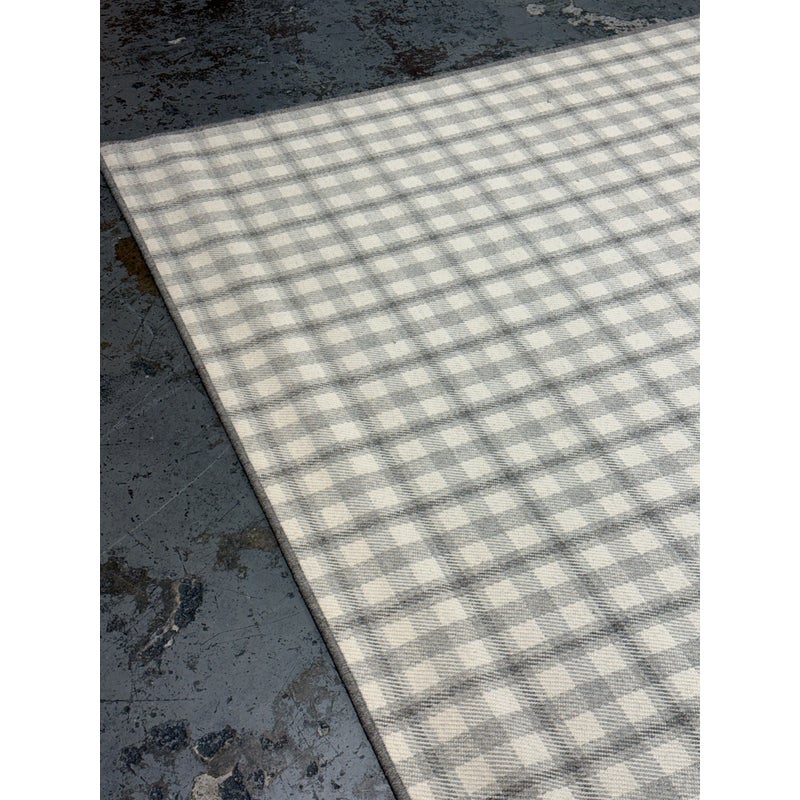 Design Plus Gallery presents a 9ft x 12ft 1in Hand Loom Area Rug from Fibreworks. The style of rug is from their Verden collection in their color way Summit Gray. The rug is a composition of wool with cloth backing and has a repeating plaid pattern. The rug is in good condition for its usage with minimal wear and tear to it. Made in the USA.