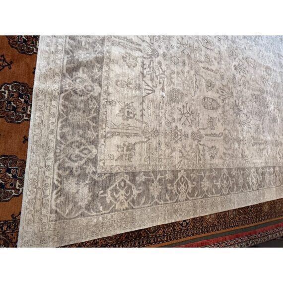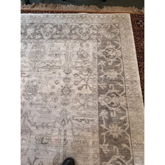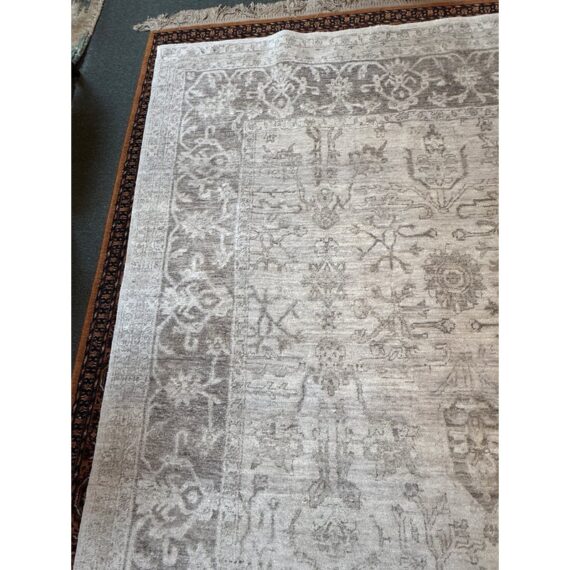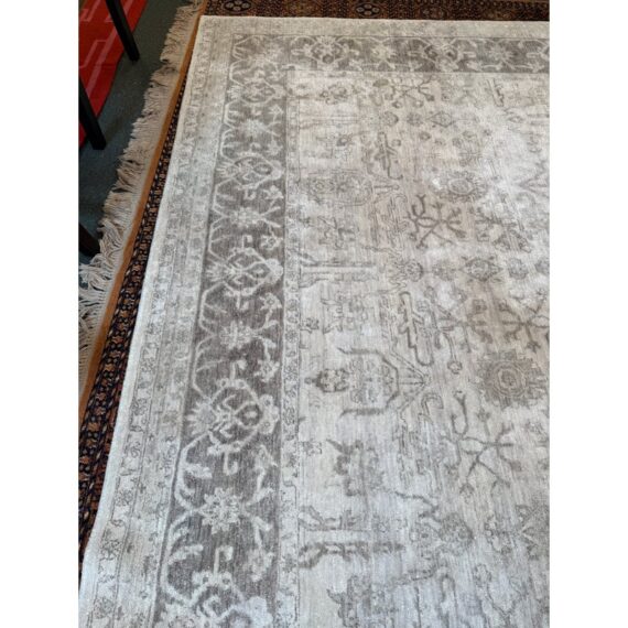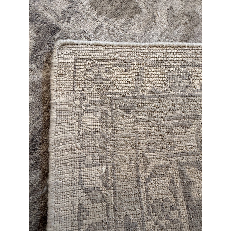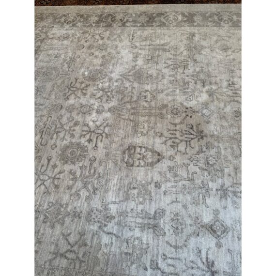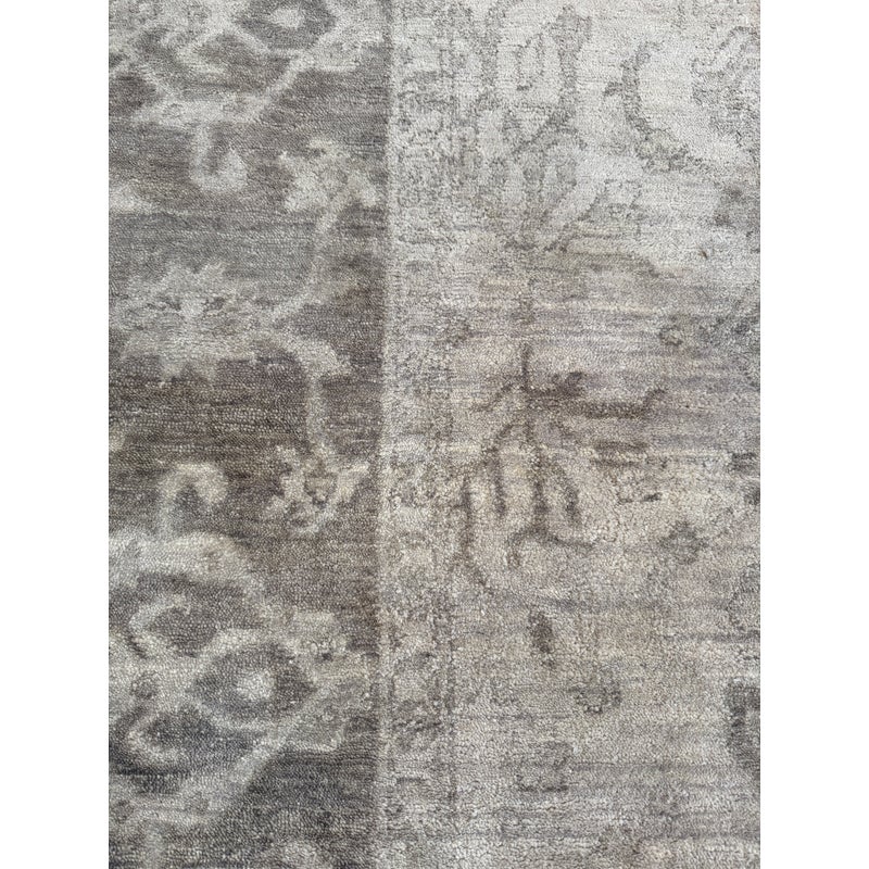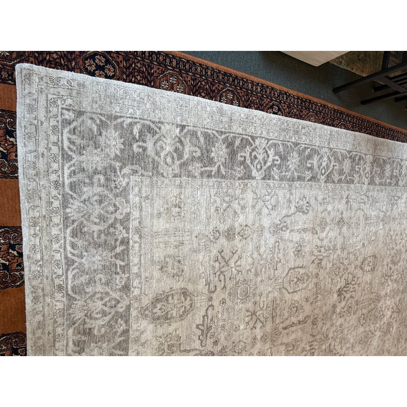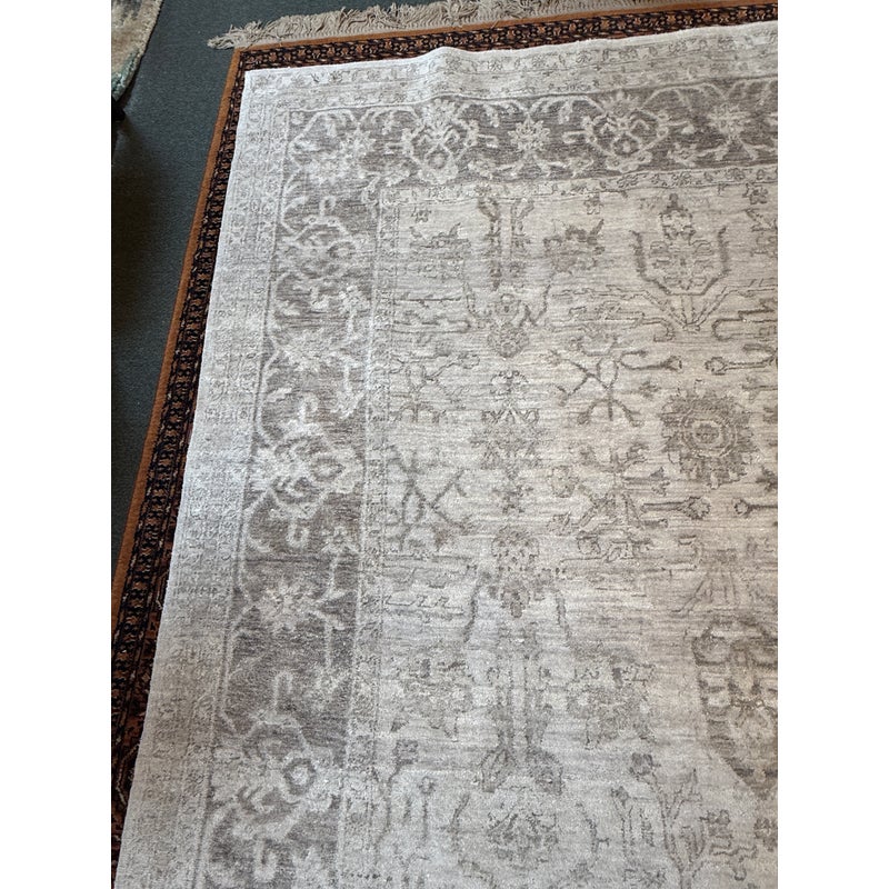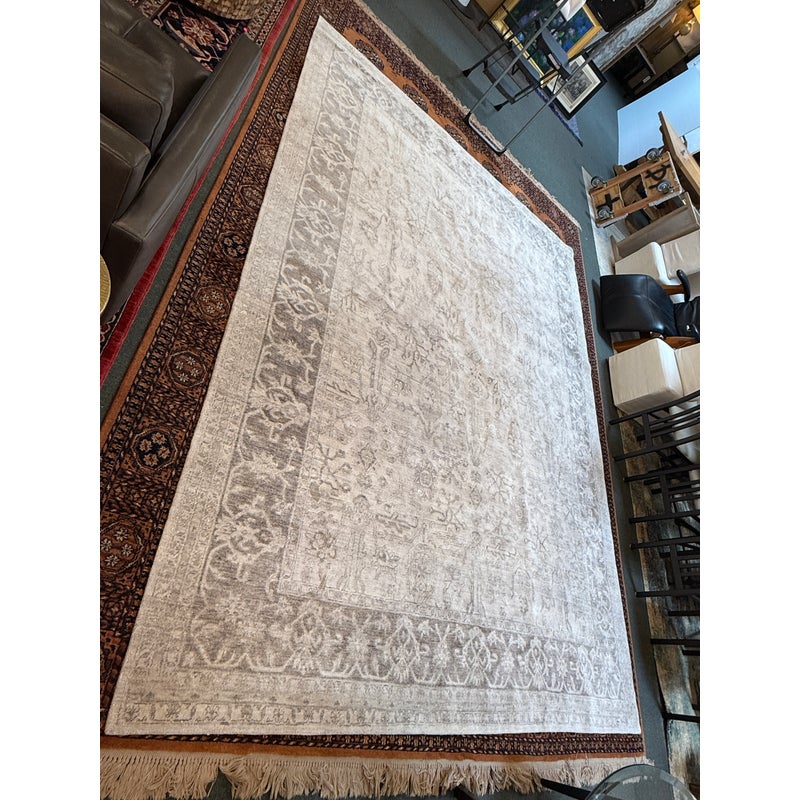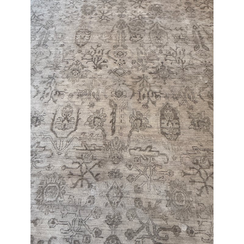 Design Plus Gallery present a 9ft x 12ft Papillon Area Rug by Restoration Hardware. The rug is made by meticulous hand-knitting techniques and is woven from the finest wool and hand-spun silk. It has antiqued in appearance floral borders and swaths of botanicals, creating a visually captivating and luxurious appearance. The rug’s dense, lush texture is achieved through the use of premium wool and silk, resulting in a tactile experience that is both inviting and sophisticated. The finished product is adorned with hand-bound edges and fringe, adding elegance and refinement. Visible surface wear; condition is consistent with age and use.