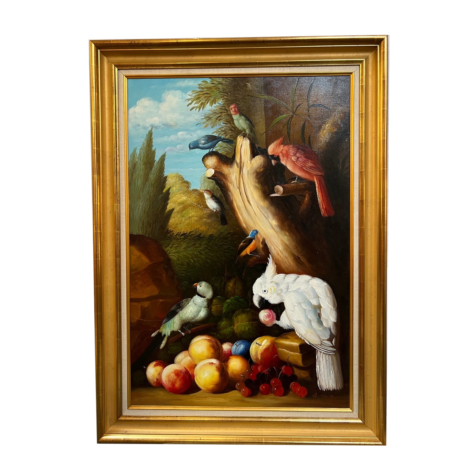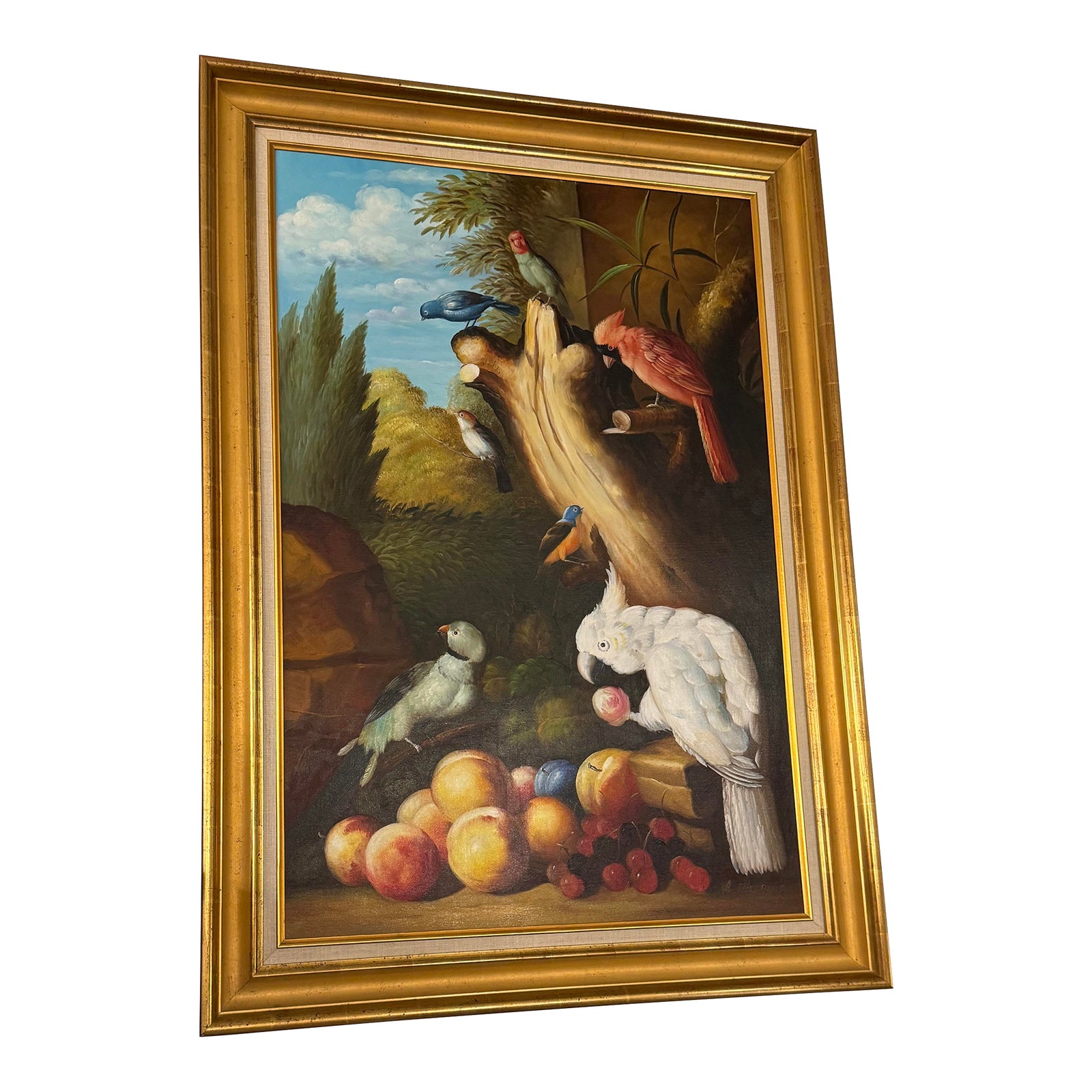 Design Plus Gallery presents a Large Framed Still Life of Parrots with Fruit, signed by A. Herbert. The whimsical tableau is alive with color and movement. A group of seven feathered friends gather for a feast of luscious delights with a forested background. Professionally matted in linen and framed in gilt finished beveled wood. Light surface wear; condition is good for age and use.